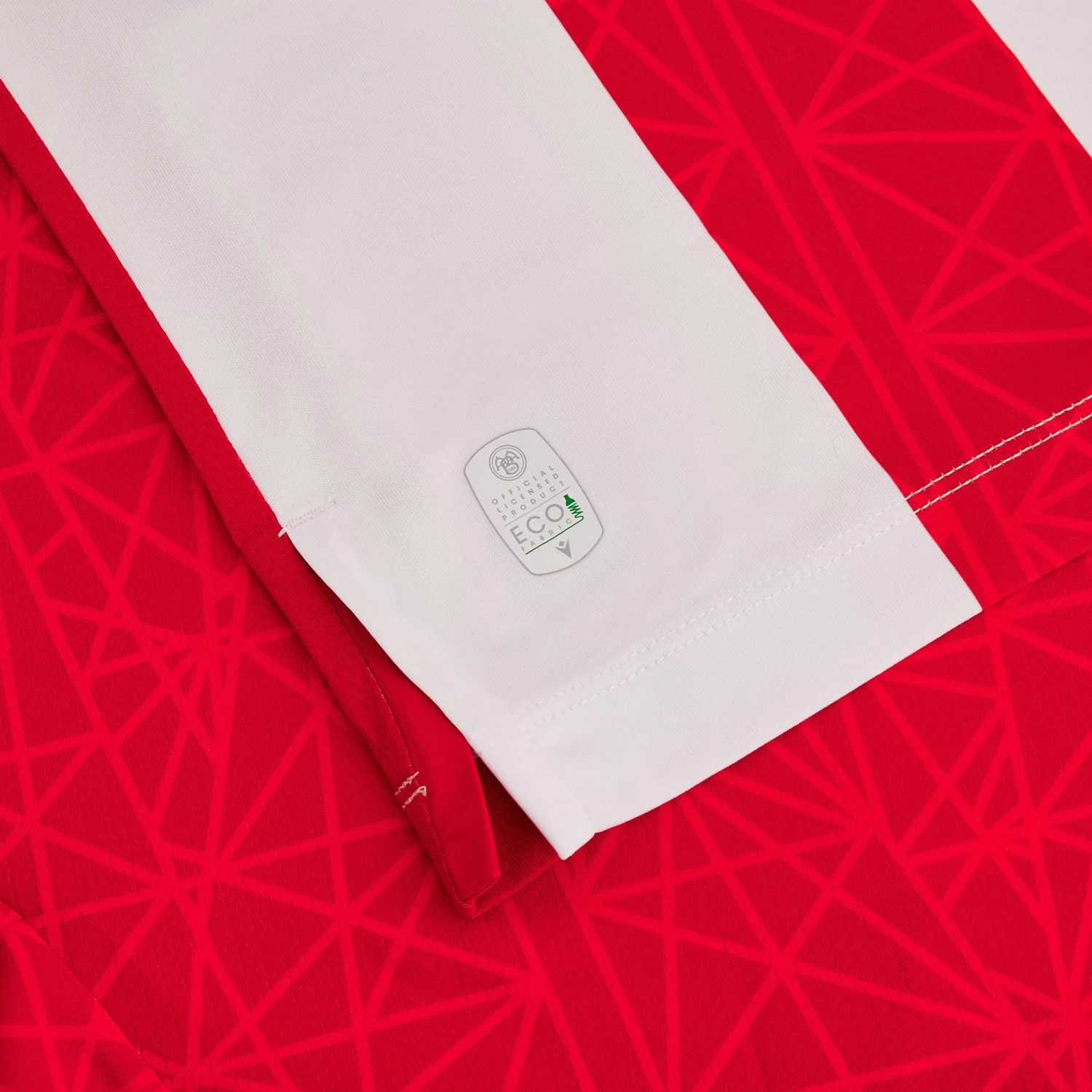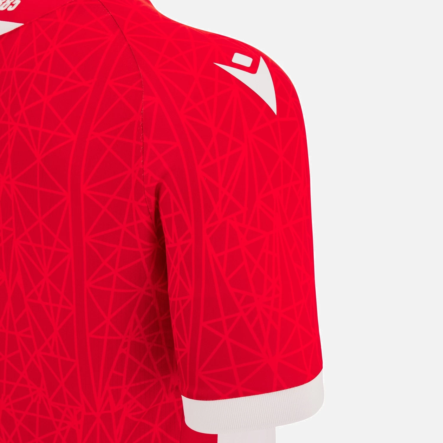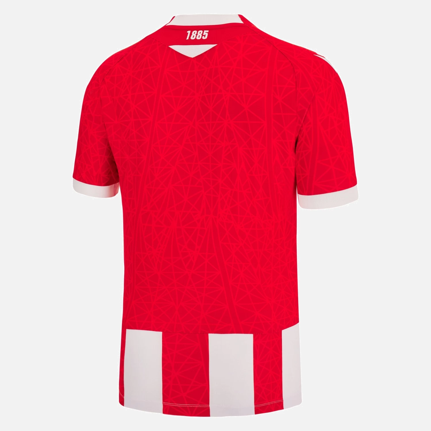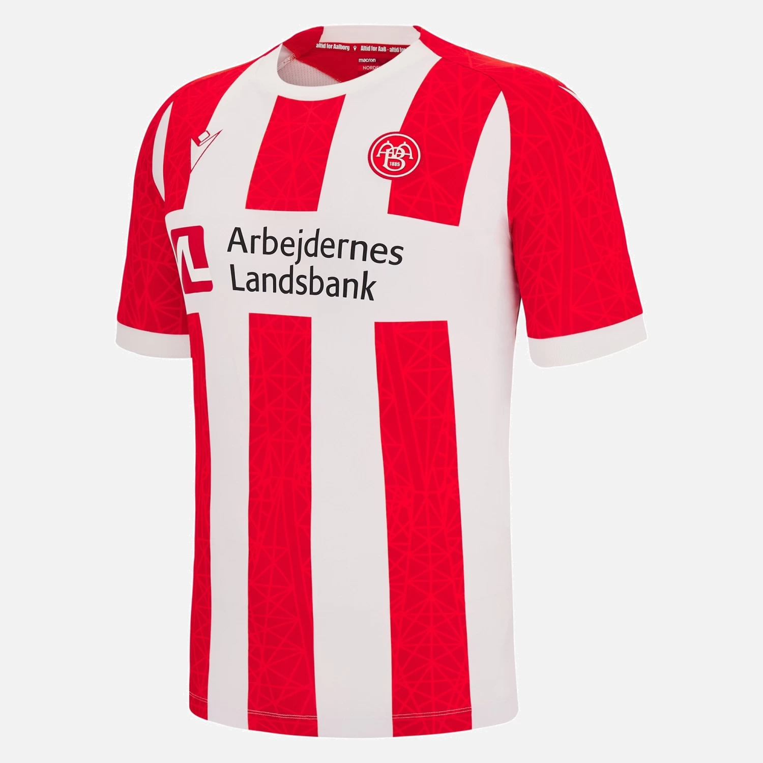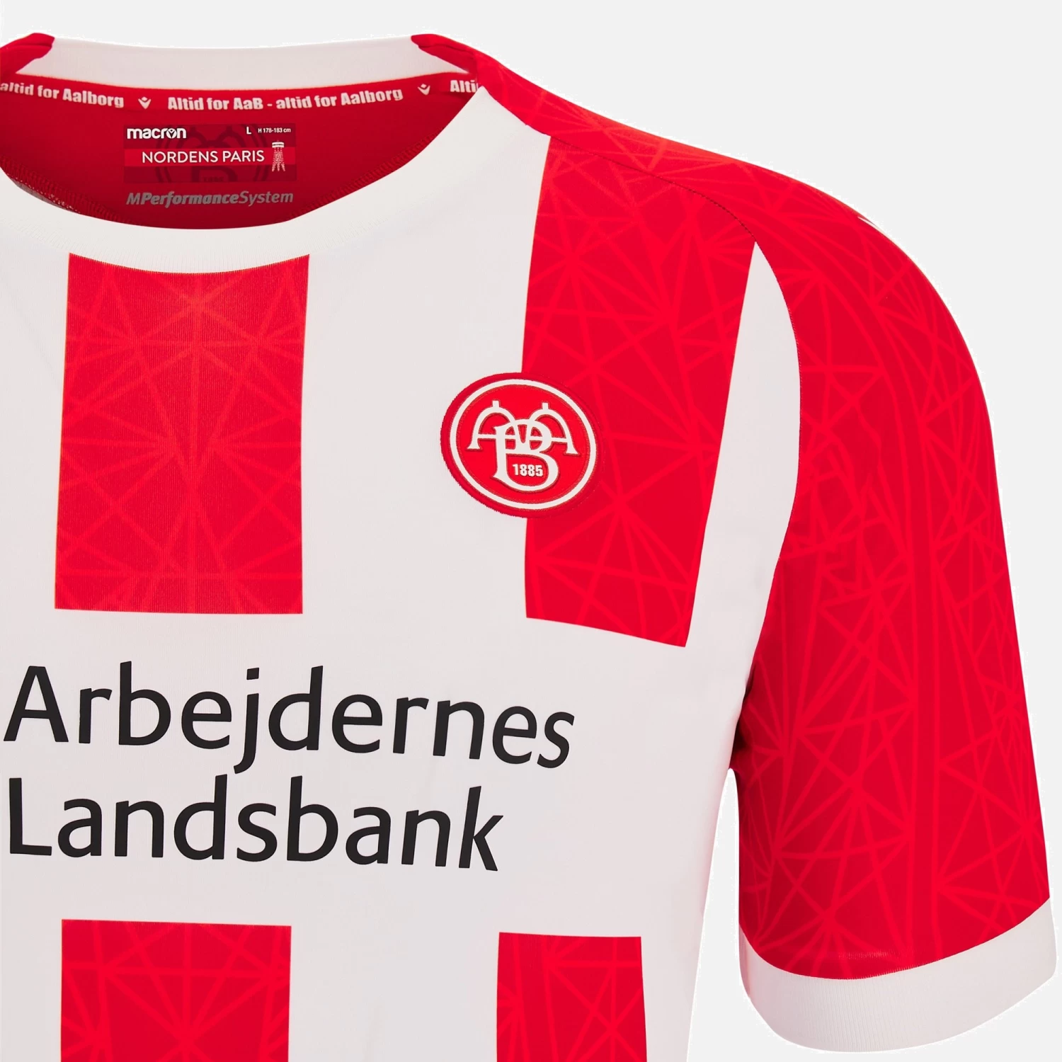 The new Aalborg BK 2022/23 home match jersey, respect the team’s traditional colours, features a dye-sub printed graphic representig the steel structure of the Aalborg Tower. A red backneck label is customised with the team’s logo and the words “NORDENS PARIS” (Paris of the North), with an image of the Aalborg Tower alongside. A sweatband inside the neck carries the motto “Altid for AaB – altid for Aalborg” (Always for AaB – Always for Aalborg). The year in which the club was formed, 1885, appears at the back of the neck.