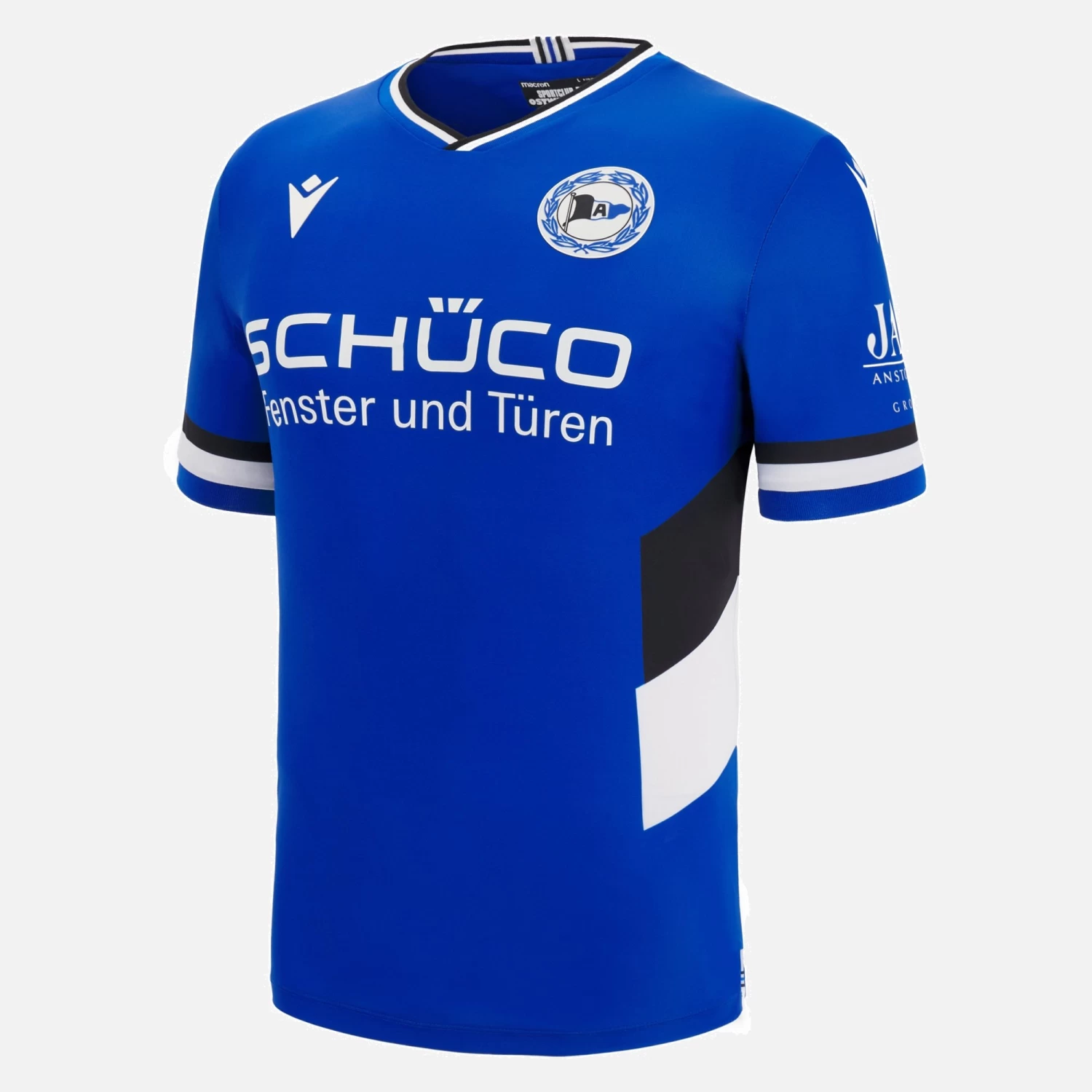 2 diagonal black and white stripes characterise the new Arminia Bielefeld 2022/23 home jersey, a simple, dynamic design produced in the club’s colours. At the shirt hem is a small tricolor knit fabric insert. The date 1905 is embossed on the back. A shirt to be worn with pride!