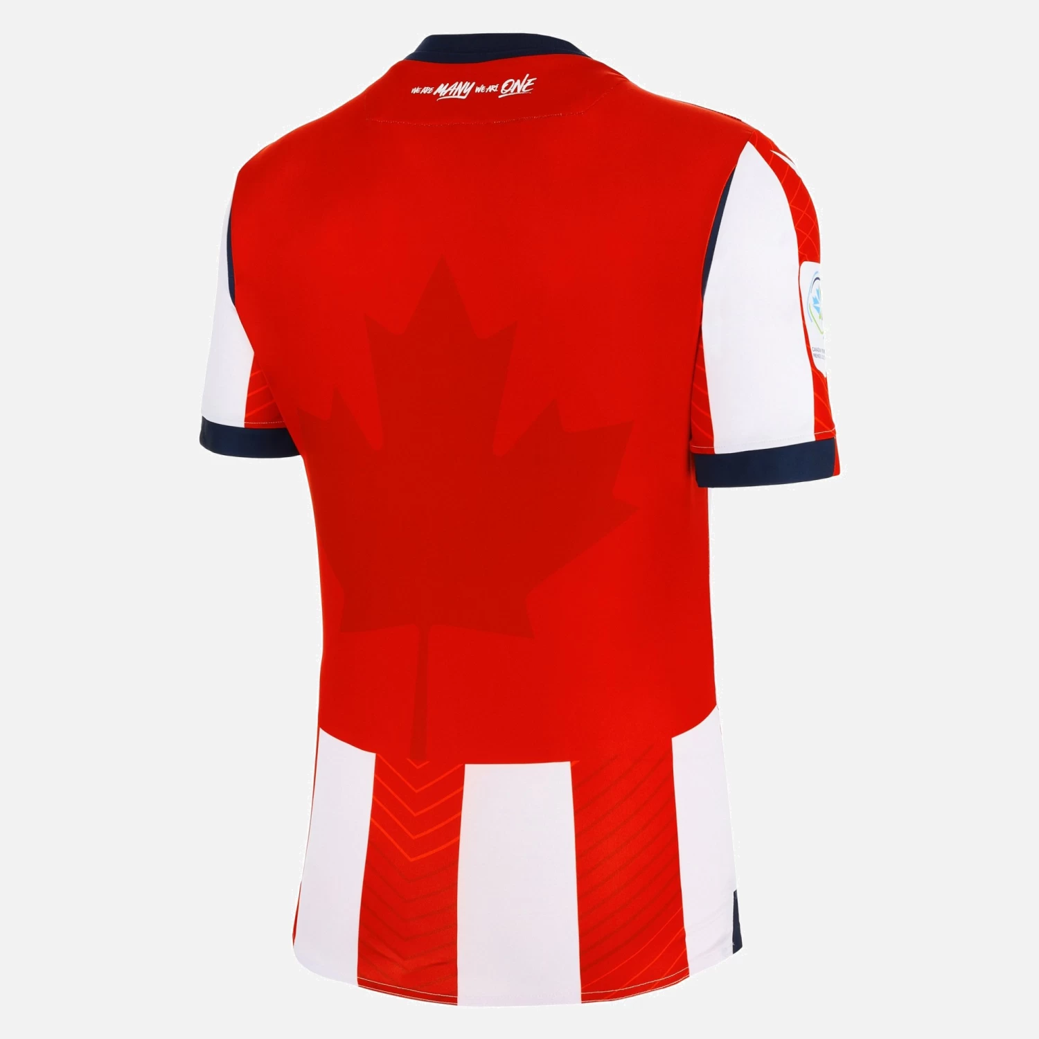 The Atletico Ottawa 2022/23 away shirt draws its inspiration from the Rideau Canal Locks, the system of canals that symbolises the Canadian capital and UNESCO World Heritage Site. The V-pattern of the red stripes on the front in fact recall the canal locks opening and closing, synonymous with the way Canadians are open to the world, while containing the community safely within. The maple leaf on the back is another symbol of the Canadian identity. The various blue details dotted all over the collar, cuffs and slits add a touch of style.