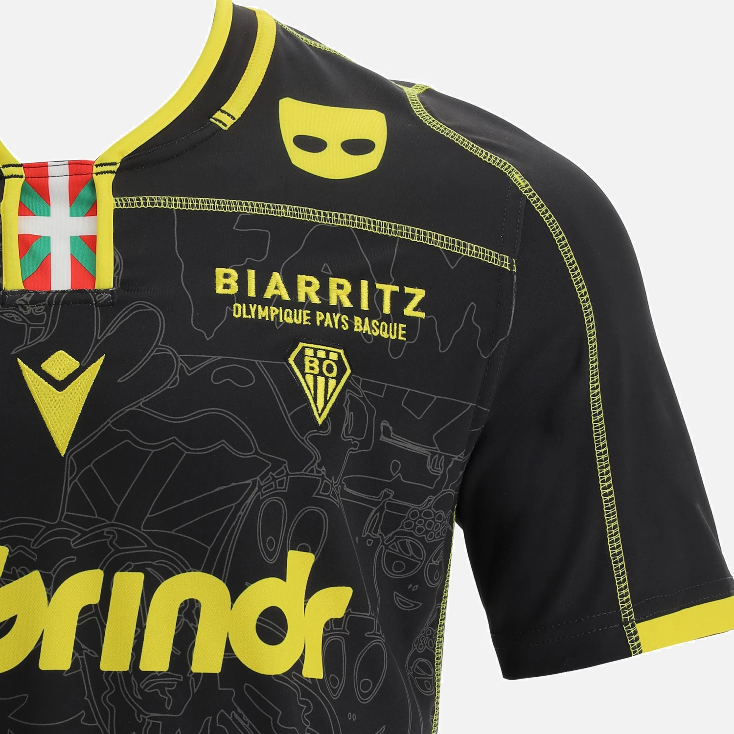 The new Biarritz FC 2021/22 away jersey stands out thanks to its sophisticated and elaborate graphic design. Black with yellow detailing, the shirt is embellished with the club name and crest embroidered on the chest. The wording ‘Saison 2021-2022’ stands out in yellow on the bottom left of the jersey.