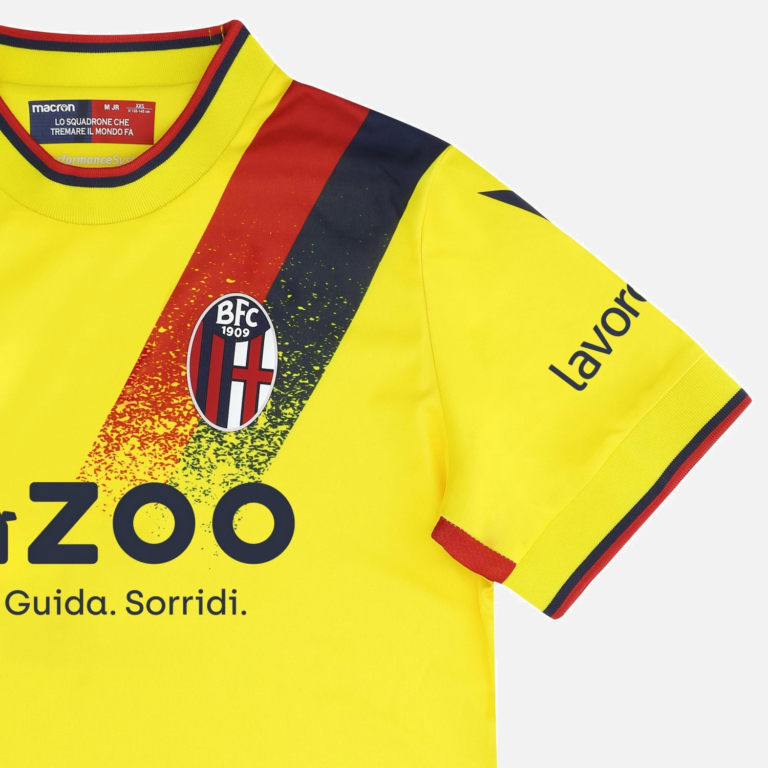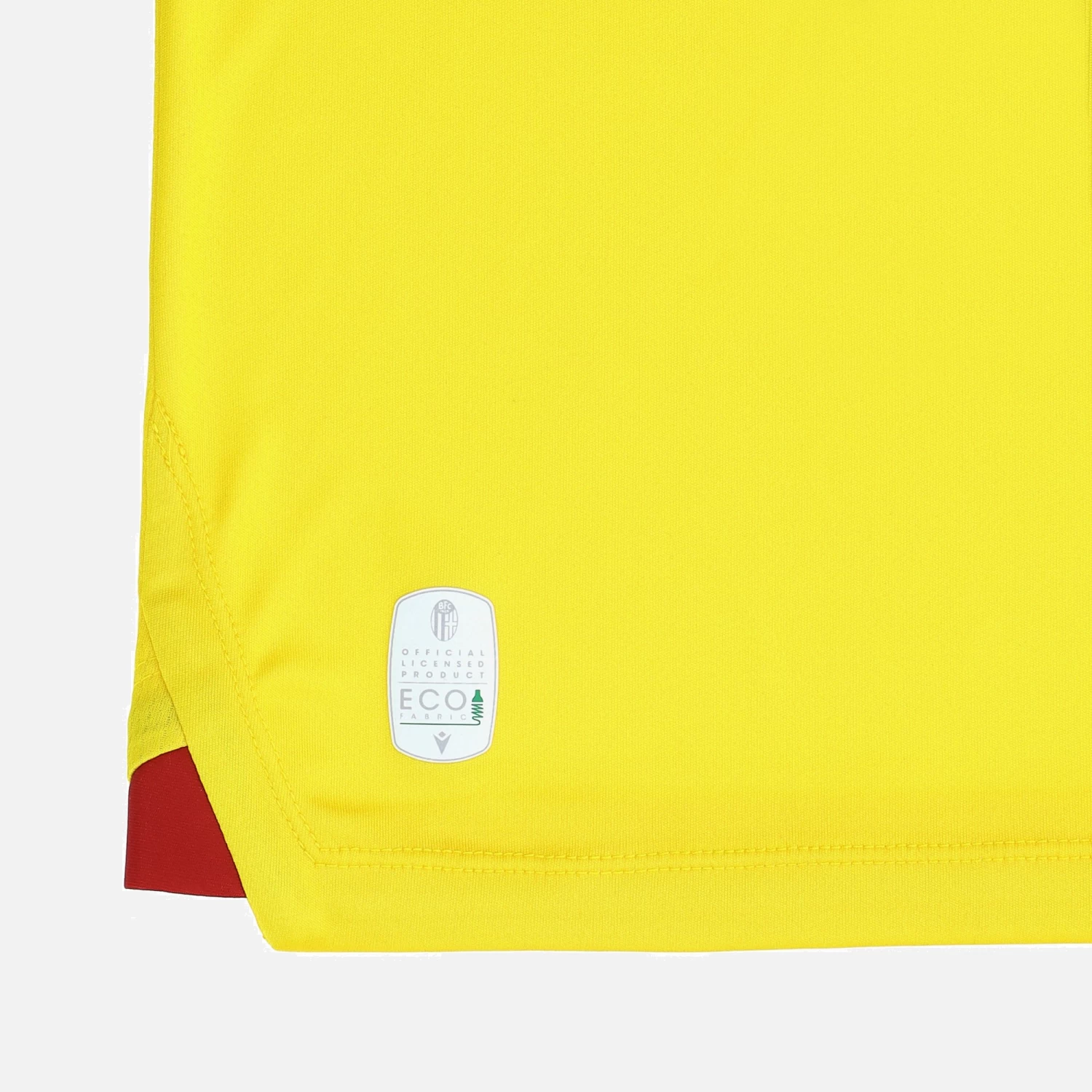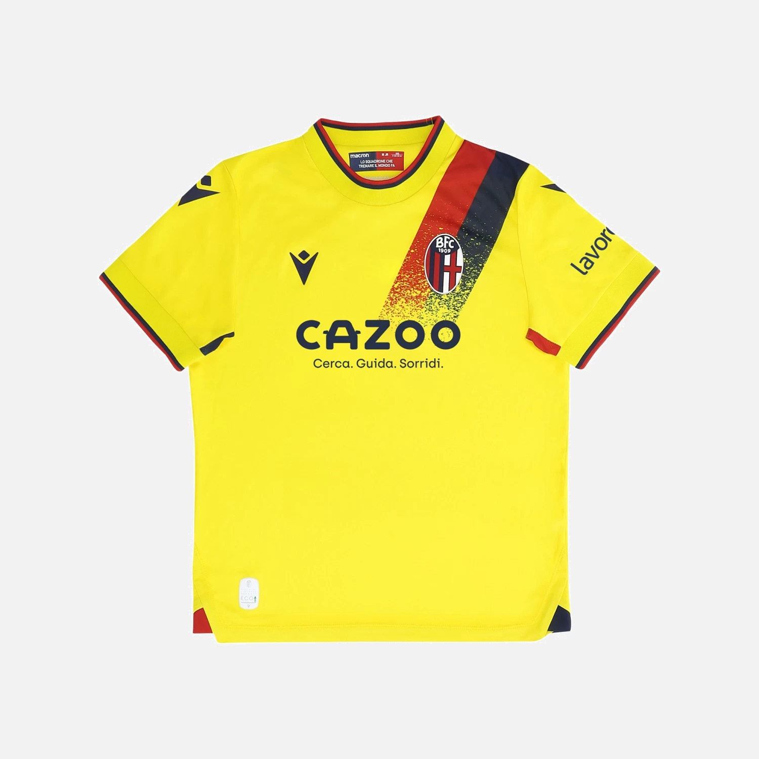 Bologna FC 2021/23 adults’ third match jersey. Graphics based on a red and blue diagonal stripe with aerograph-effect shading. Yellow with blue and red details. Shield badge over the heart. “We are one” in blue on the back just under the collar. Add the shorts and socks for a complete 2021/23 third game kit!