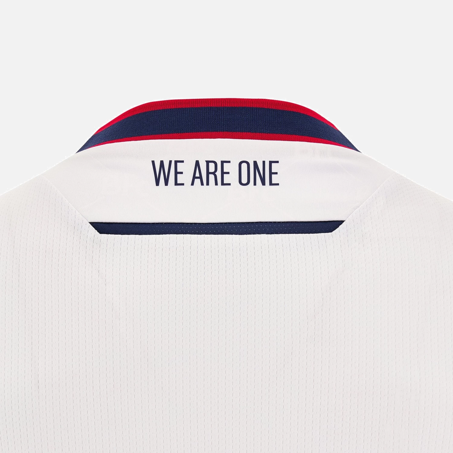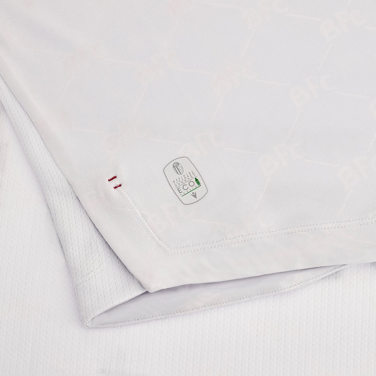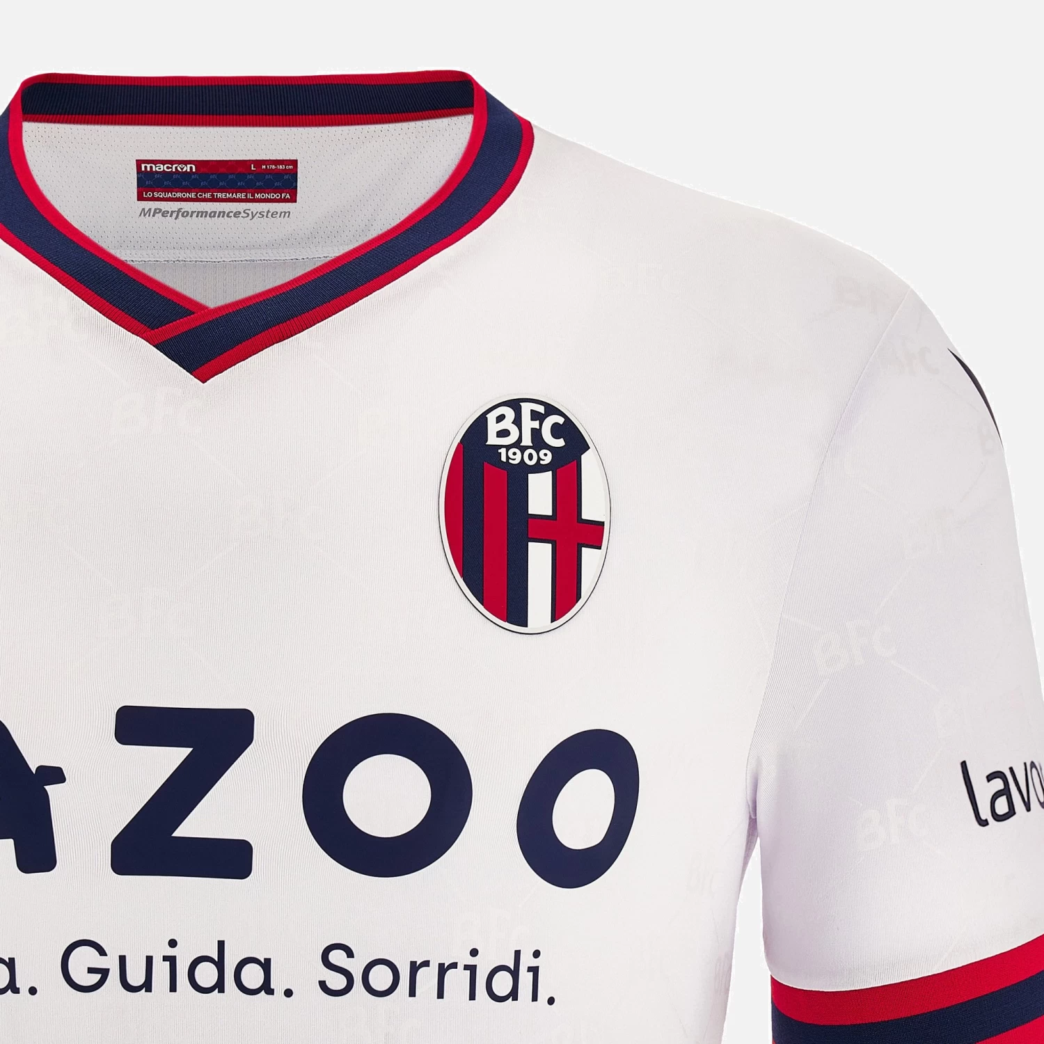The new Bologna FC 2022/23 away jersey proposes a trendy all-over geometric pattern on the front and sleeves with a jacquard effect weave. The collar and sleeves in the traditional red and blue colours contrast with the white coloured main body of the shirt. The back of the collar is hot-stamped with the motto WE ARE ONE.
