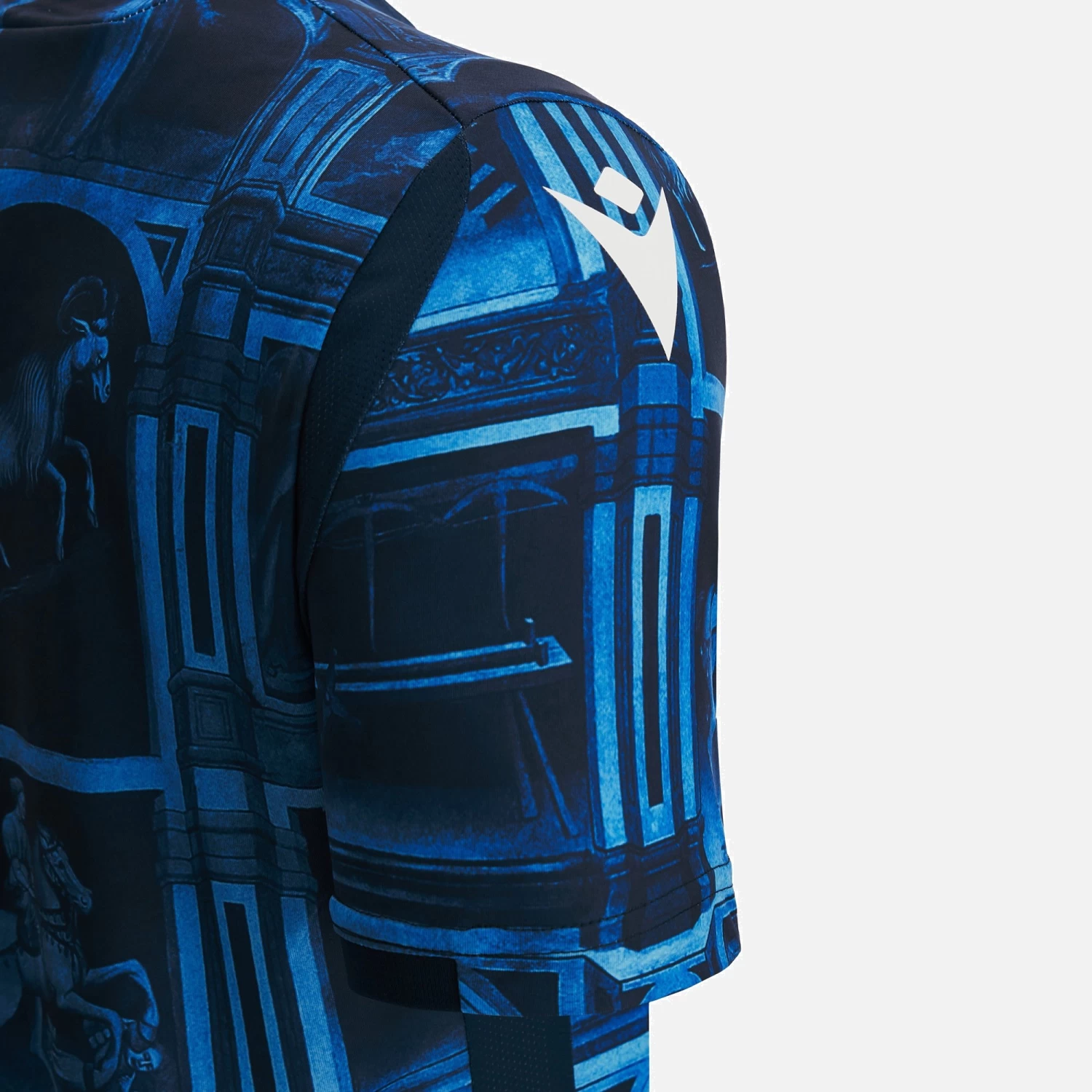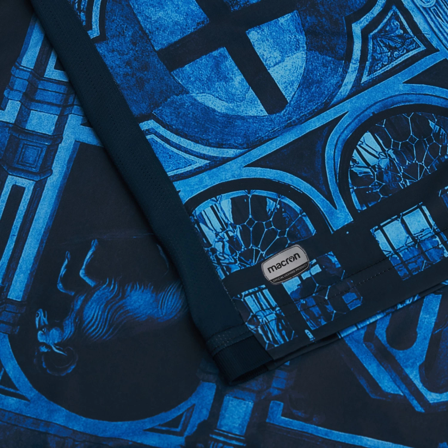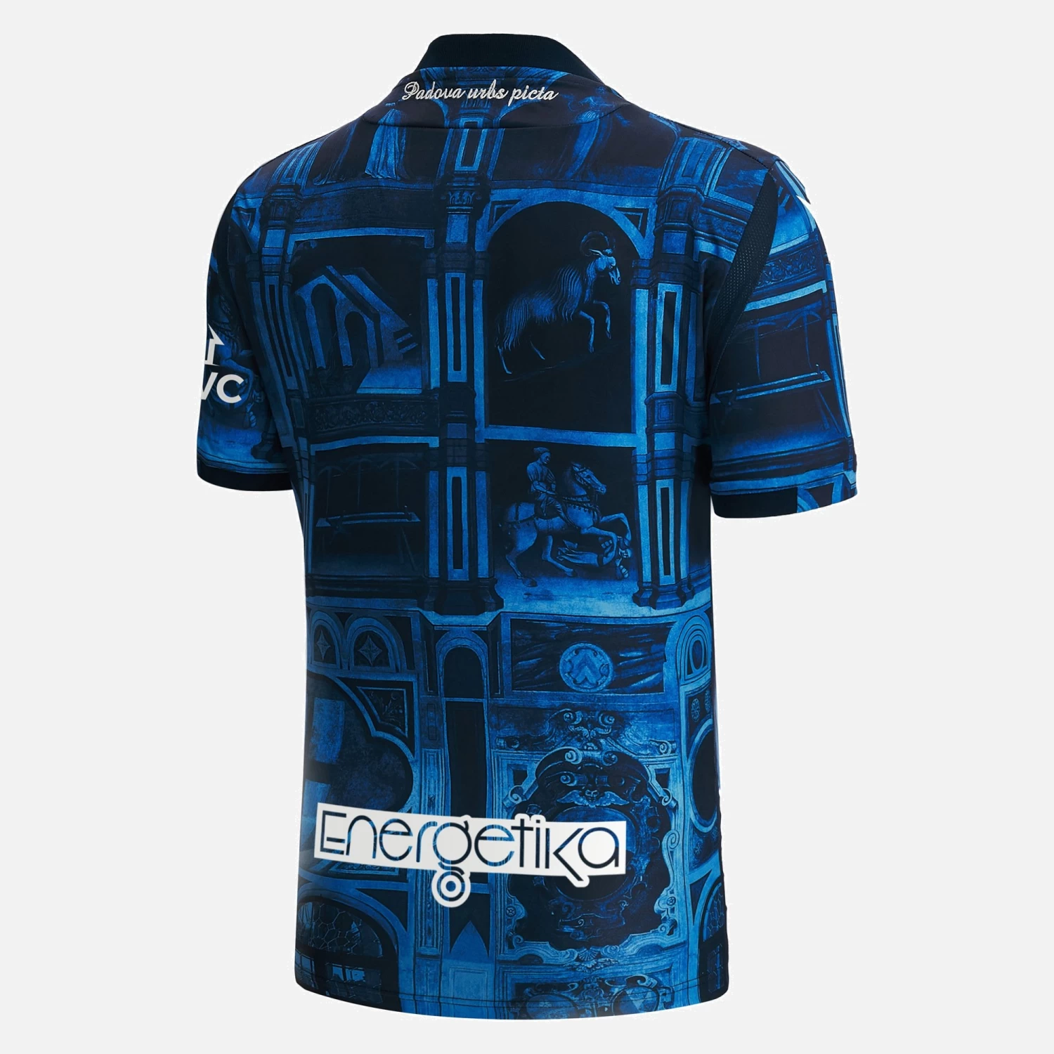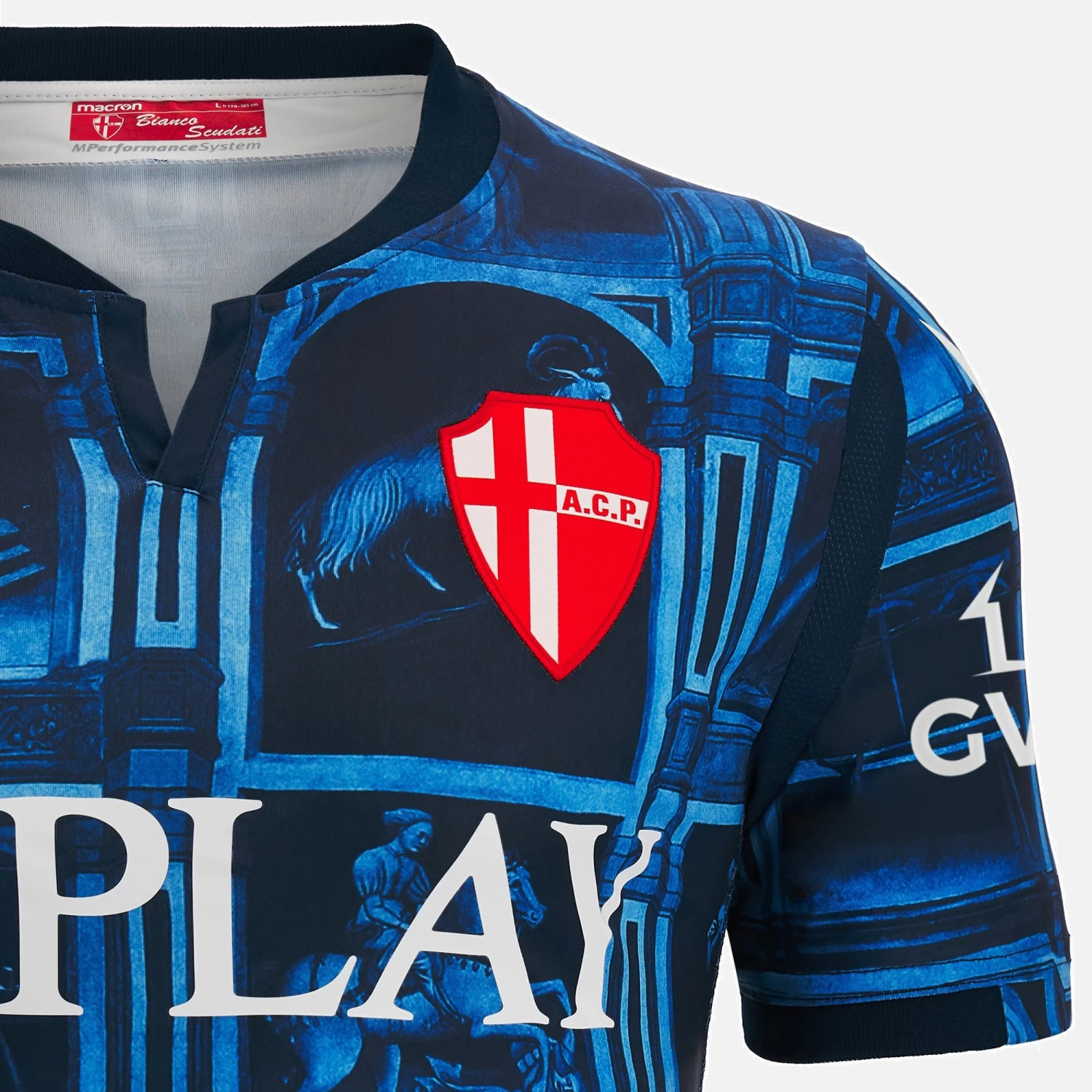 The Calcio Padova 2022/23 third match jersey is eclectic and eye-catching, with a dye-sub all-over blue pattern, a design intended to be a tribute to the important monument of Palazzo della Ragione, the medieval market hall made a Unesco World Heritage Site last year. The back of the collar features the Latin phrase PADOVA URBS PICTA, meaning Padua the painted city. The distinctive design of the collar, with a central notch, is another stylish detail.
