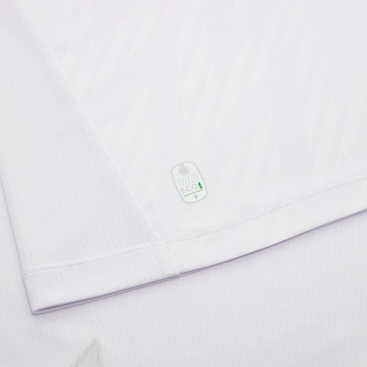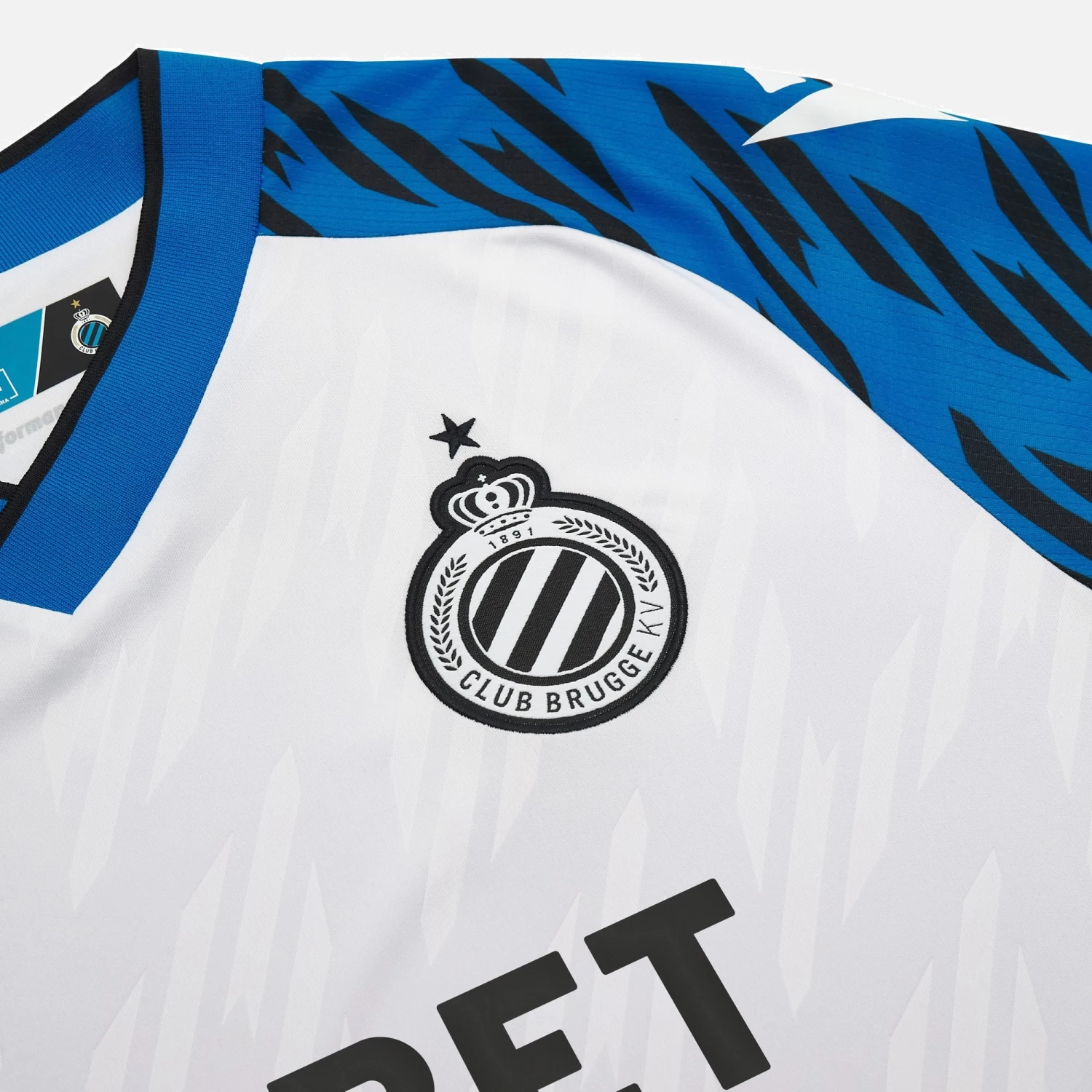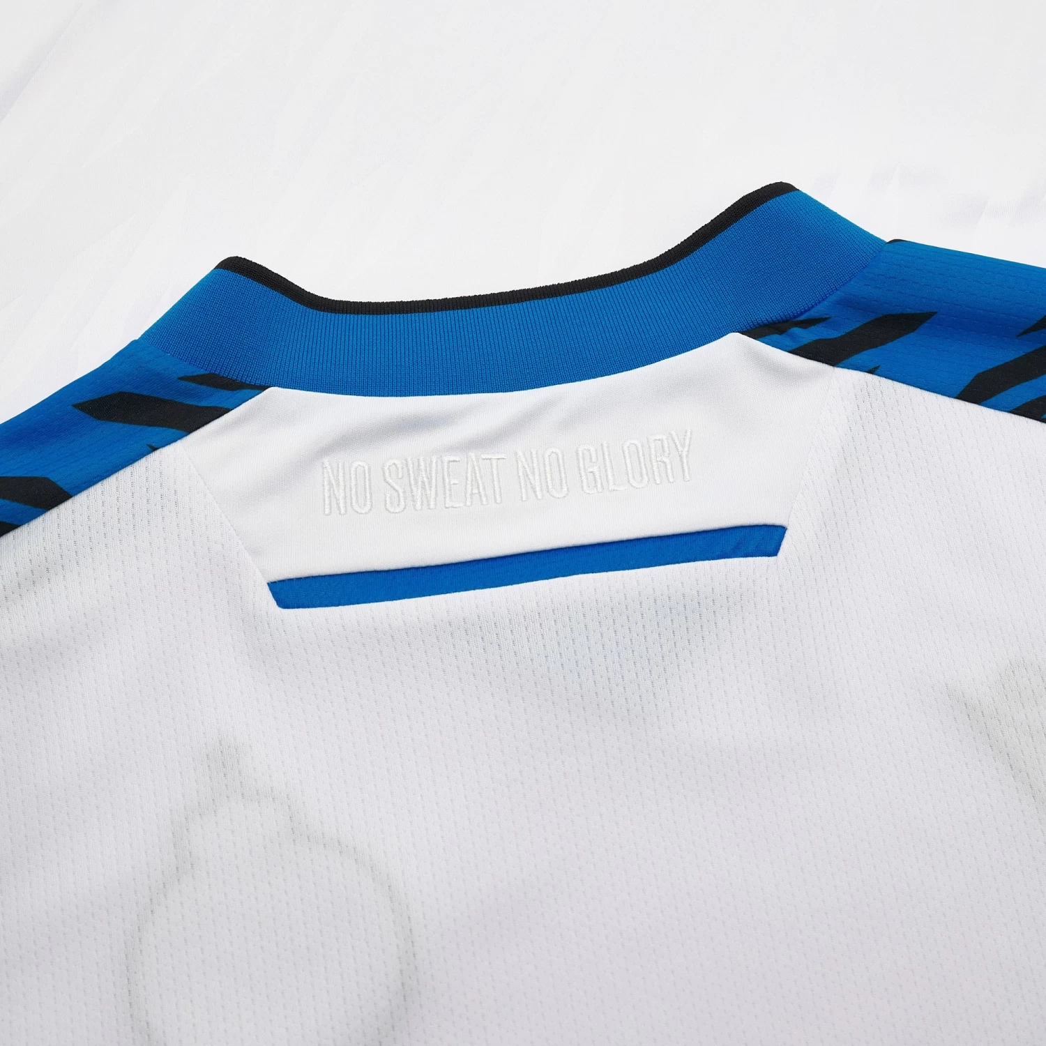 The pattern on the Club Brugge 2023/24 season away shirt is distinguished by a particular embossed linear movement all across the front. The torso has a white background, while the shoulders feature the team’s traditional blue hue. The garment has an elegant V-neck collar and the back of the collar is customised with the embroidered wording ‘No Sweat No Glory’. Unwavering breathability is guaranteed by additional eco mesh inserts.