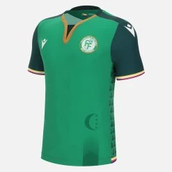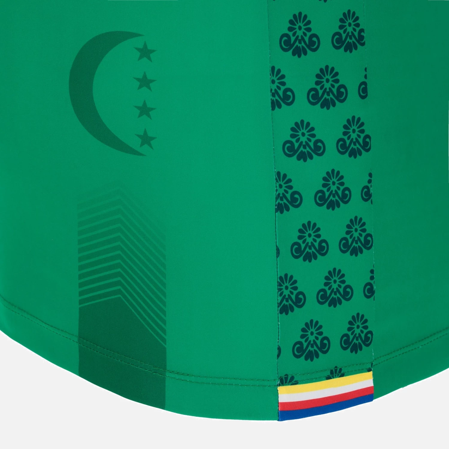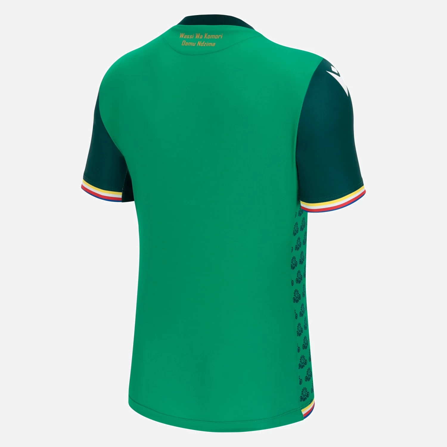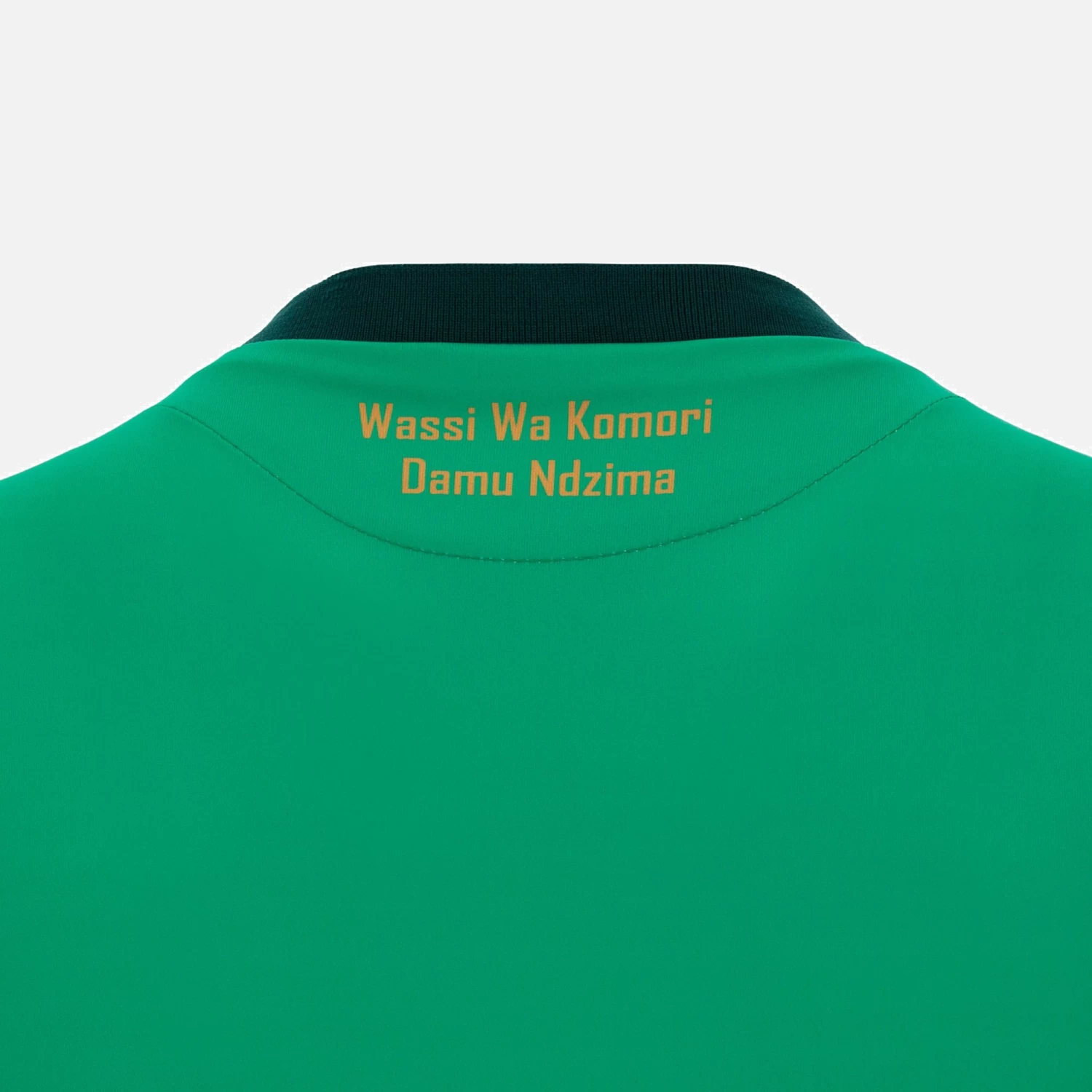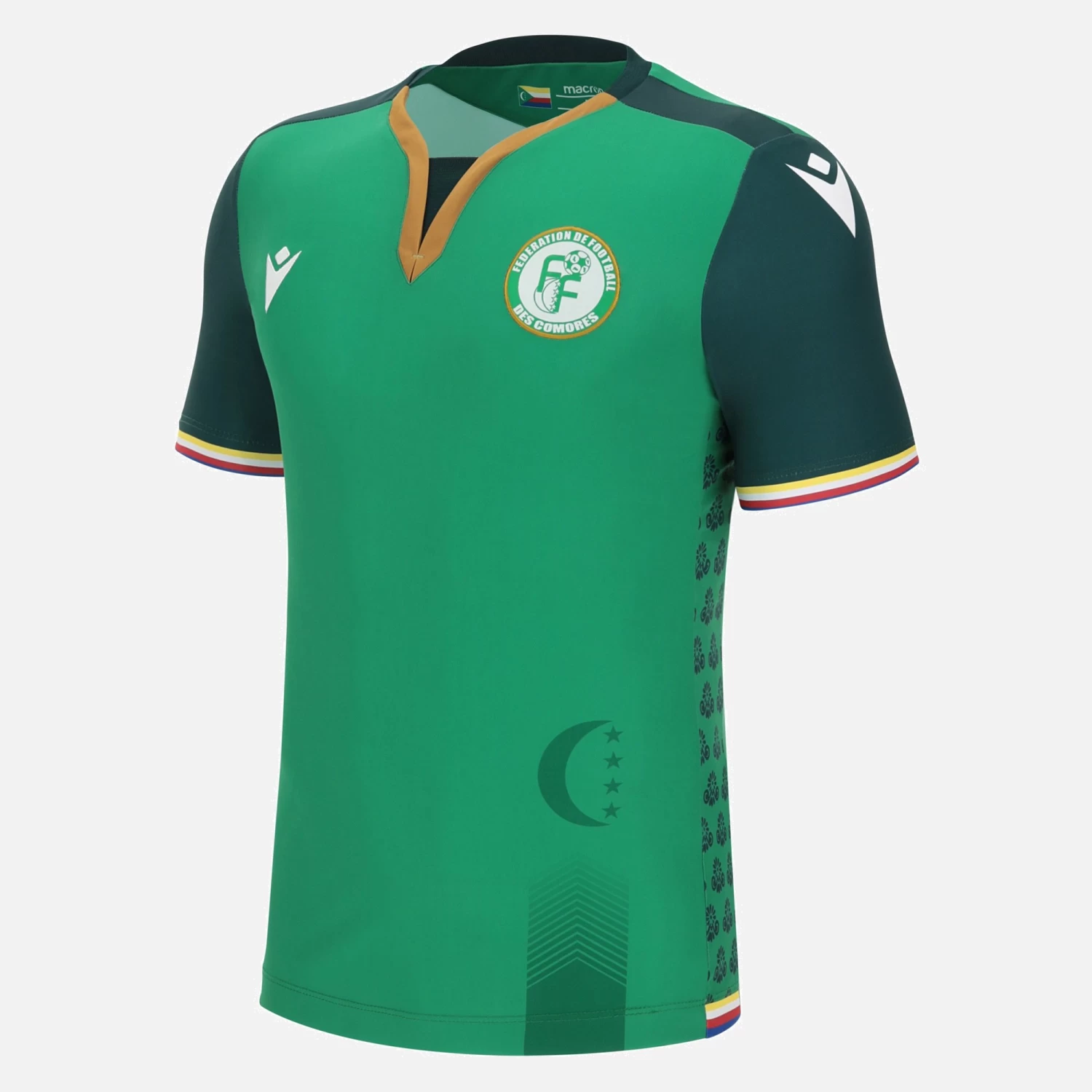 Buy the customised home shirt of the Comoros National football team. The model will be used for all 2022 competitions. The design represents both national symbols – the moon and the stars – and traditional national fabrics on the sides of the jersey. The shield badge features in gold embroidery. The shirt is bright green in colour.