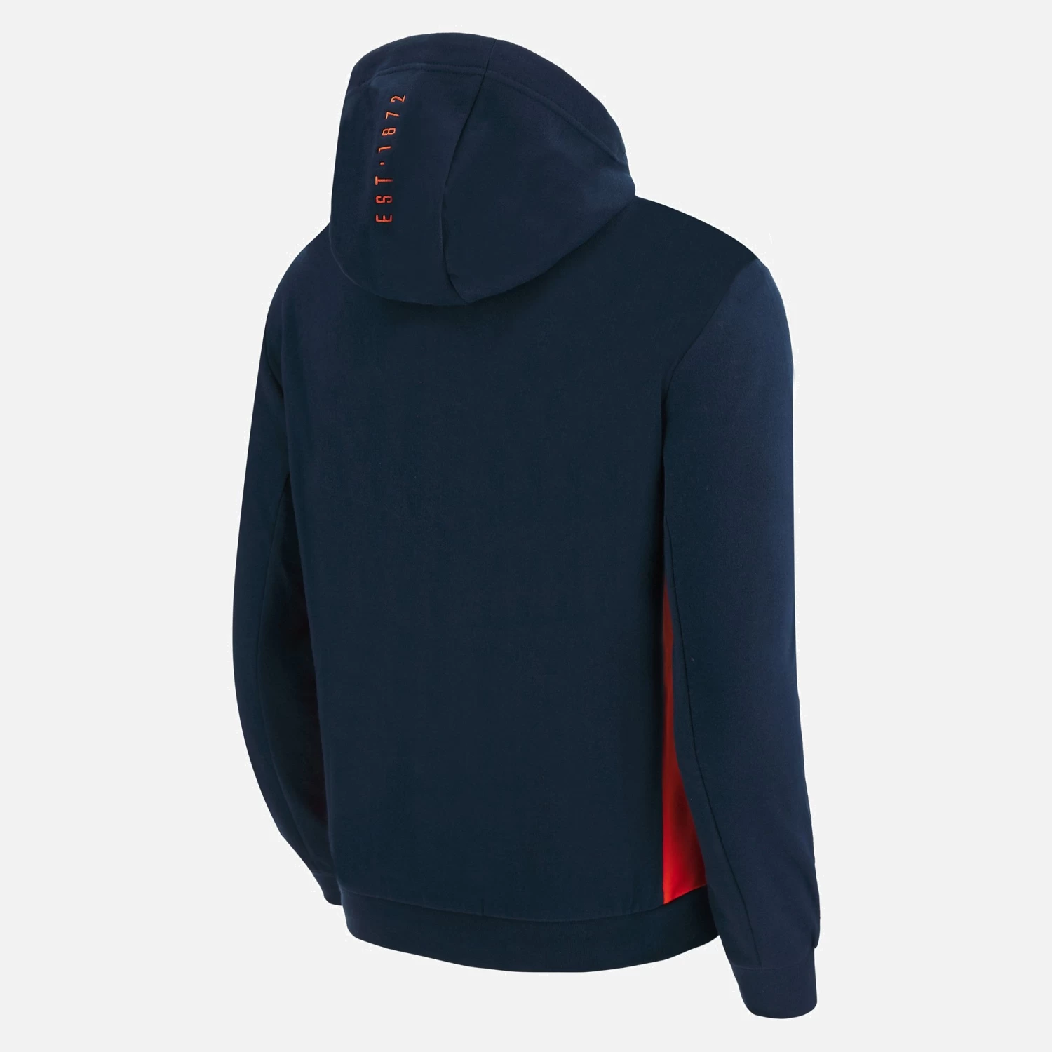 Navy kangaroo pouch hoody with orange panels on the flanks and embroidered club logo.