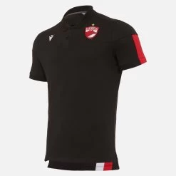 Travel polo shirt in black, red and white polyester cotton with knit details and club name embroidered vertically on the back.