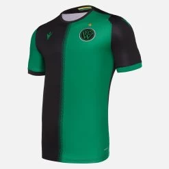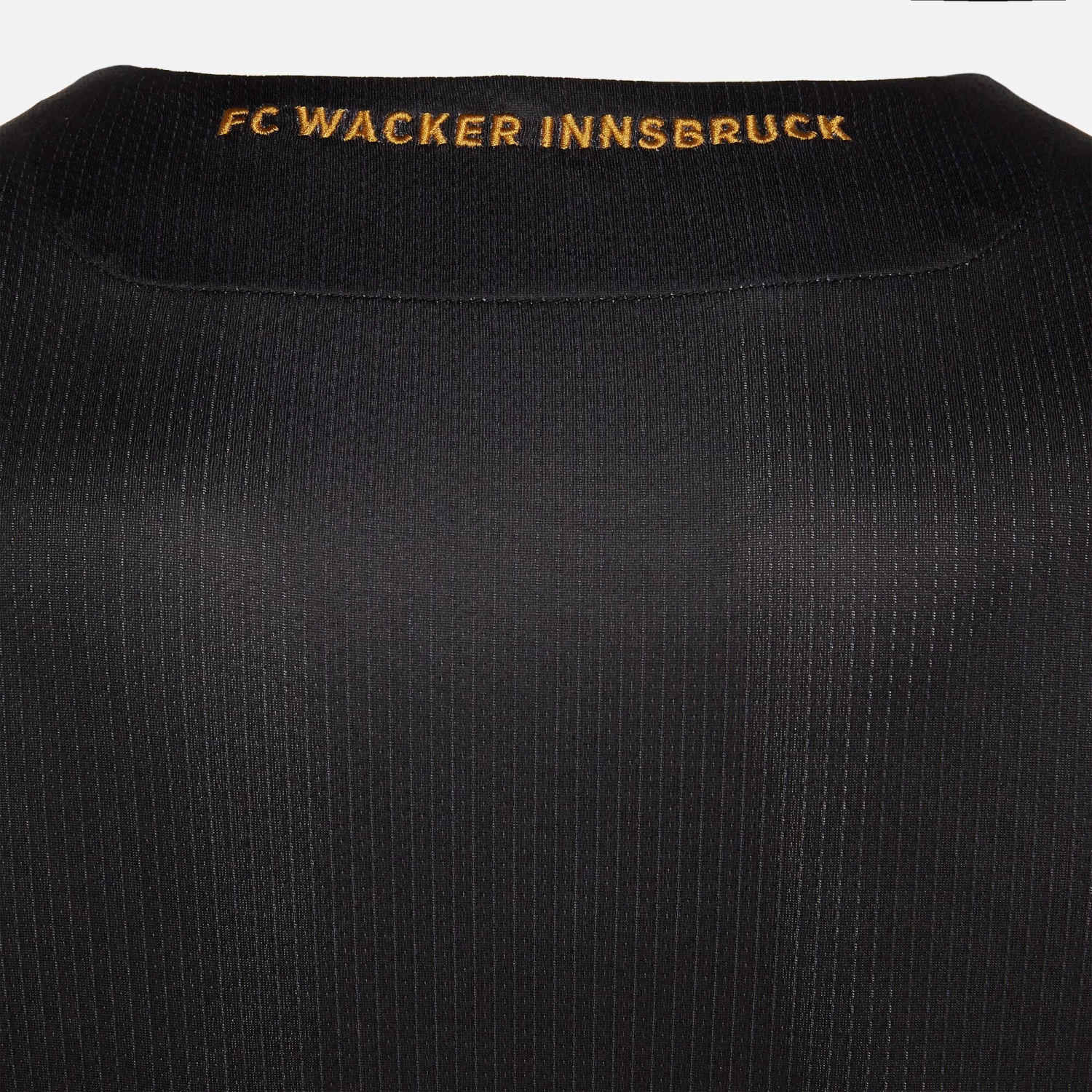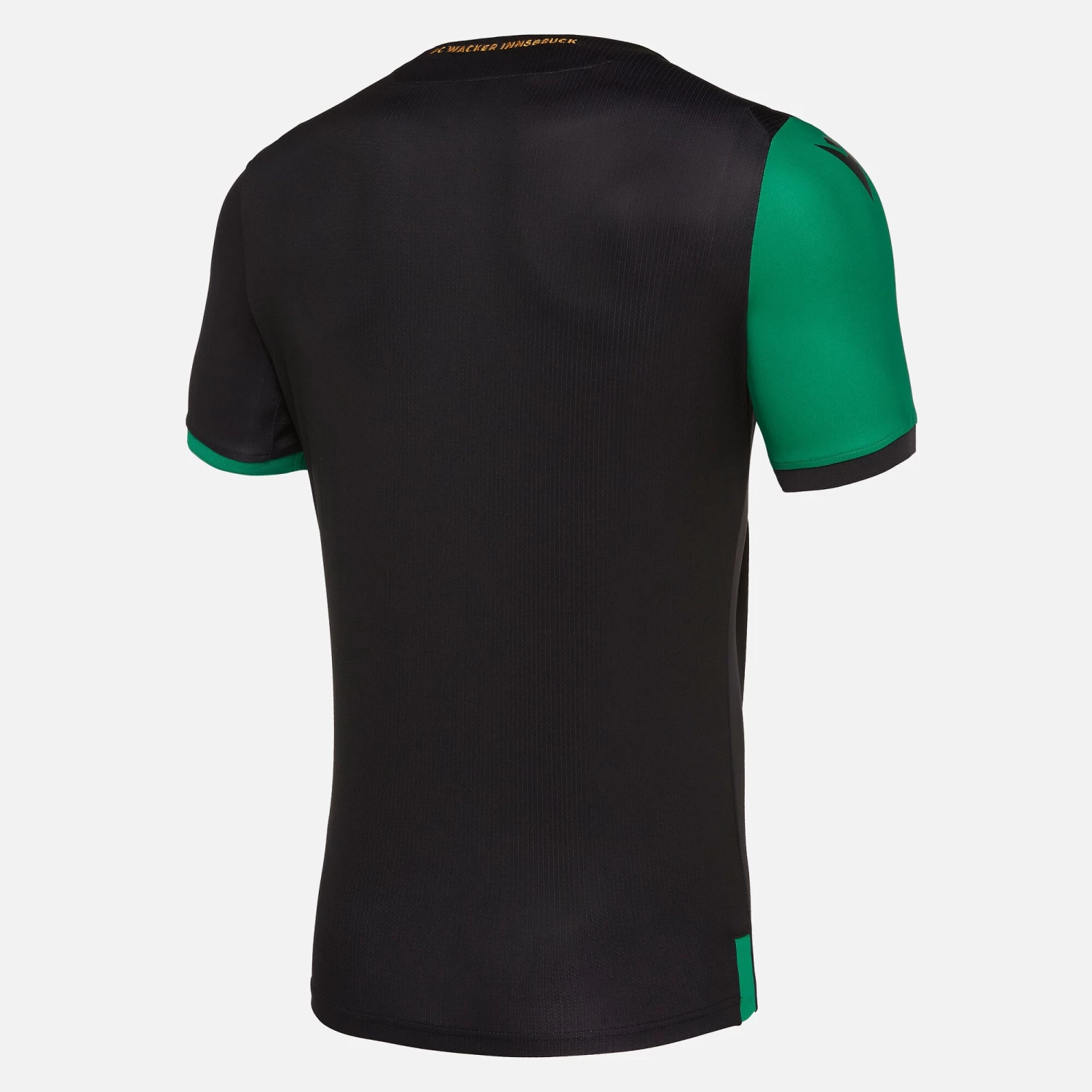 The FC Wacker Innsbruck home shirt is bold and eye-catching, and is split at the front into two halves, one green and one black. The same reversed colours feature on the sleeves. The back of the neck is complemented by the embroidered golden club name. The shirt features a crew neck. Slim fit.