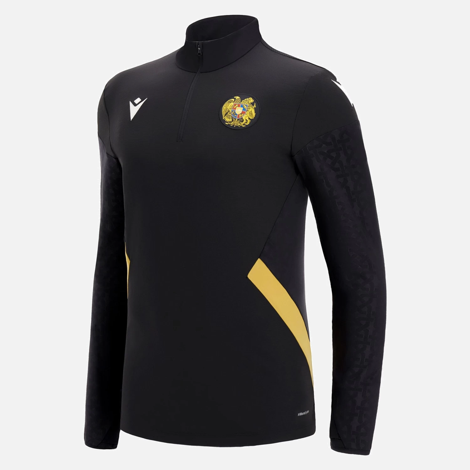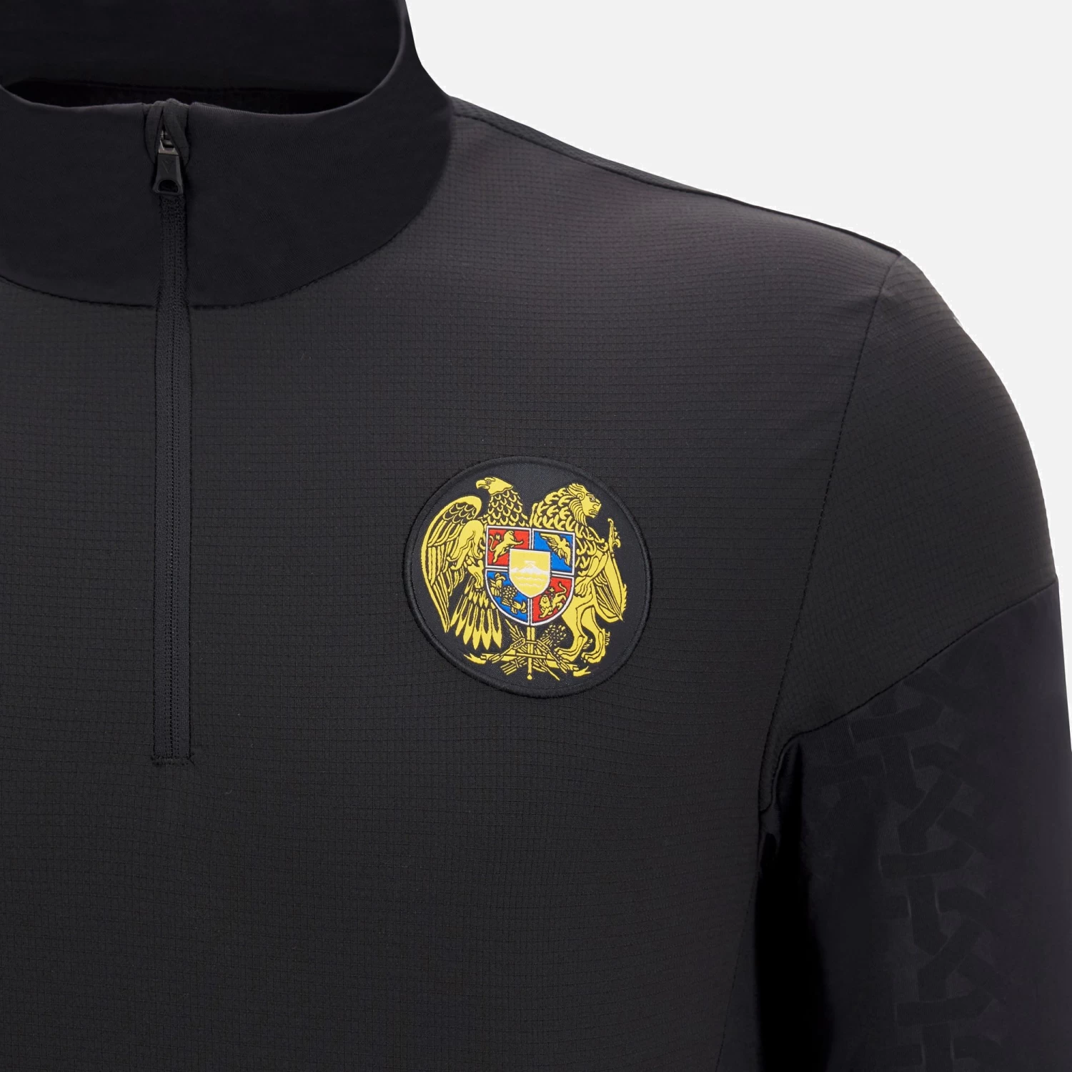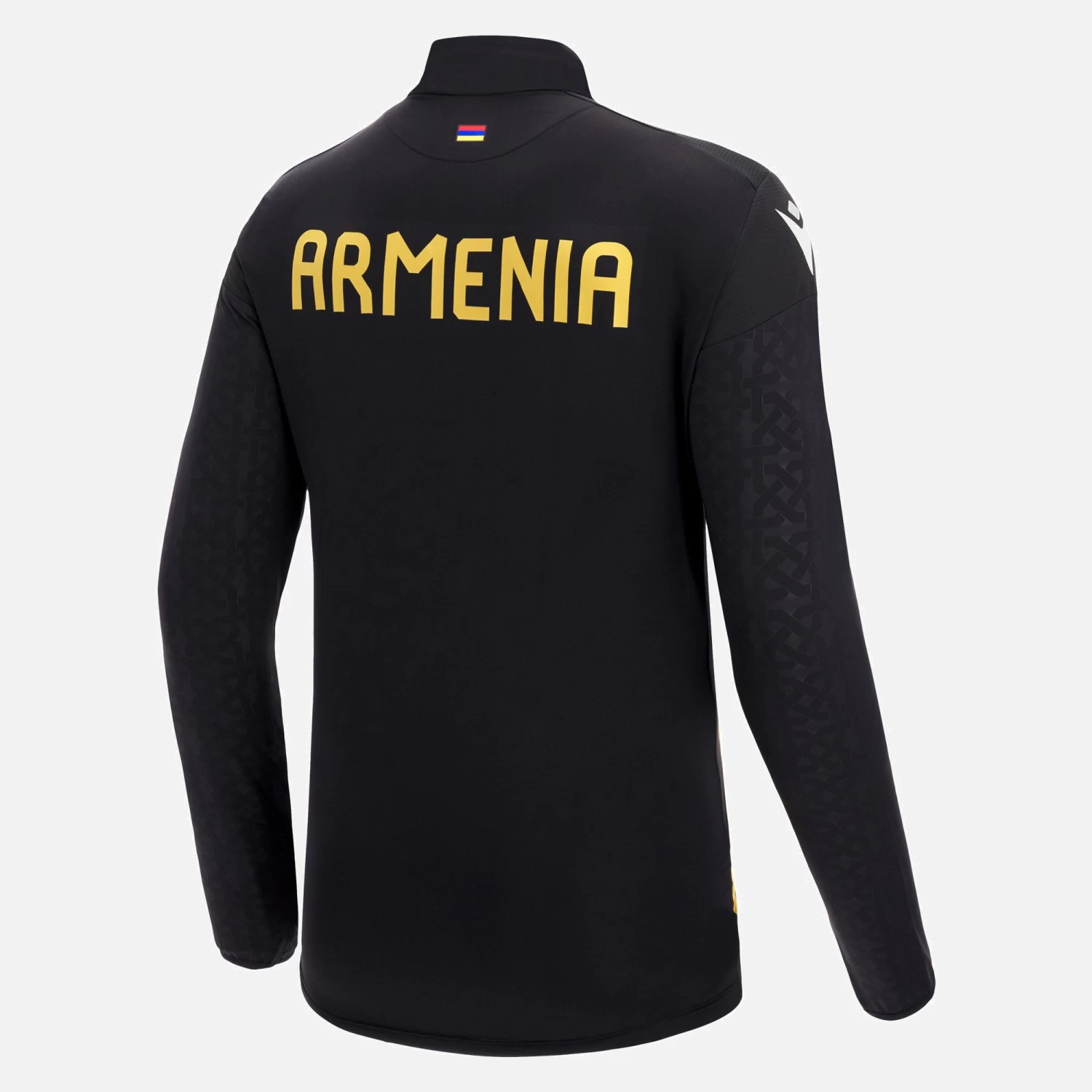 Football Federation of Armenia 2022/23 training shirt with 1/4 zip. It is ideal for training sessions, thanks to the Poly Stretch fabric which provides elasticity and the micromesh inserts that ensure breathability. The country name ARMENIA is emblazoned on the back while the national flag appears on the back of the collar.