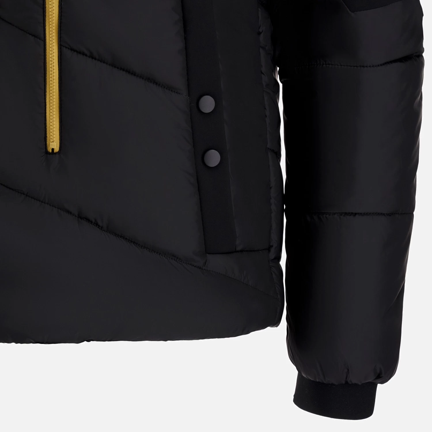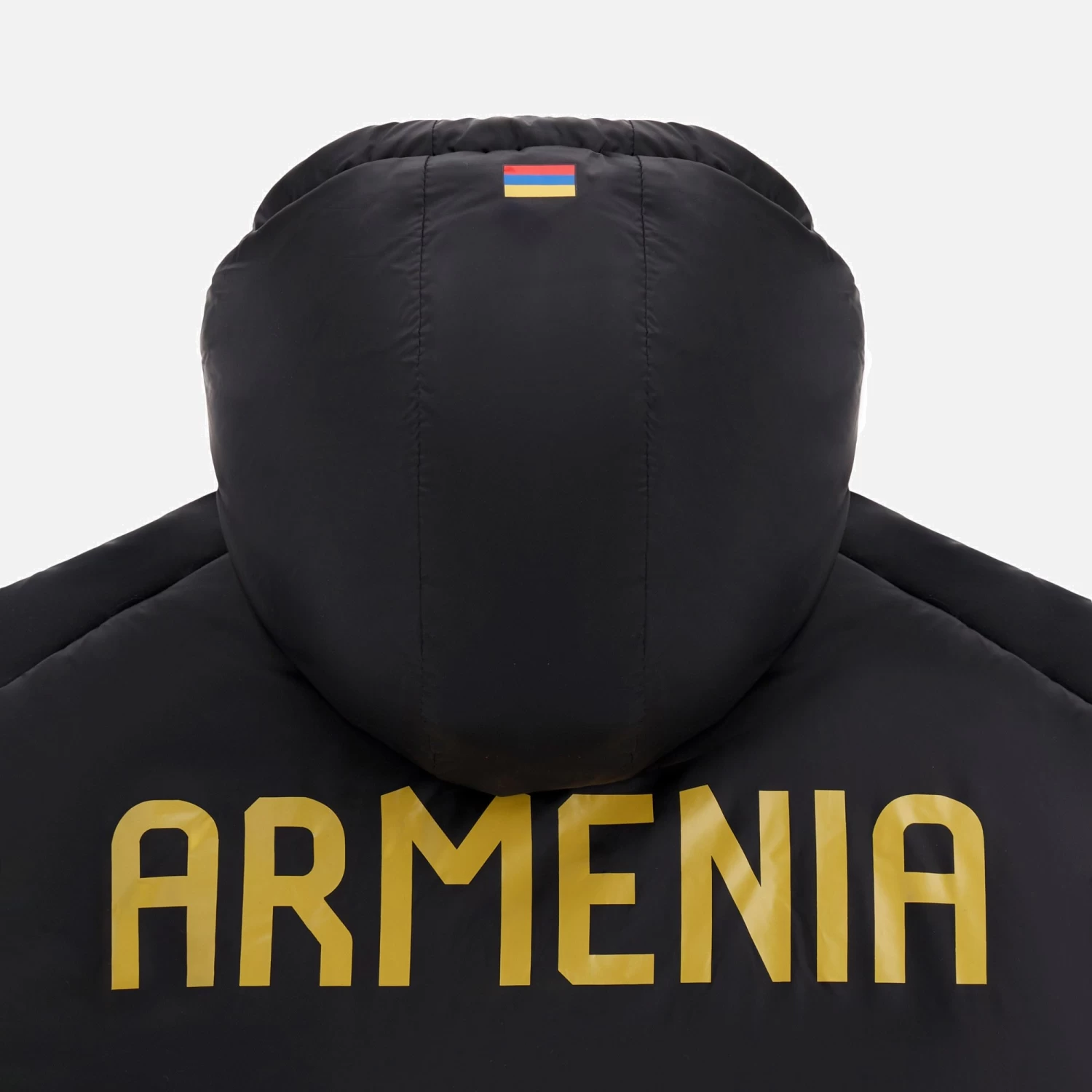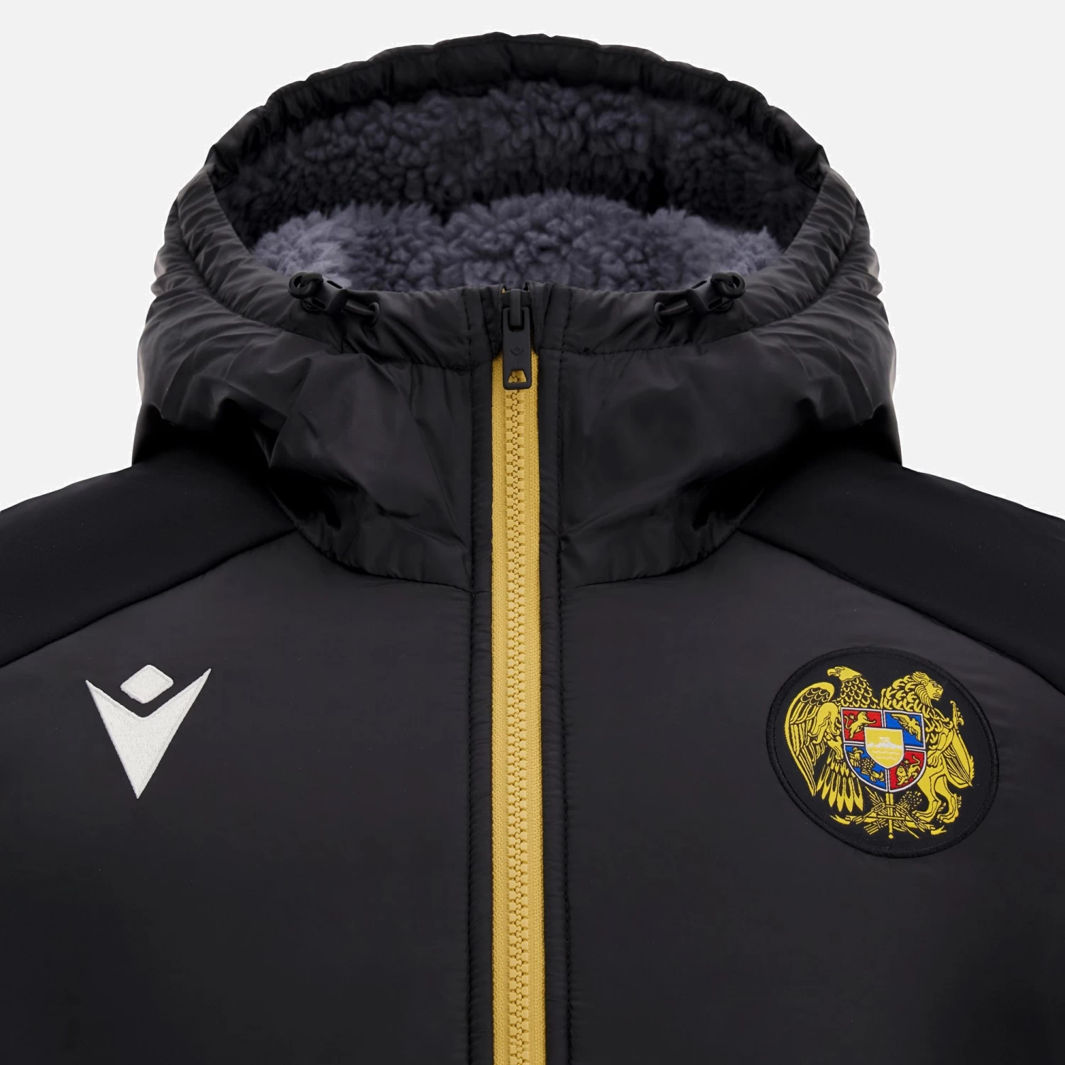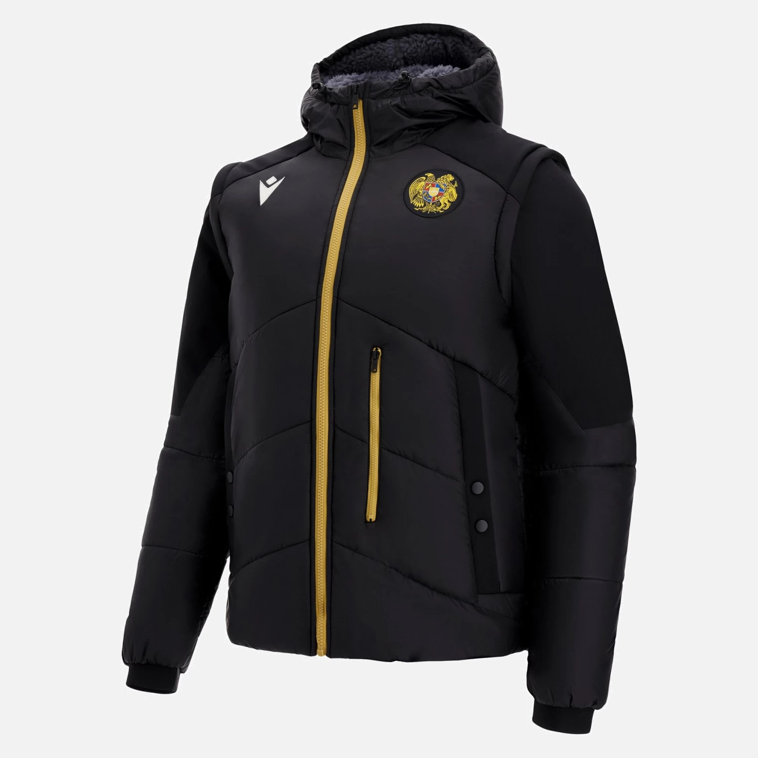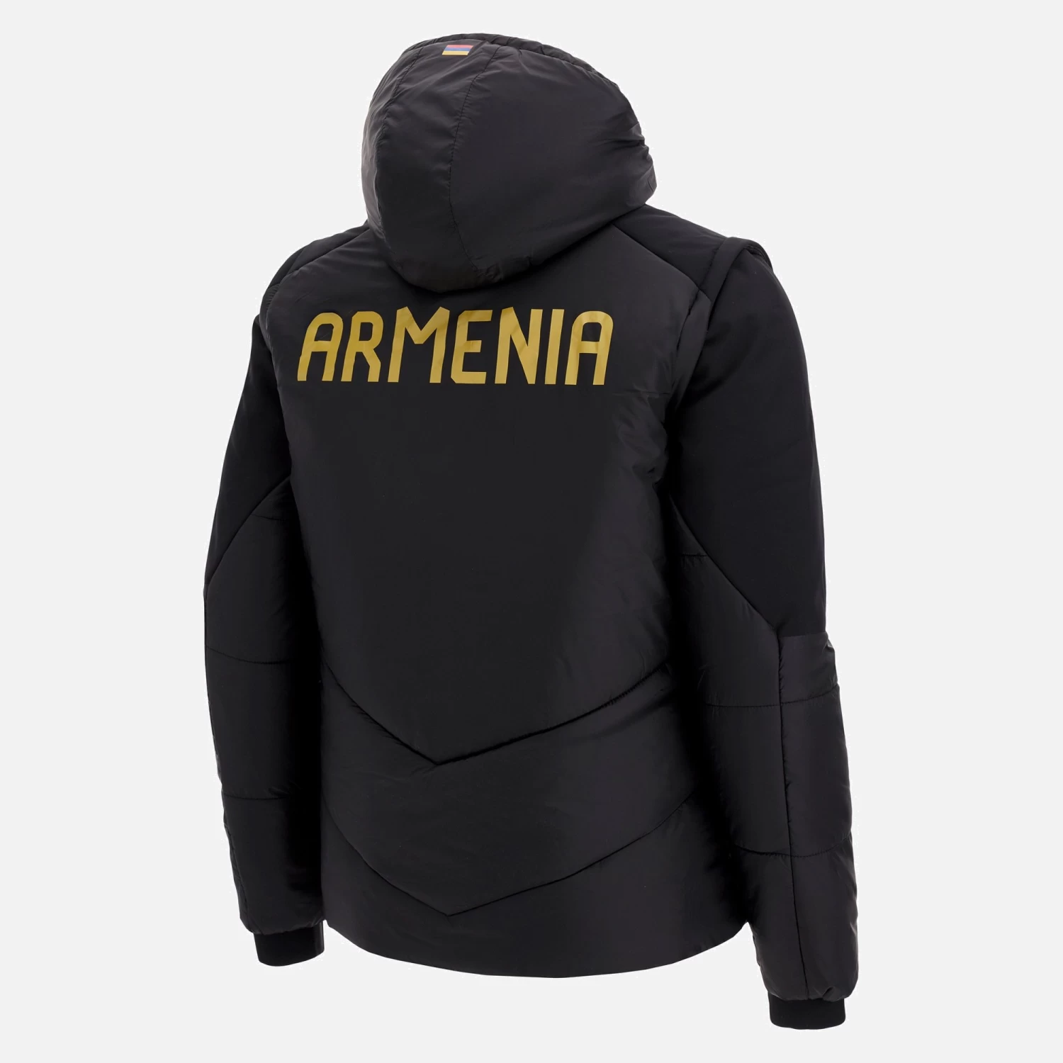 Football Federation of Armenia 2022/23 padded jacket in Softshell complete with hood and detachable sleeves. Black with gold coloured detailing and a full-length central zip. Comfy and cosy to wear.
