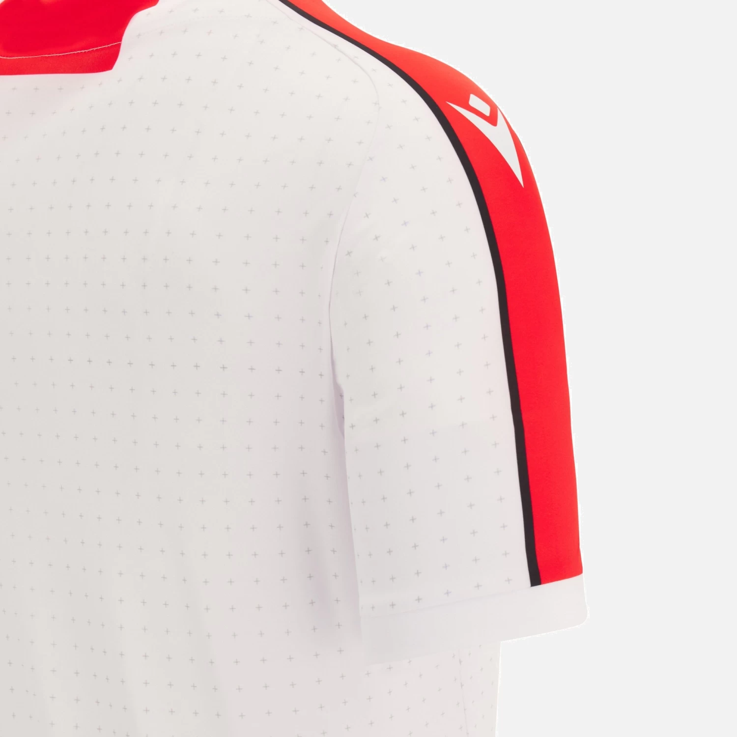 Taking to the pitch with pride. The 2022/23 home jersey of the Georgian national football team features an all-over dot pattern on both the front and back. The main colour is white, punctuated by blocks of red on the sleeves and shoulders, and by a vertical stripe in the centre. Show your support by wearing it with passion!