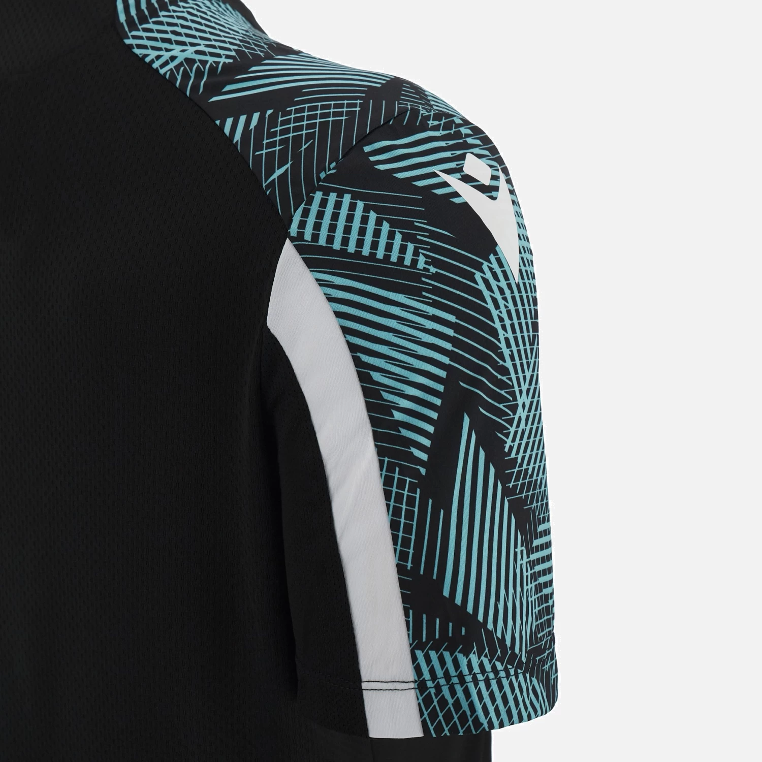 Black lightweight short sleeve training tee with blue pattern over the shoulders and white flashes on the body.