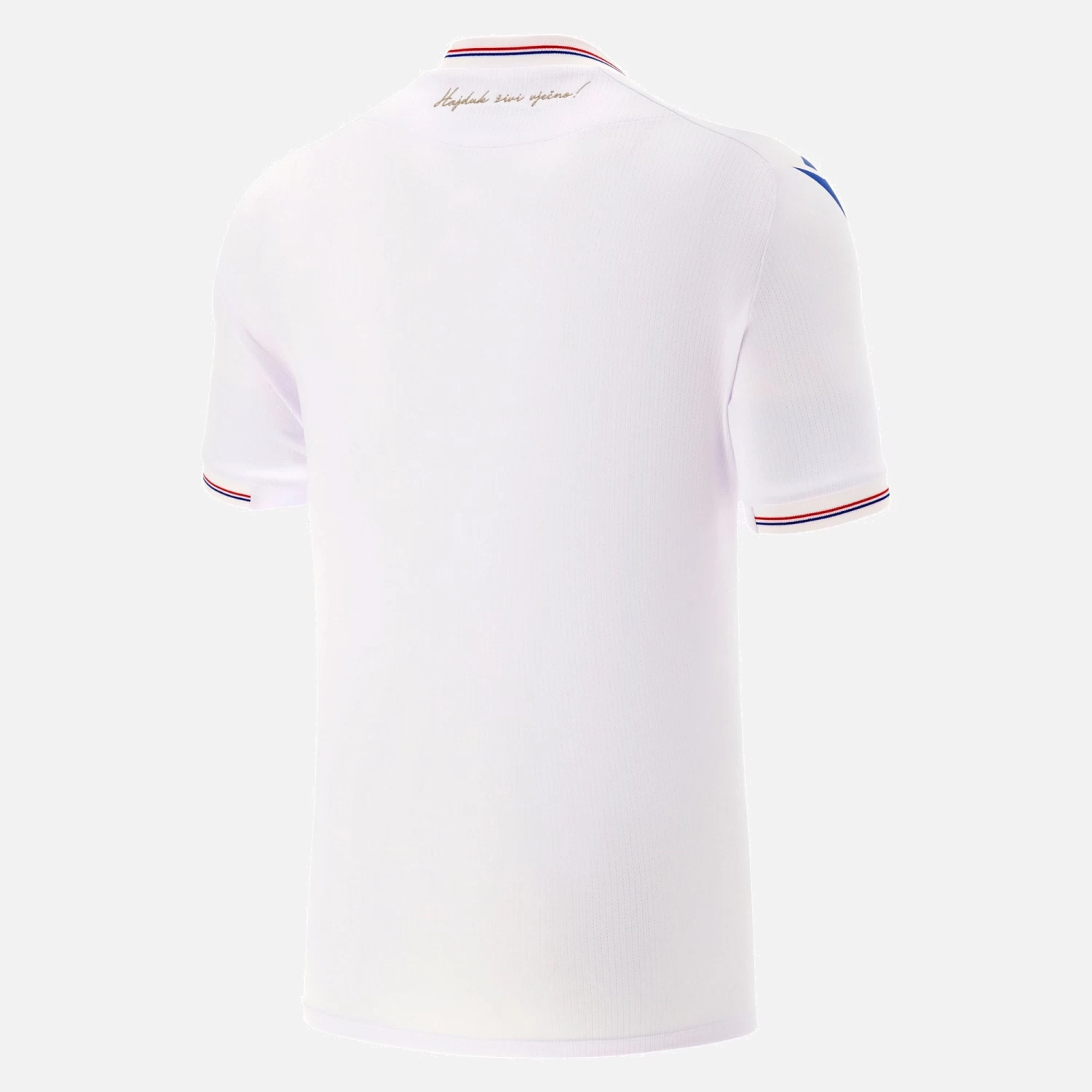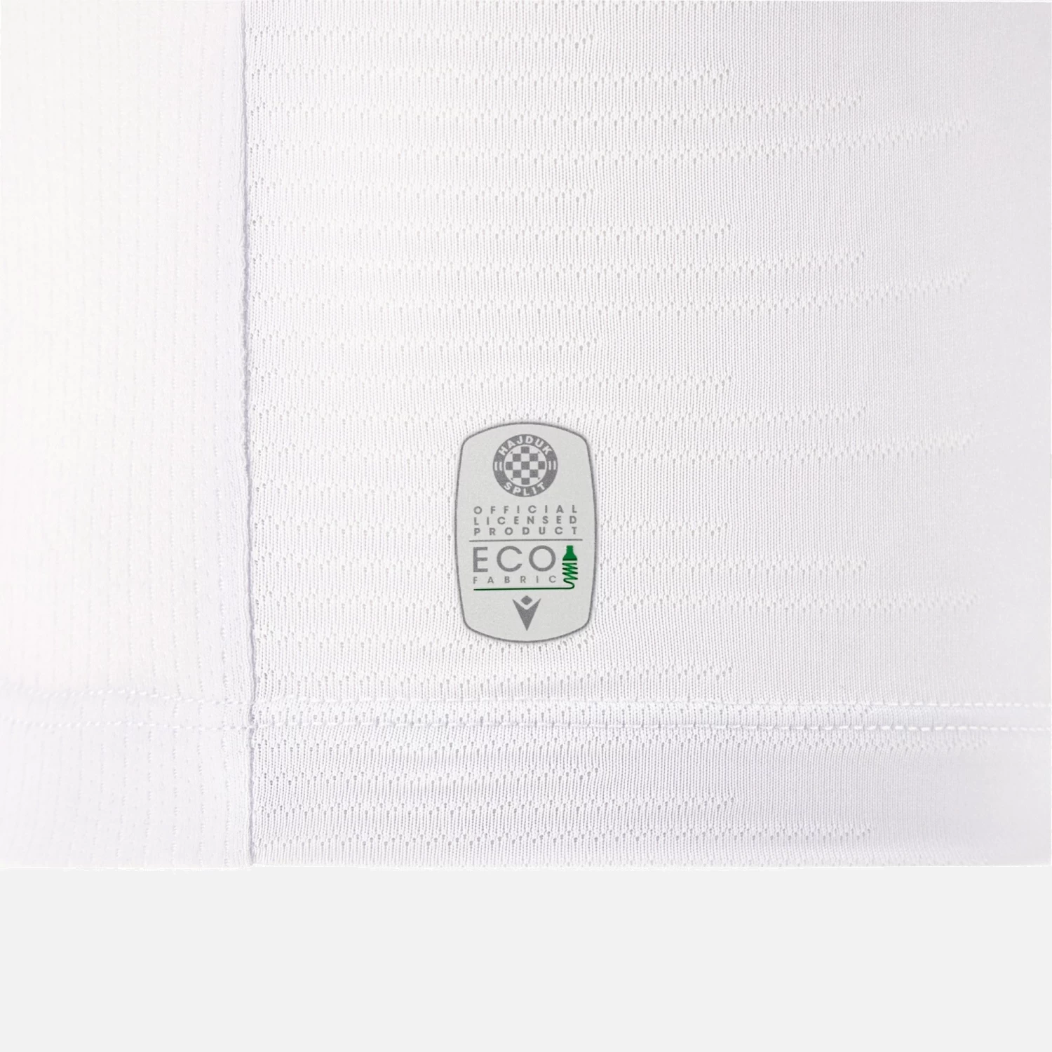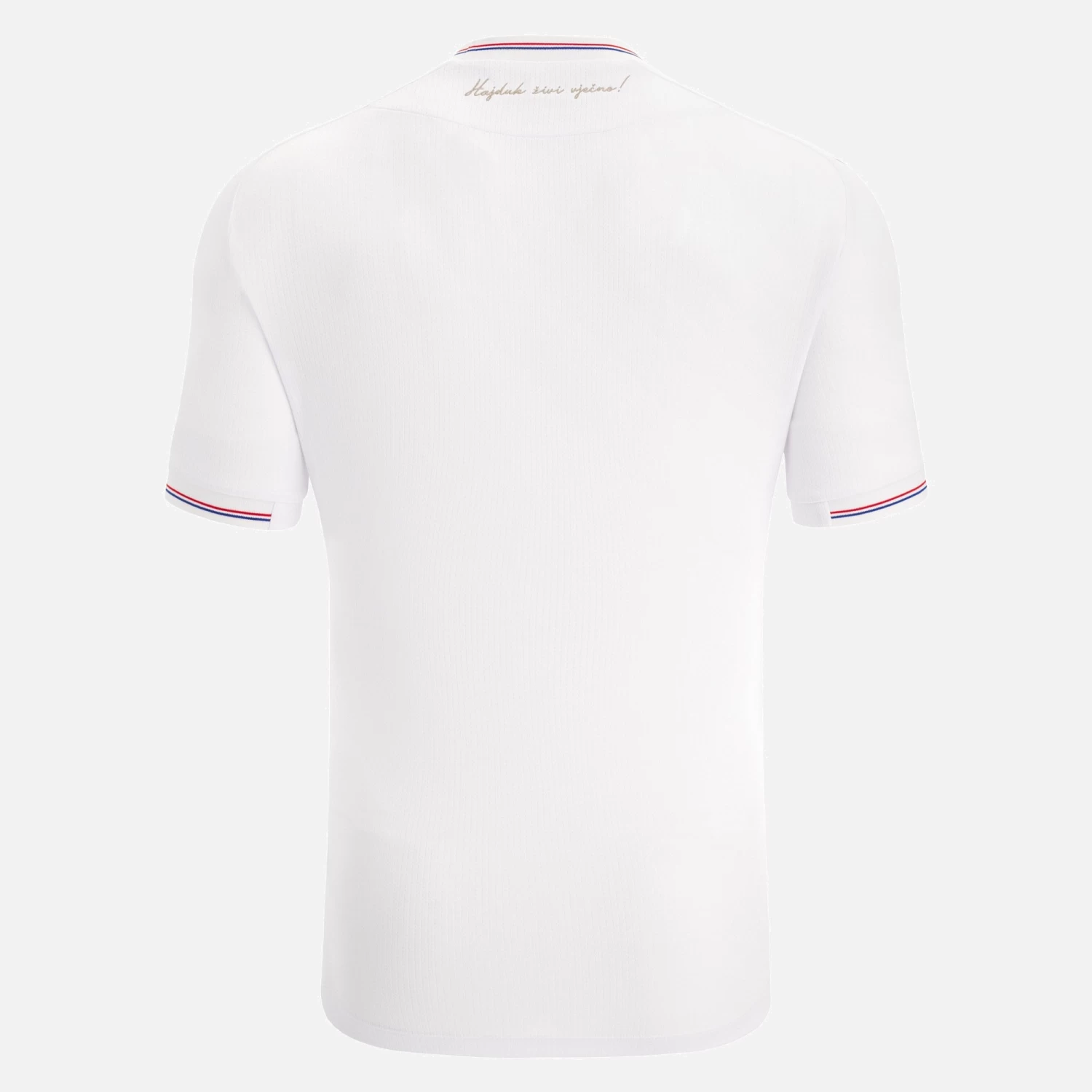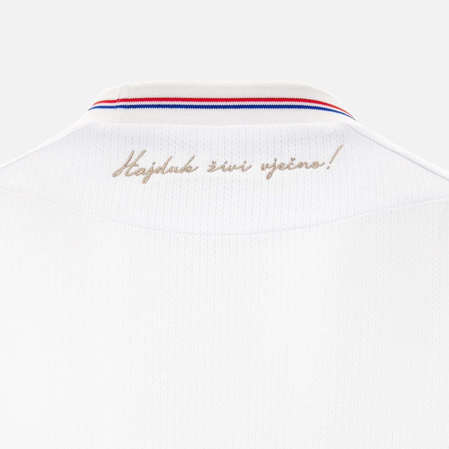The new Eco Performance Jacquard fabric is the star player of the Hajduk Split 2022/23 home jersey, an understated and stylish white piece-dyed garment. The material boasts an impressive technical content and features perforations in those parts where the athlete tends to perspire the most. This characteristic outlines a kind of body armour which gives the garment a compact appearance in addition to providing outstanding breathability. The wording “Hajduk Zivi Vjecno!” stands out in tone-on-tone on the back of the collar. In addition to white, the club’s colours red and blue also intersect in the detailing of the jersey.