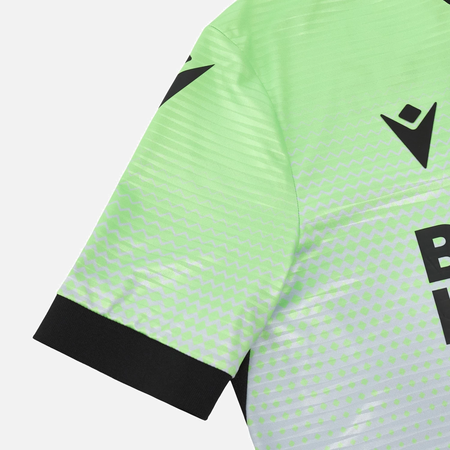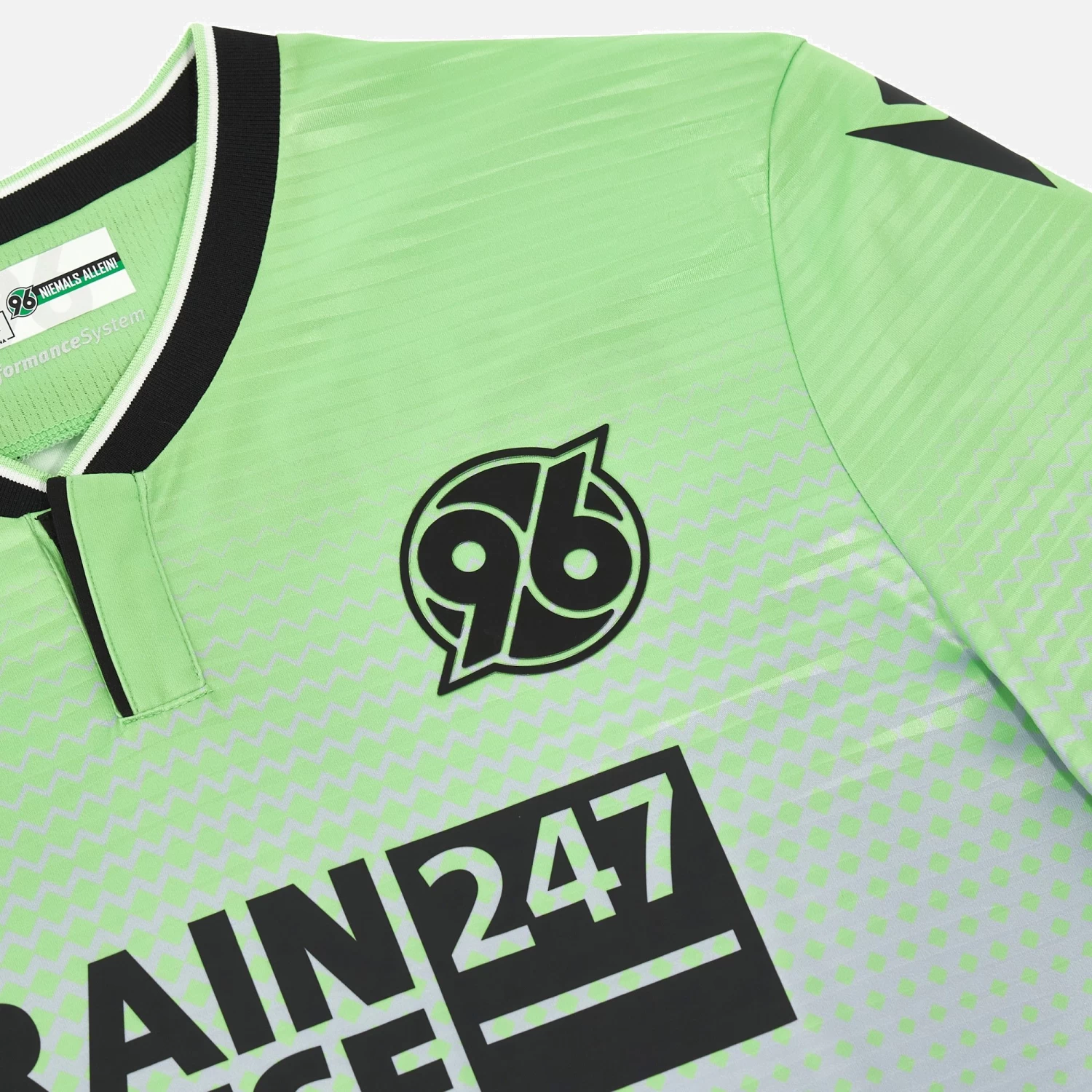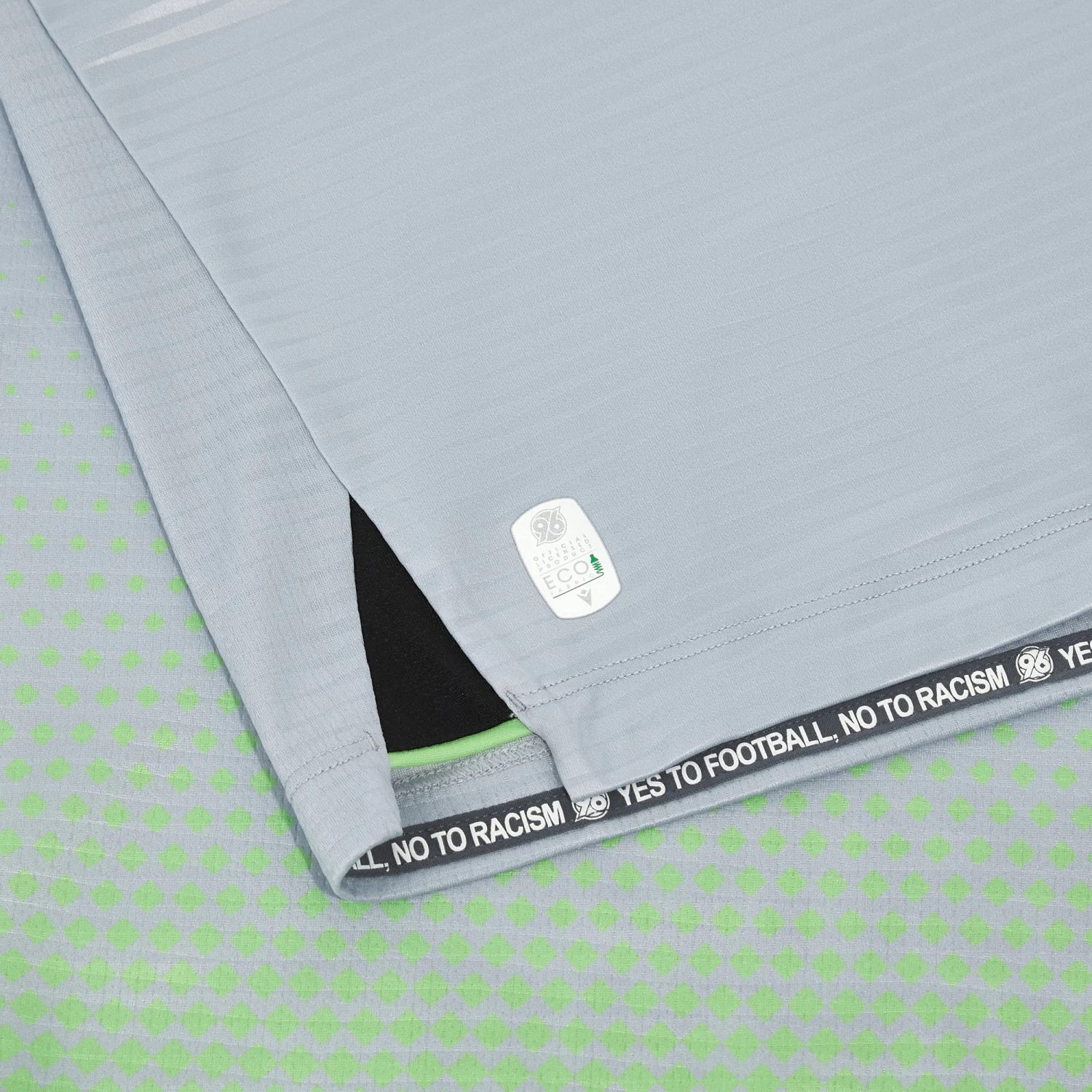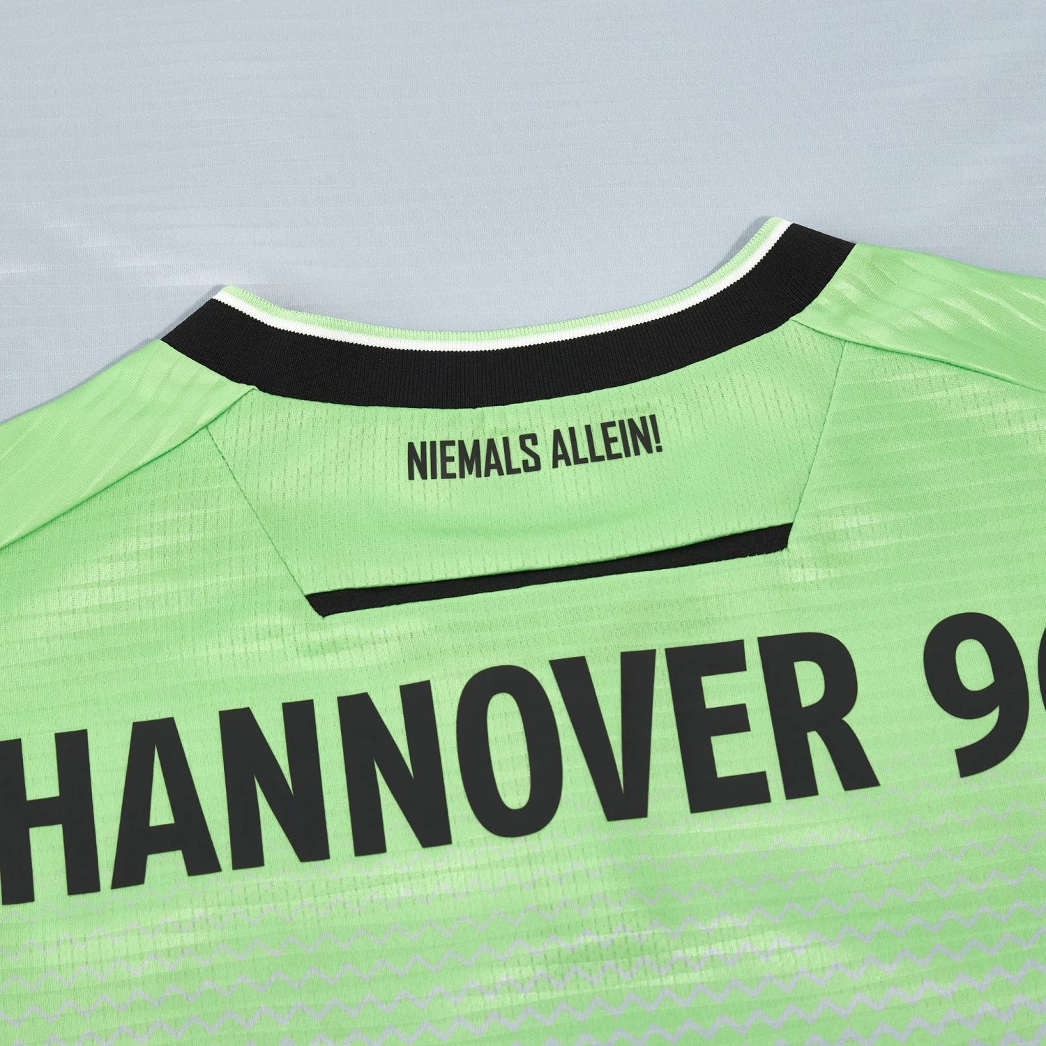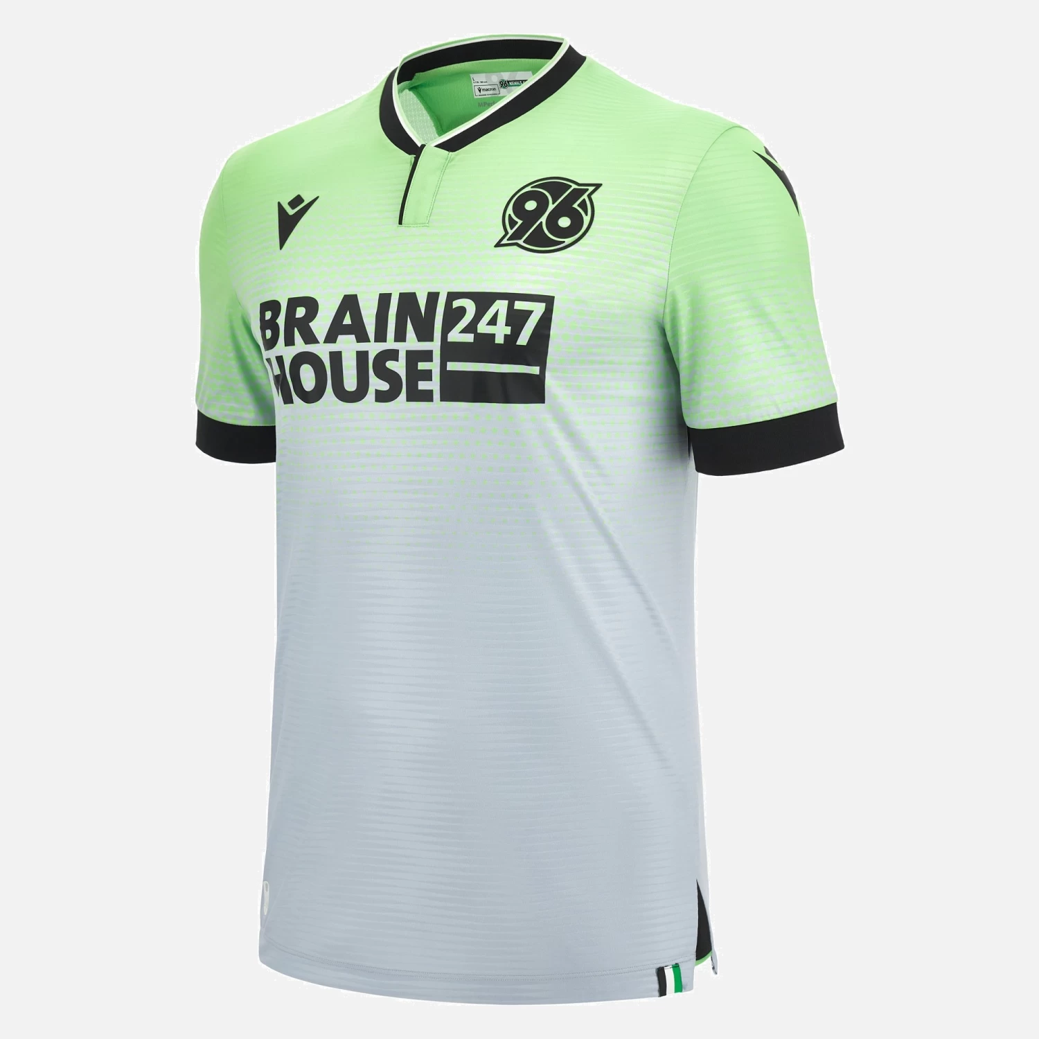 Paler and softer shades for the 2023/24 season Hannover 96 third game shirt. The pattern consists of an acid green shade that gently fades towards a silvery hue at the hem. The garment features a sleek Mandarin collar and internal tape customised with the motto ‘YES TO FOOTBALL, NO TO RACISM’. New colours for a new action-packed season.