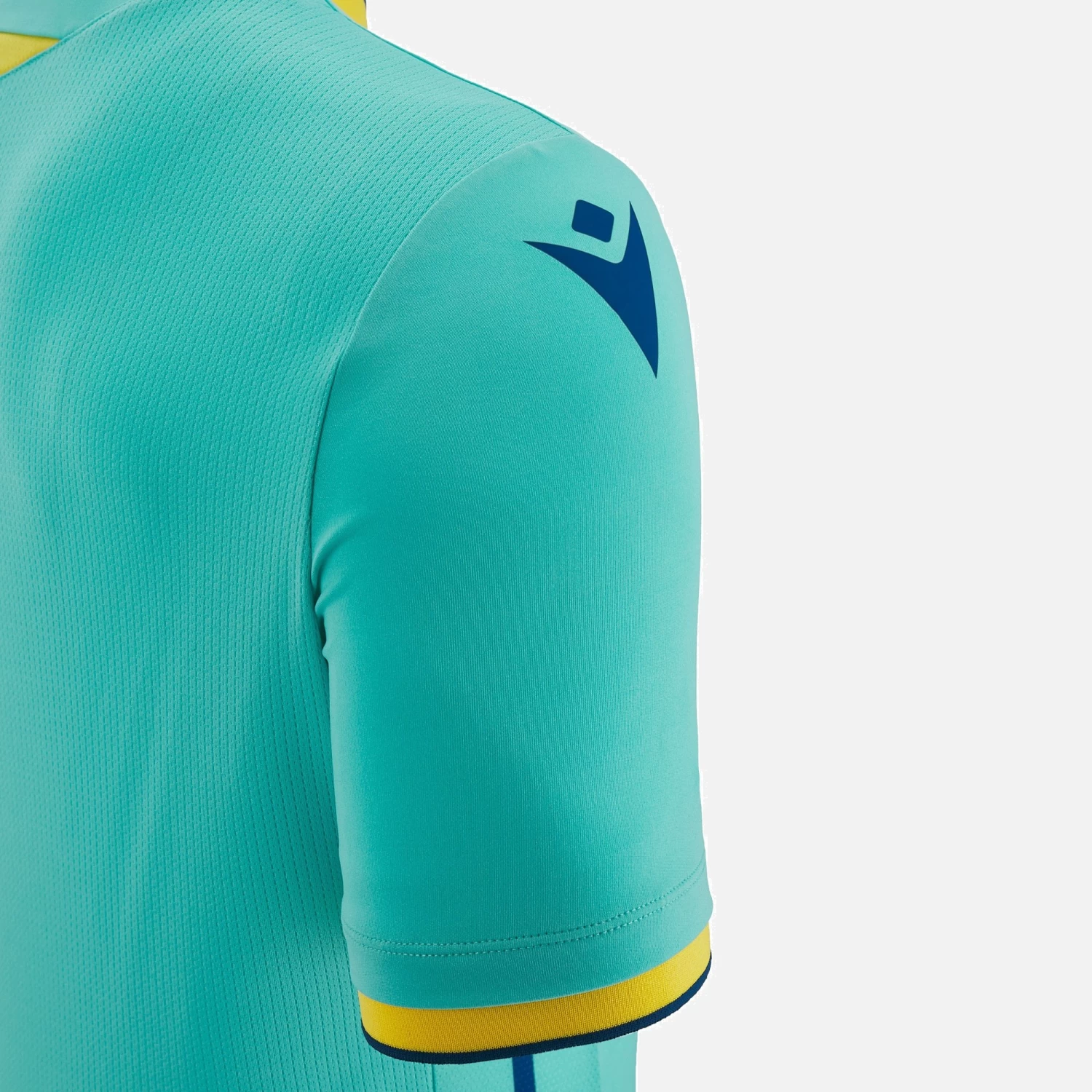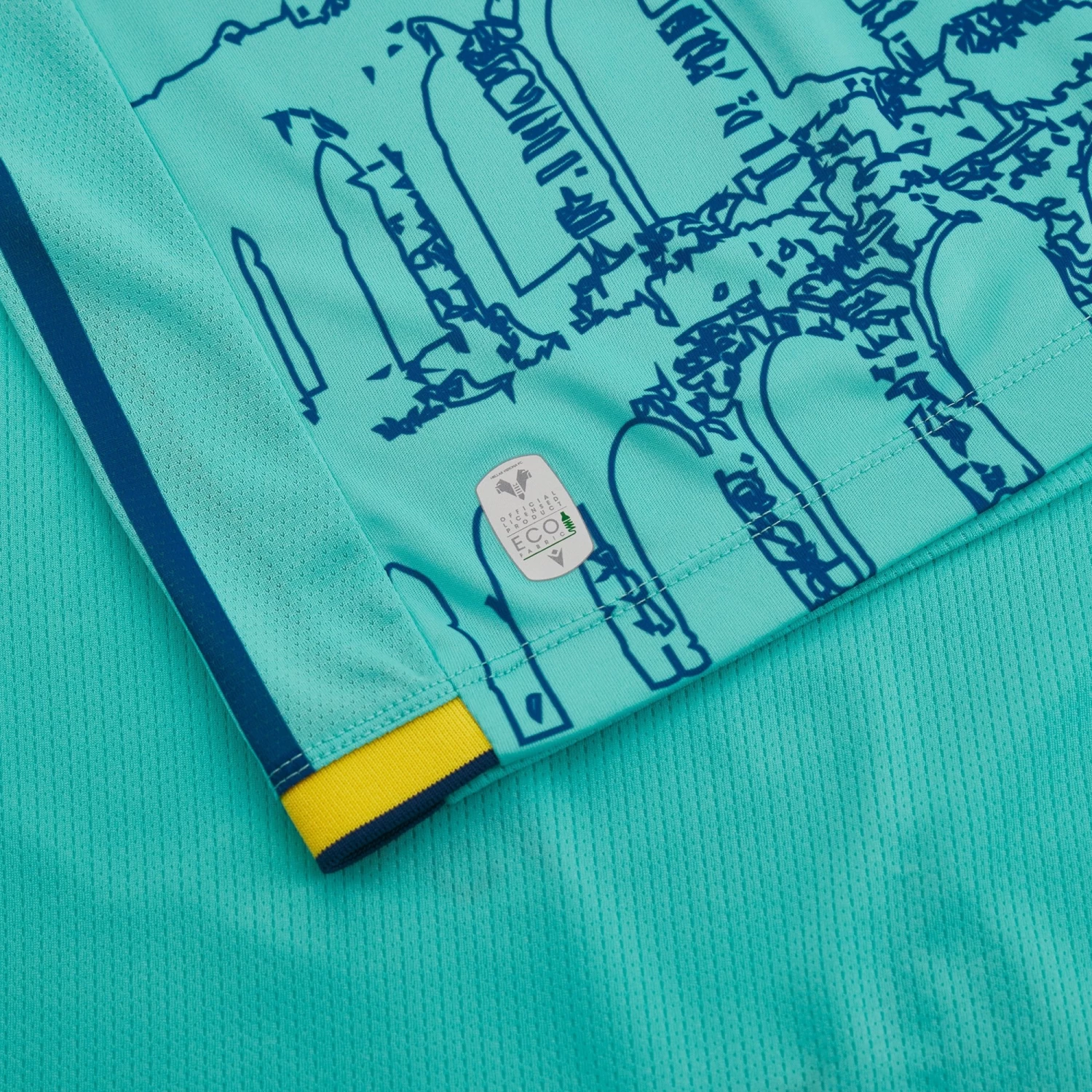 The Hellas Verona 2022/23 third match jersey has a unique look. The main colour is turquoise, combined with yellow and blue knit fabric on the shirt bottom, sides and sleeves. The front features a dye-sub print of Verona Arena, one of the most iconic symbols of the city. The back of the collar, meanwhile, is embroidered with VERONA in blue. A must-have garment!
