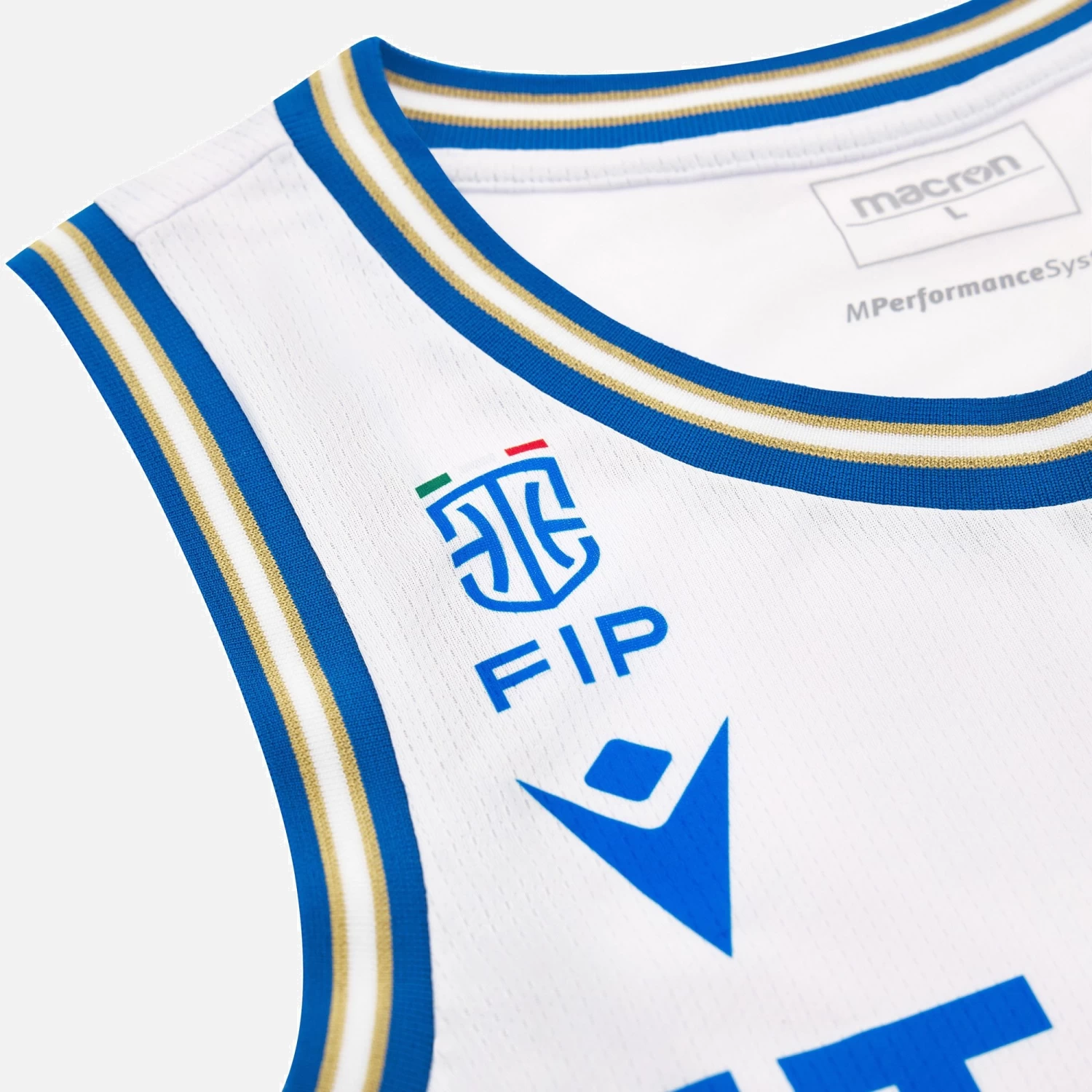 Kick off an exciting season with the new Italbasket 2022/23 away vest. Made from Eco Fabric with mesh inserts, it will guarantee coolness and breathability throughout play. Further enhanced with stylish gold and dark turquoise-blue details like the Macron Hero, collar and armholes. Wear it and you too can feel like you’re part of the Italian national basketball team!