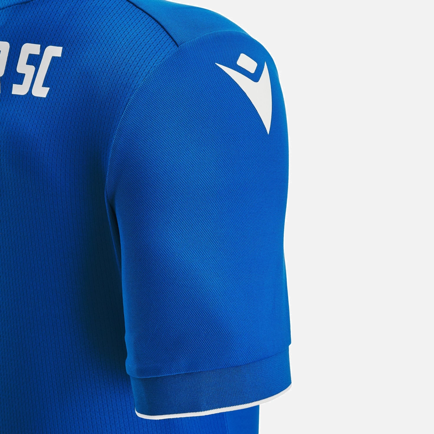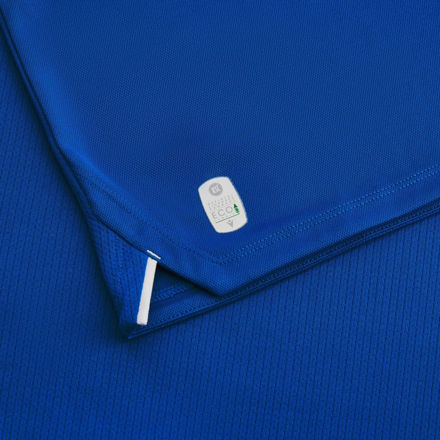 Classic design with a traditional style. The Karlsruher SC 2022/23 home jersey sports an all-blue design with an embossed stripe on the front, finishing with a fade effect towards the bottom. The logos of the founding clubs appear within the stripe. The wording ‘MEINE HEIMAT’, my homeland, appears on the back of the collar. Made from soft eco fabric, for guaranteed lightness and comfort during play.