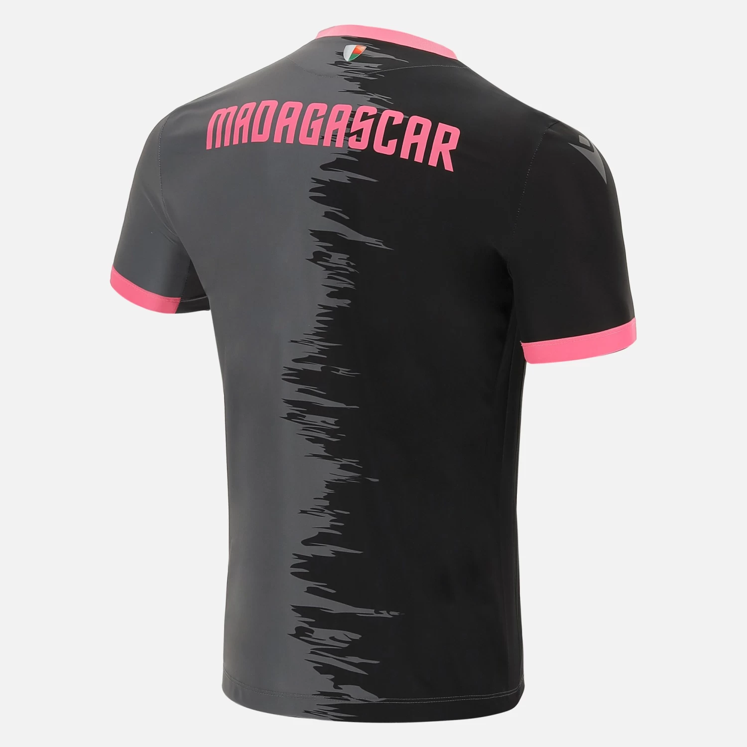 The training jersey of the Madagascar national football team is in black/anthracite with pink details. It will also be worn in competition by the women’s section of the team. The collar resembles the profile of a zebu, the national symbol. It has mesh inserts for a better breathability. The fit is slim.