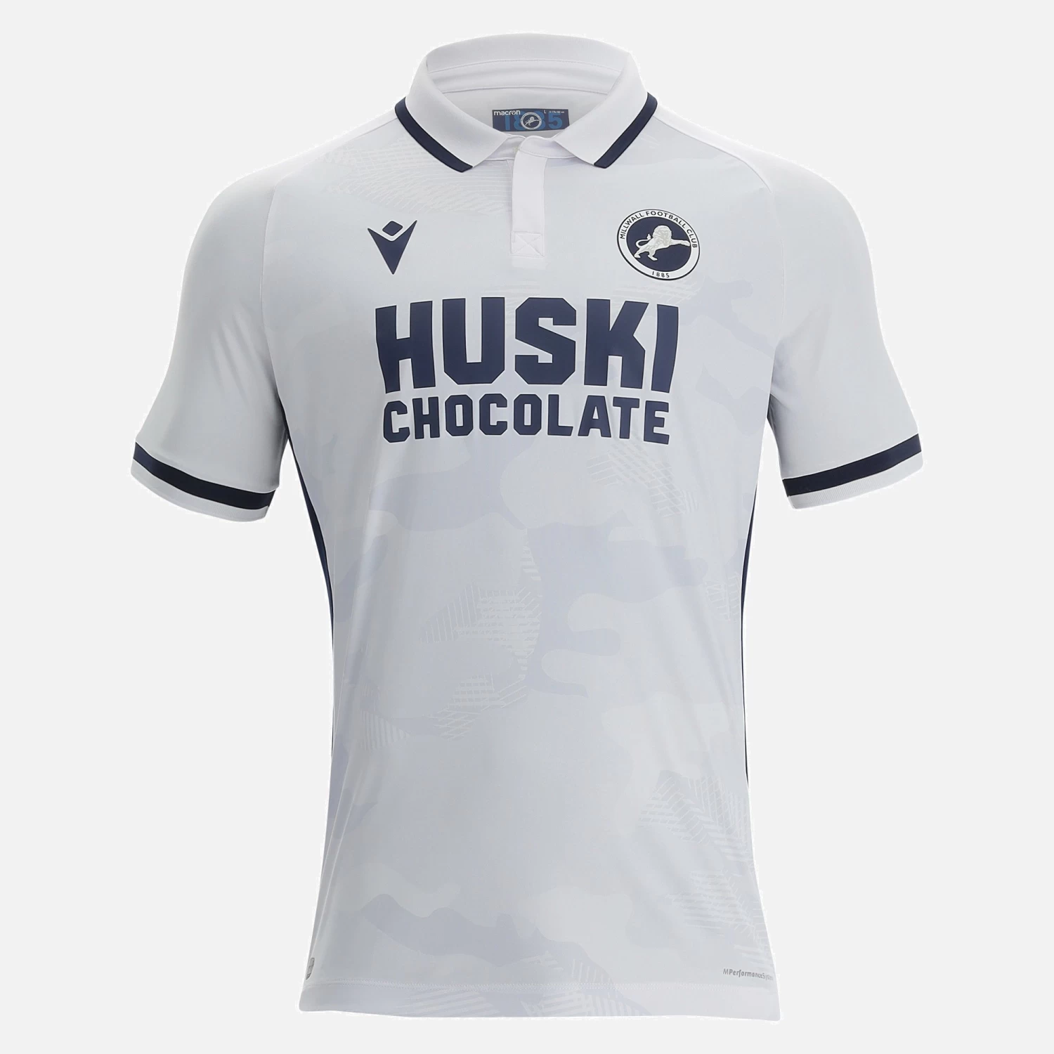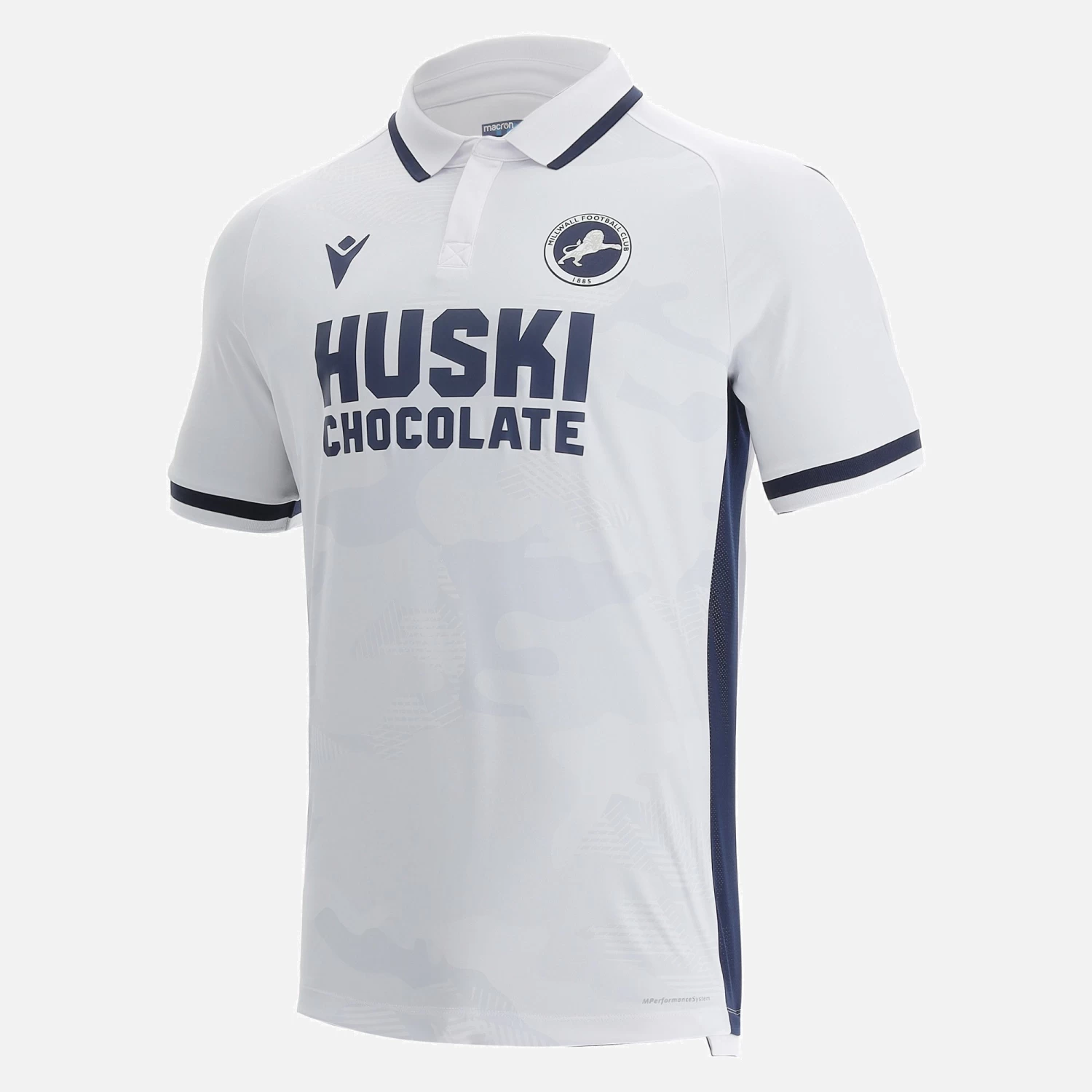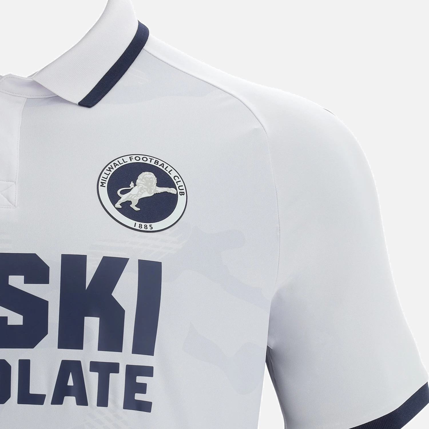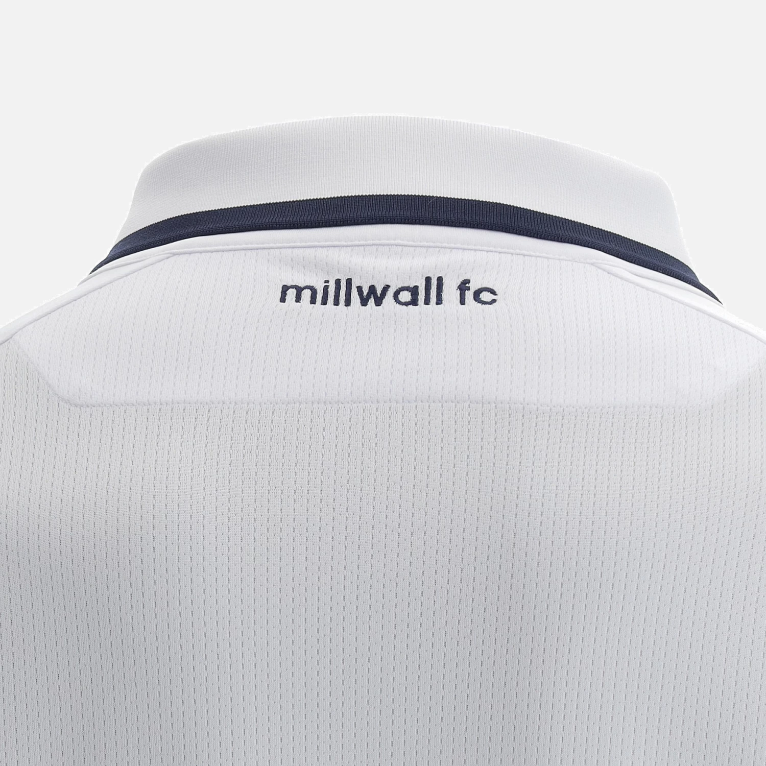 The new Millwall FC 2021/22 away jersey sports a dye-sublimation print in shades of pale blue on the front of the shirt. White with blue detailing, the shirt is embellished with a shield badge on the left breast and ‘Millwall fc’ in blue on the back, just below the collar.