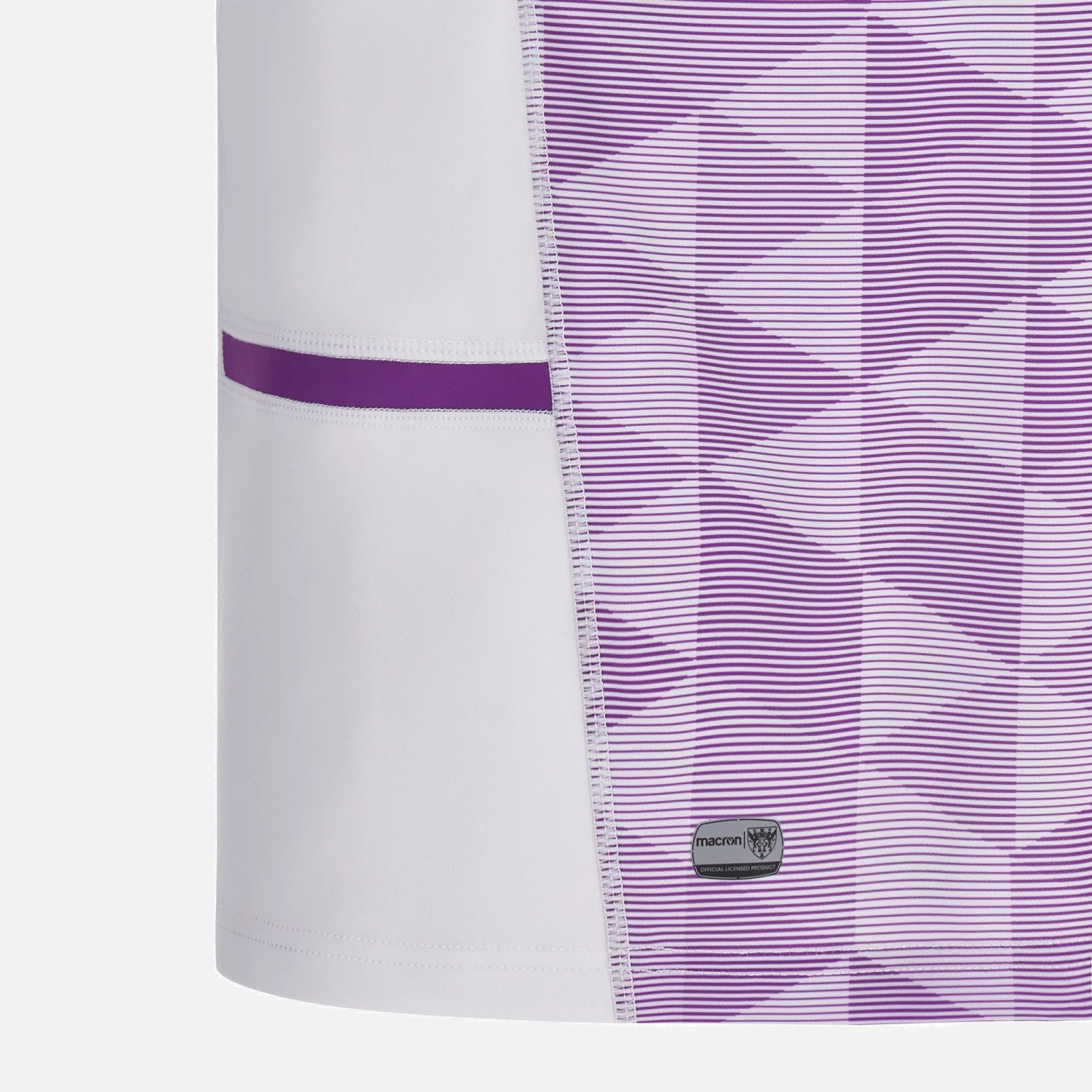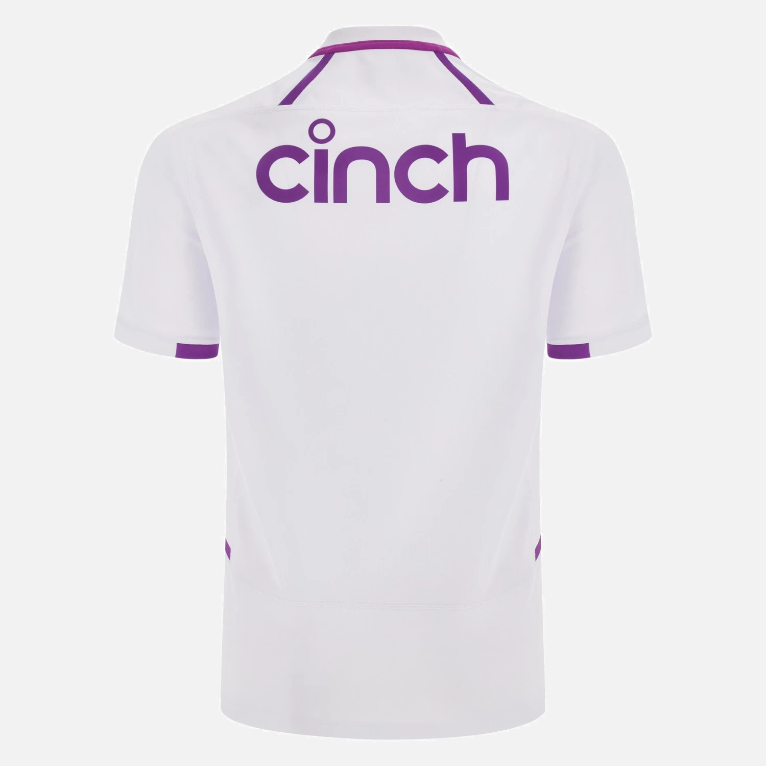 The Northampton Saints 2022/23 replica away jersey features a dye-sub geometric texture in purple that contrasts with the white background. Purple is also used for the various details on the sides, sleeves and back of the collar. This replica model is perfect for fans to wear, as it is comfortable and lightweight.