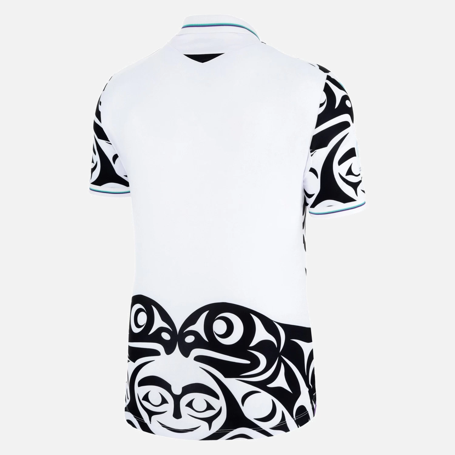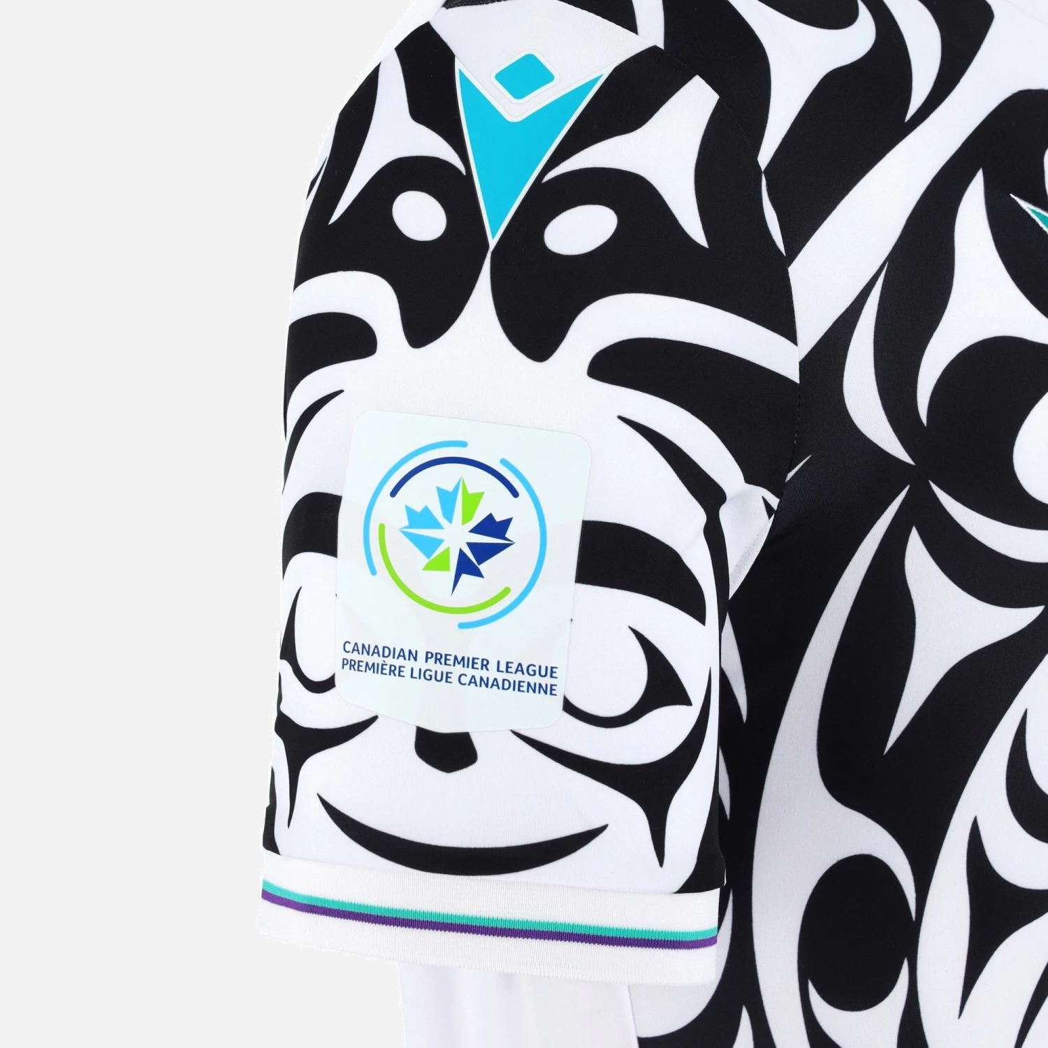 The Pacific FC 2022/23 alternate shirt boasts a singular design. It draws its inspiration from the tallest Totem in the world, located in Beacon Hill park, Victoria. The shirt has an “indigenous” style to pay tribute to such a significant and profound symbol. The white shirt is entirely covered by the reference to the work of art in black with secondary splashes of aqua green.