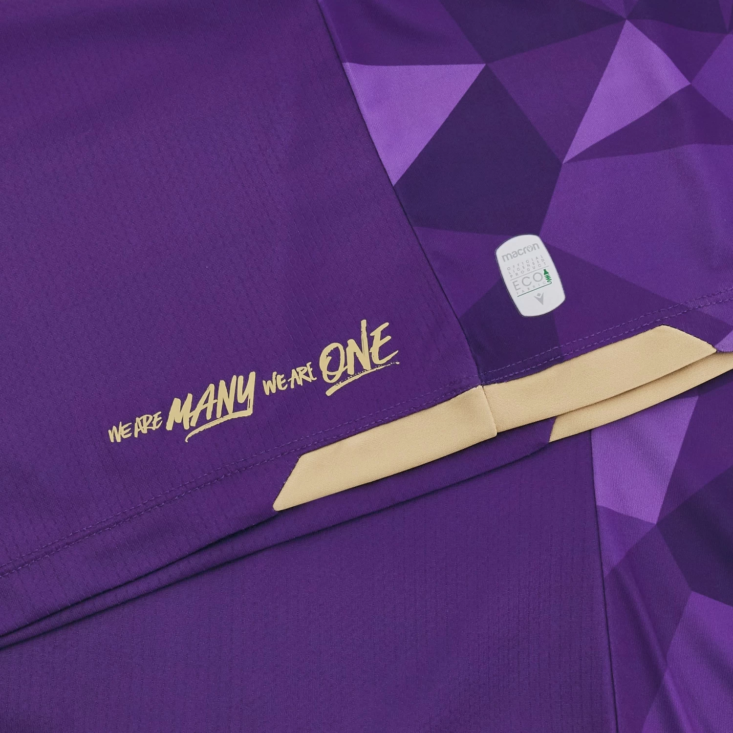 Stylish gold details commemorate the club’s 2021 CPL title win. The new Pacific FC 2023/24 home jersey is made in three shades of purple to best express the team’s close ties with the local area. The front is enhanced by a dye-sub print representing the head of a bear, considered a national animal. Further enhanced by a neat Mandarin collar and mesh inserts. The motto WE ARE MANY WE ARE ONE appears on the back of the shirt at the bottom.