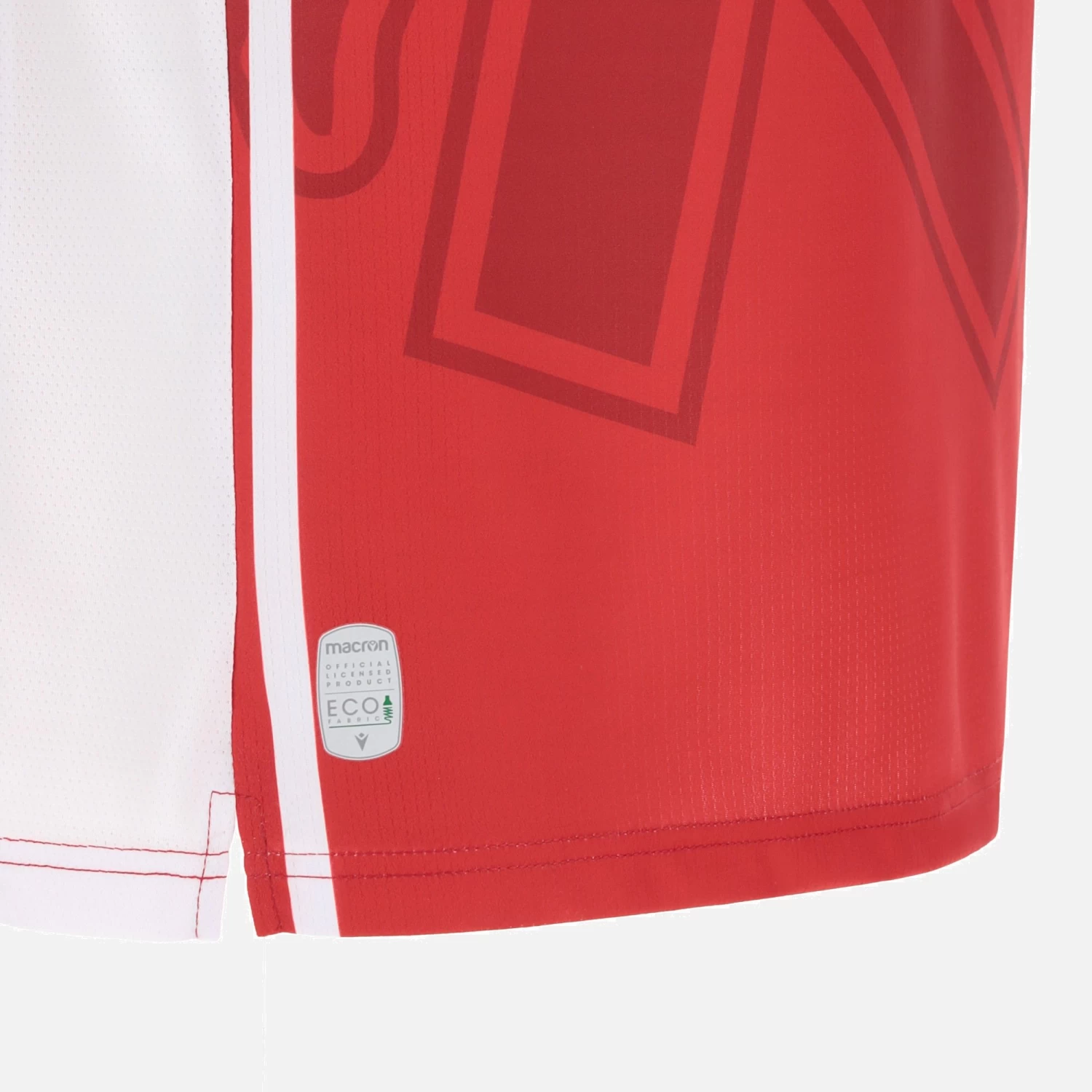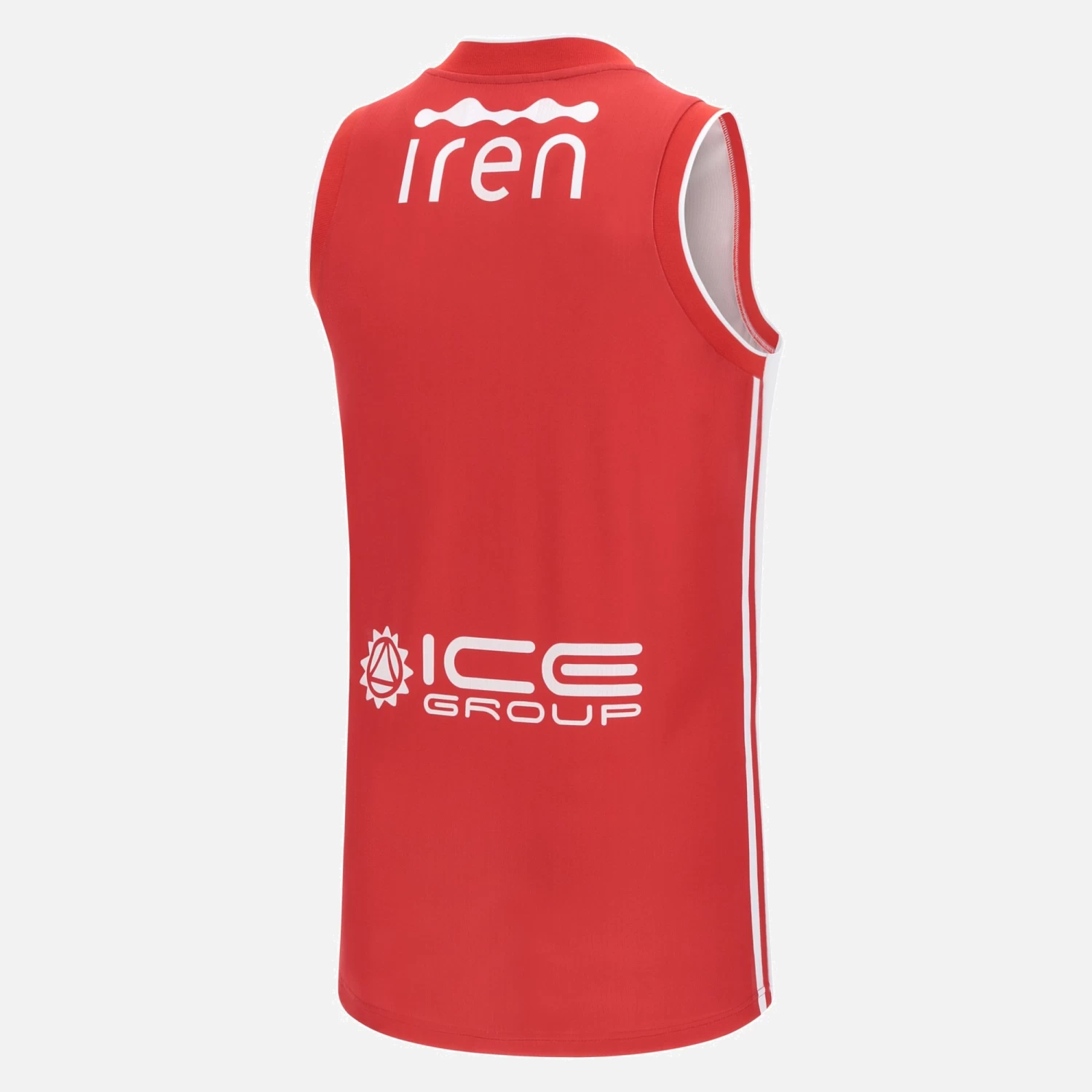 The new Pallacanestro Reggiana 2021/22 away tank features tone-on-tone graphics depicting the team’s logo. Red blue with white detailing, the shirt is embellished with the club badge over the heart and white inserts on the sides.