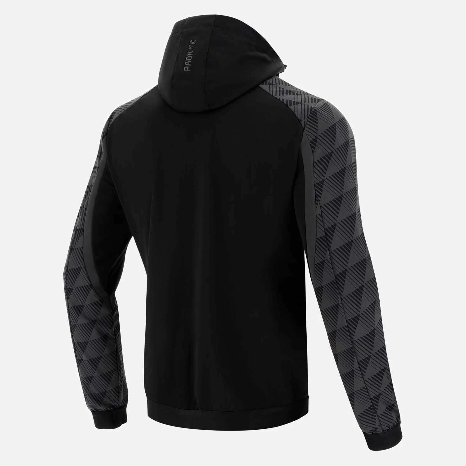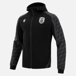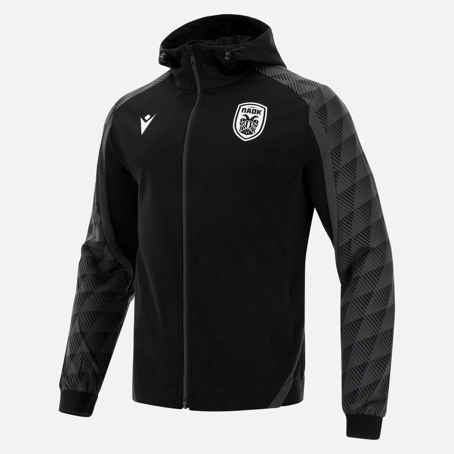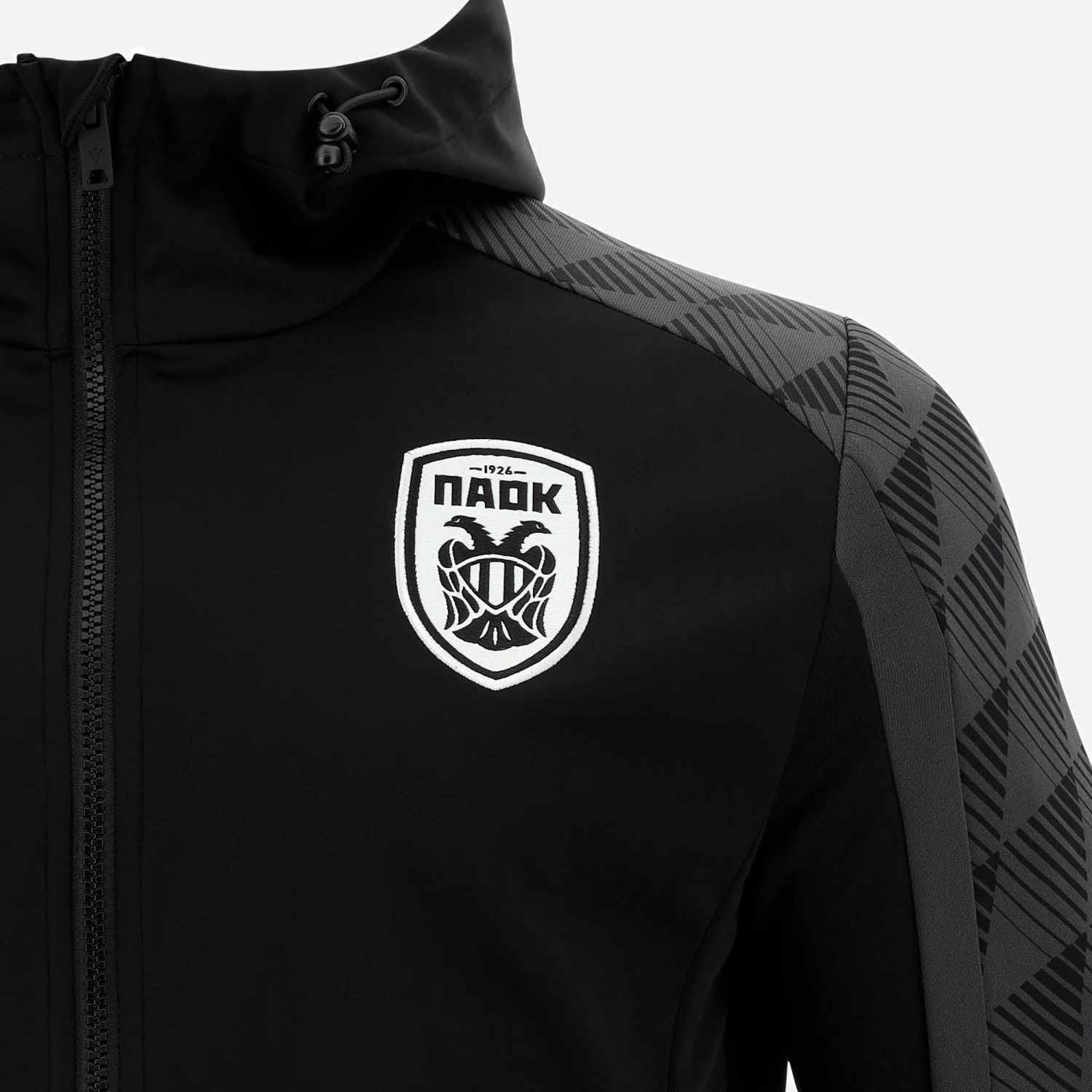 Paok FC 2021/22 anthem jacket. The garment features a handy central zip, a practical hood and side pockets. It comes complete with the club badge over the left breast and the wording ‘Paok FC’ in grey on the back. Wear your Paok FC anthem jacket with pride!