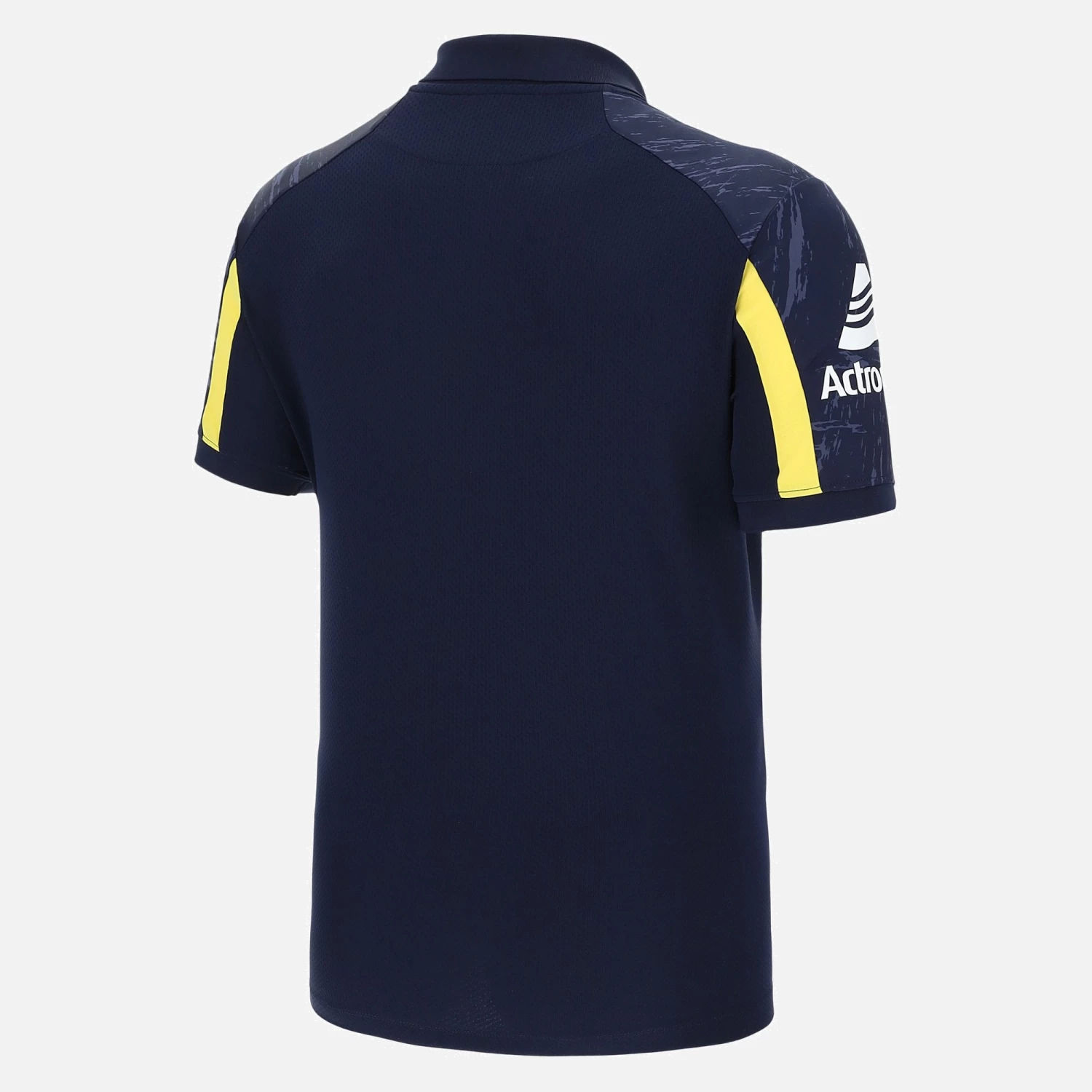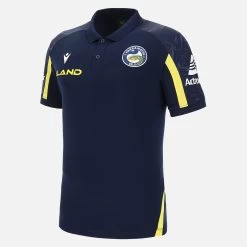 Parramatta Eels 2021/22 travel polo shirt. Navy blue with yellow detailing. Club badge over the heart.