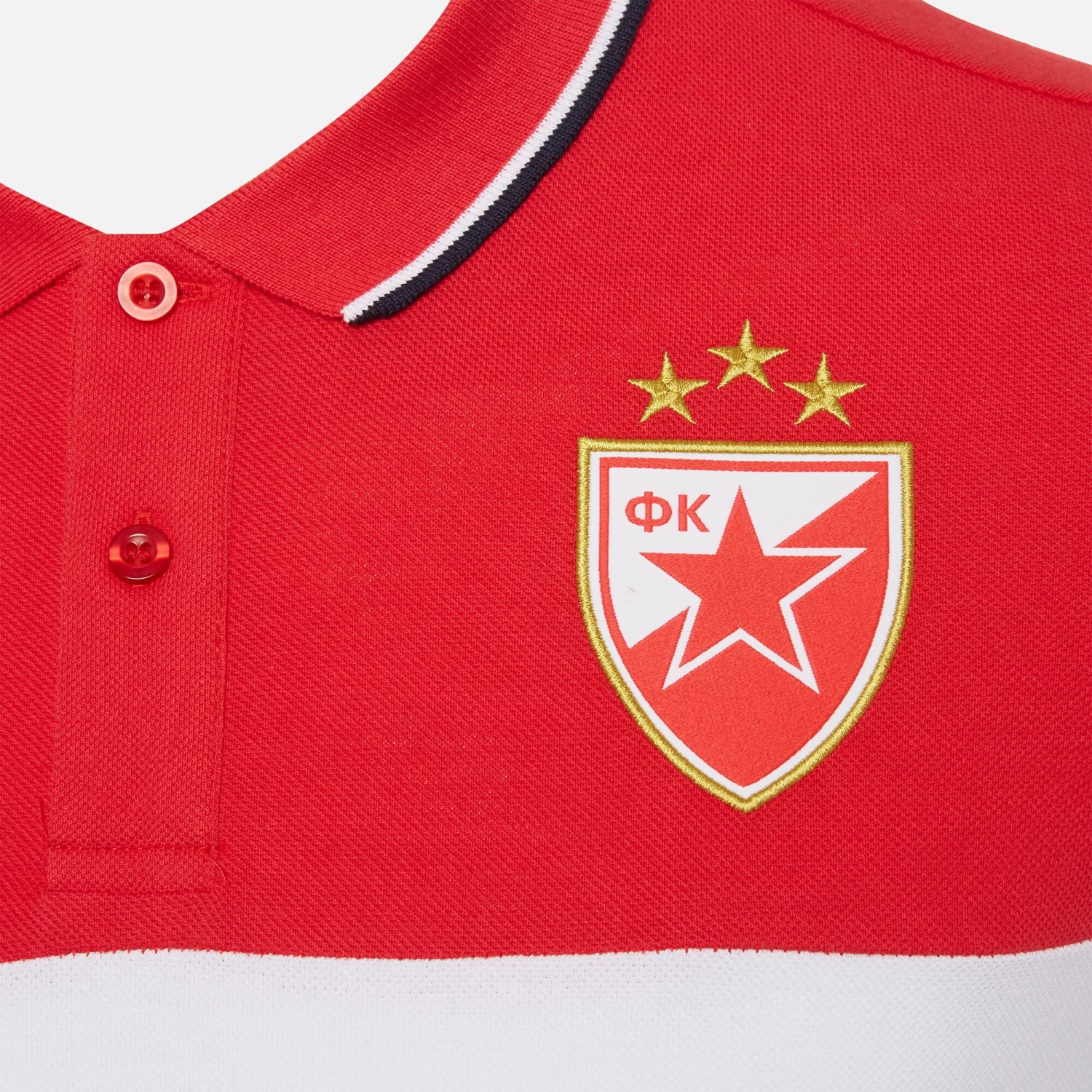 Red Star Belgrade 2020/21 pique cotton polo shirt, red with a white stripe in the center and a navy blue RED STAR print.