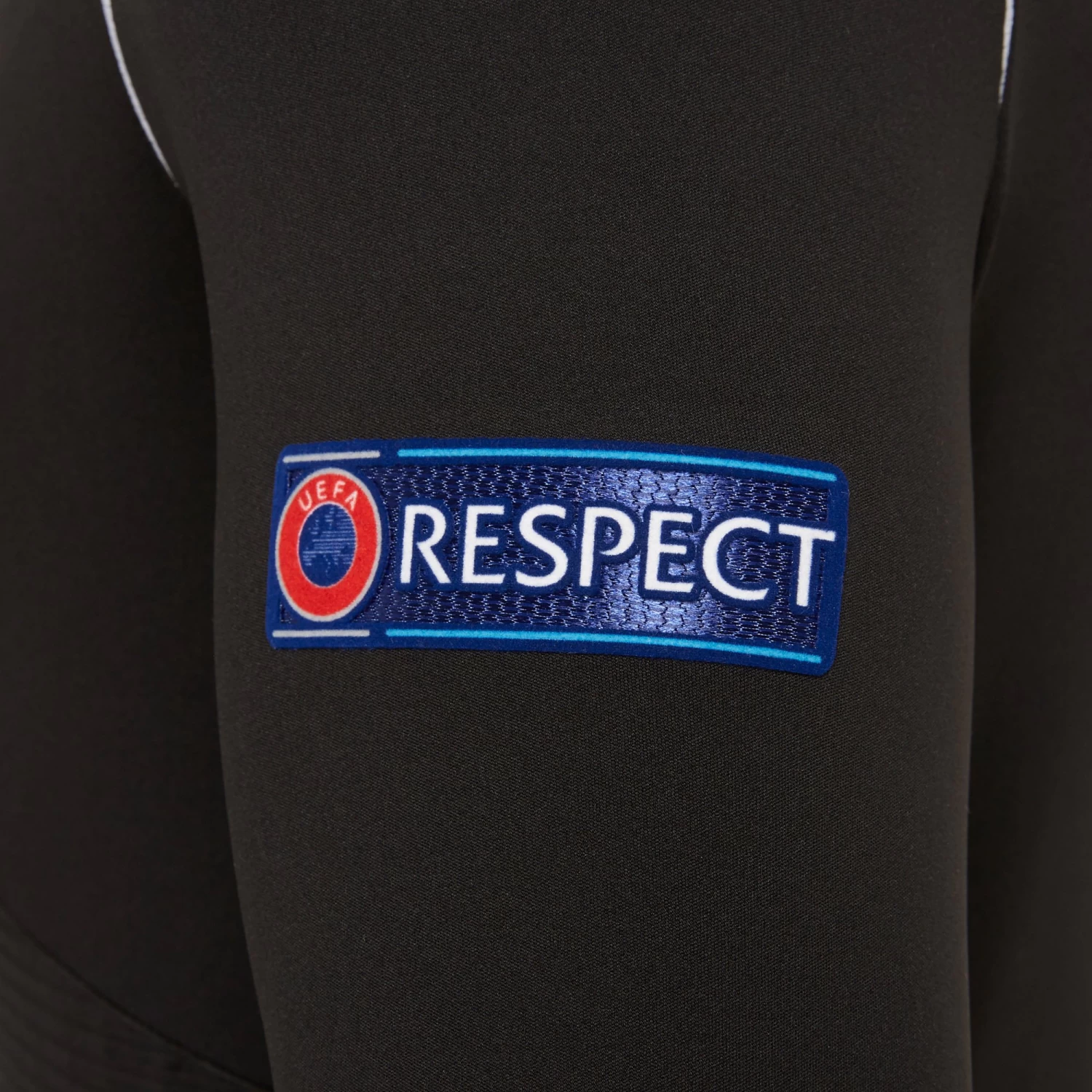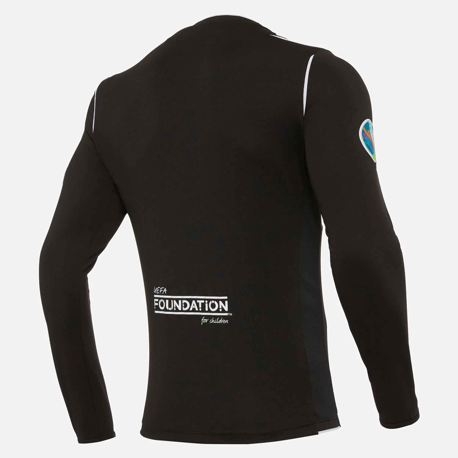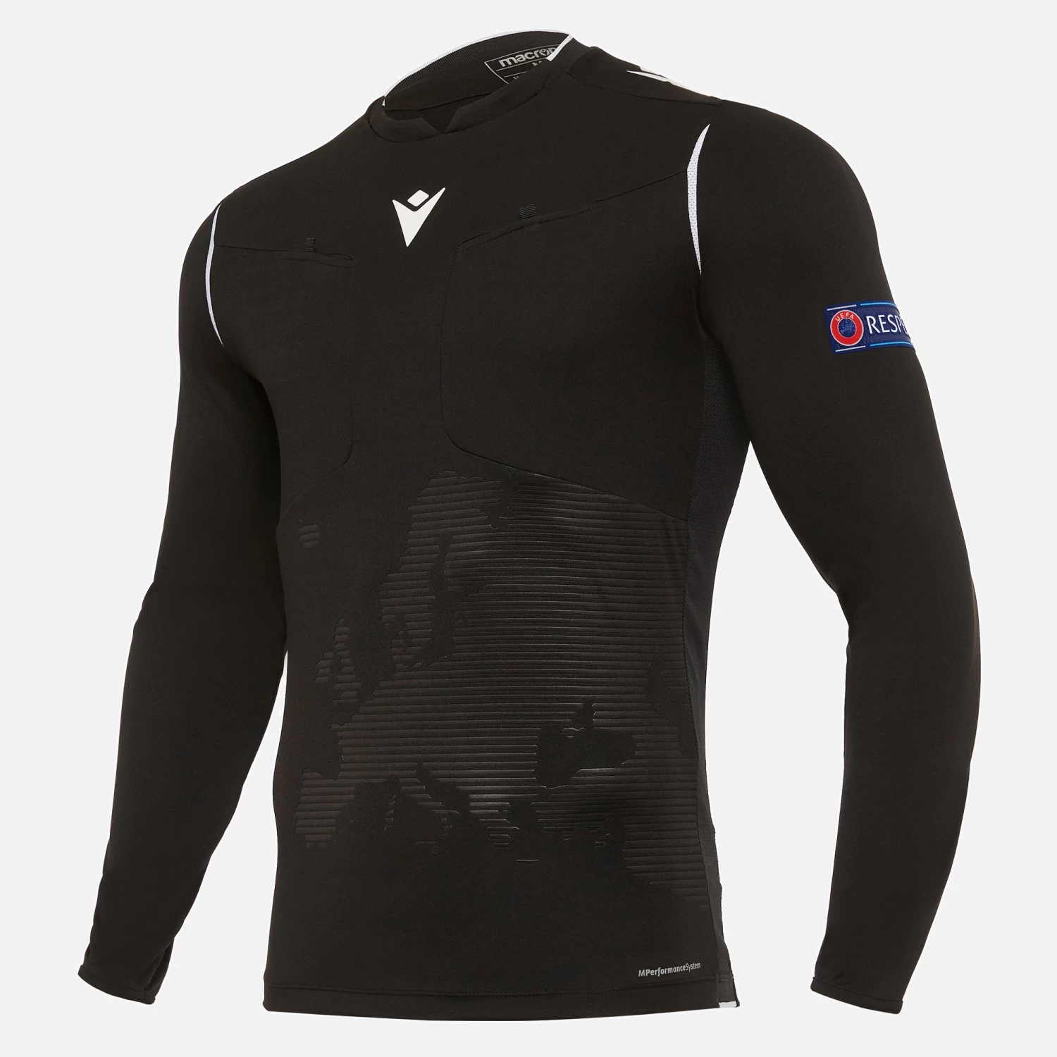 The new referee shirt created by Macron for UEFA is a winning combination of design and attention to details. In addition to the mesh inserts, each part of the shirt is made from different fabrics, which creates a varied design. This includes a soft pinstriped jacquard for the central front, softlock fabric on the sleeves and front pockets on the back. An embossed Europe graphic stands out on the chest, while on the back it is written in transfer UEFA FOUNDATION FOR CHILDREN. The word ‘Respect‘ stands out on the left arm. This is the UEFA campaign slogan against racial discrimination. On the right arm, instead, it features the official UEFA EURO 2020 patch.