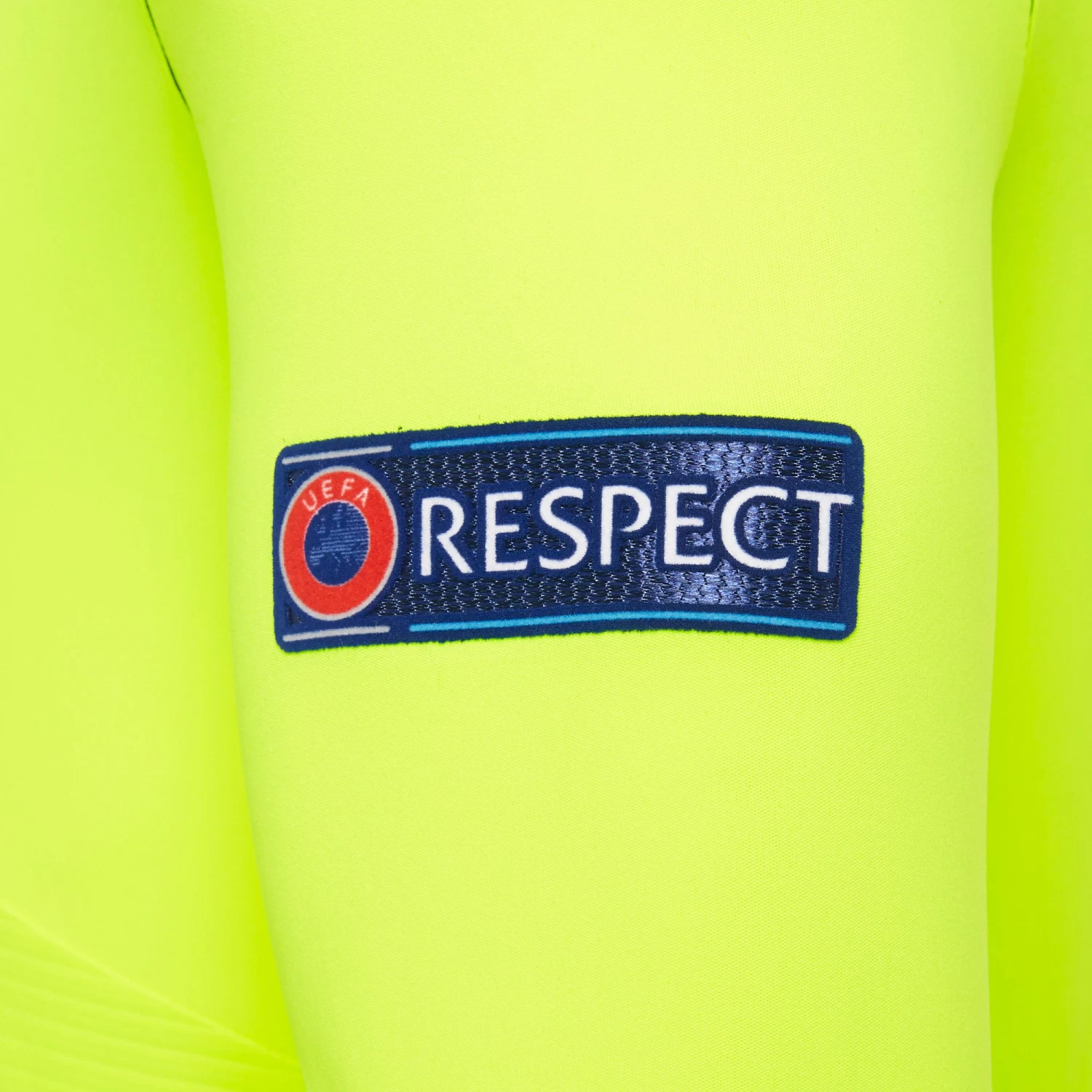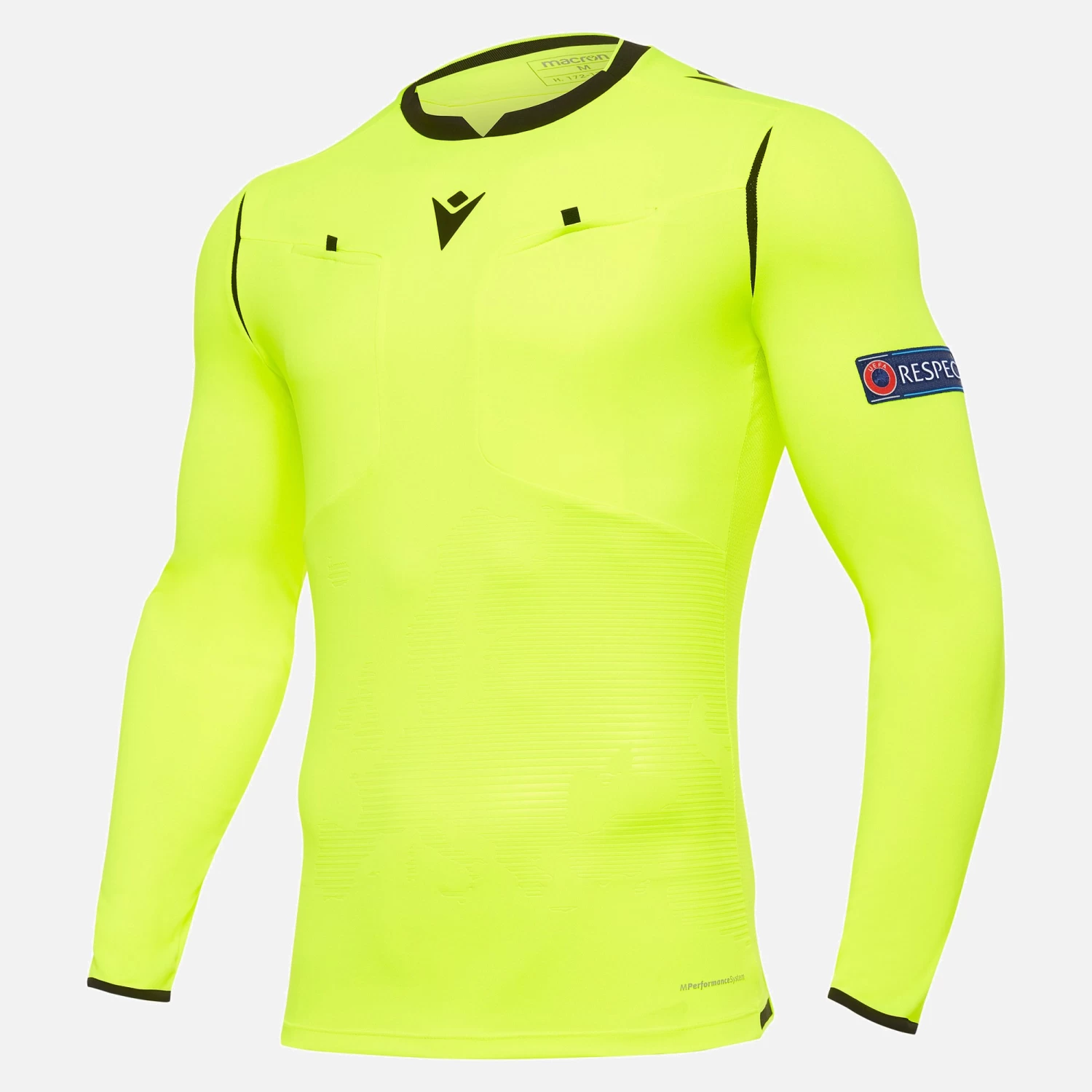 The new referee shirt created by Macron for UEFA is a winning combination of design and attention to details. In addition to the mesh inserts, each part of the shirt is made from different fabrics, which creates a varied design. This includes a soft pinstriped jacquard for the central front, softlock fabric on the sleeves and front pockets on the back. An embossed Europe graphic stands out on the chest, while on the back it is written in transfer UEFA FOUNDATION FOR CHILDREN. The word ‘Respect‘ stands out on the left arm. This is the UEFA campaign slogan against racial discrimination. On the right arm, instead, it features the official UEFA EURO 2020 patch.