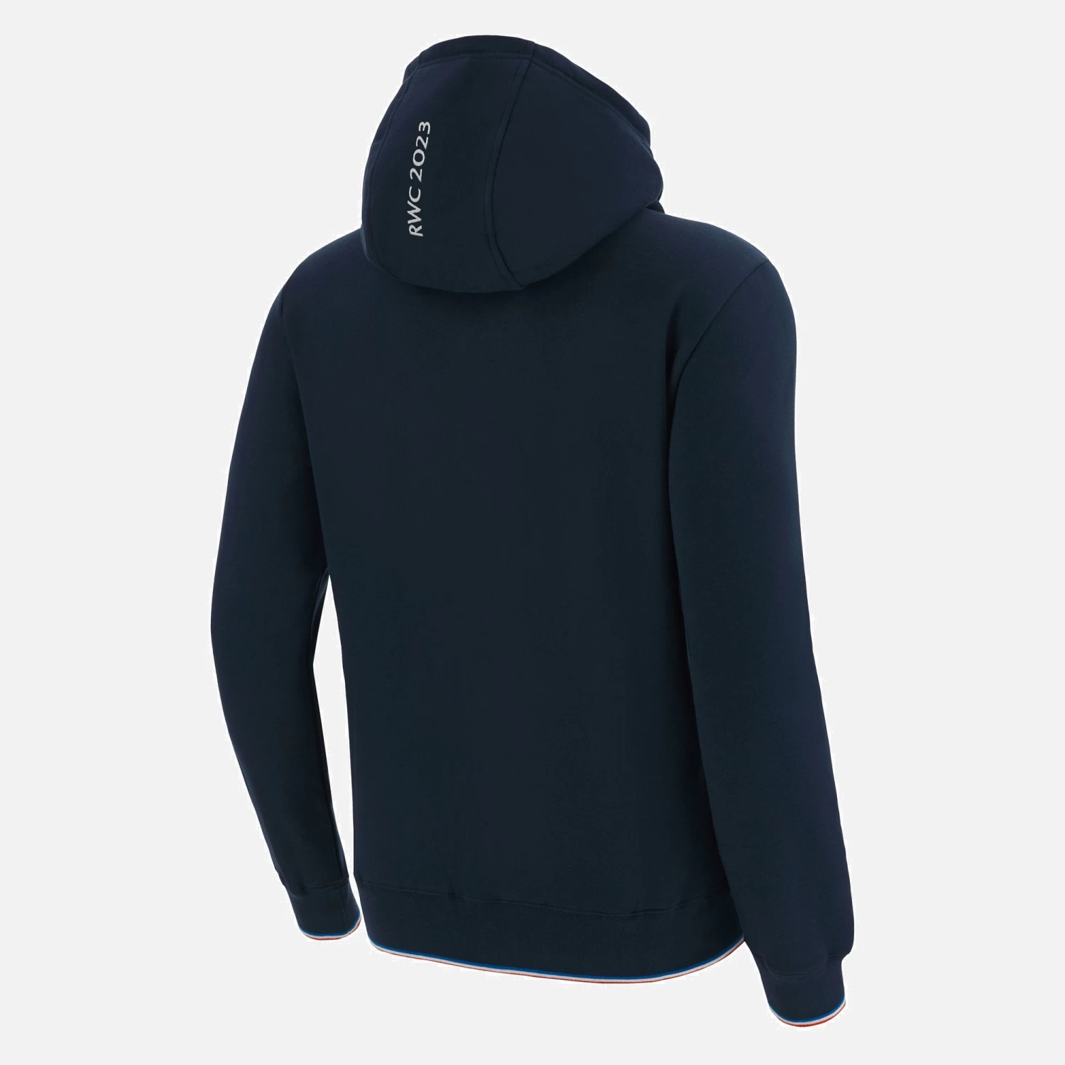 Ready to conquer the field, with style. Wear the Rugby World Cup France 2023 adults’ full zip cotton hooded sweatshirt. The event logo is embroidered on the left side, the Macron logo is embroidered on the right side.