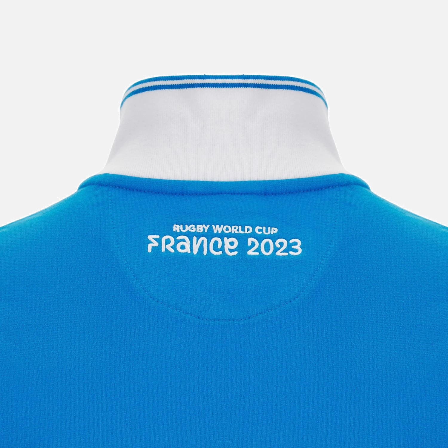 Ready to conquer the field, with style. Wear the Rugby World Cup France 2023 junior full zip cotton sweatshirt. The event logo is embroidered on the front, the Macron logo is embroidered on the right sleeve, the club logo is embroidered on the left front.