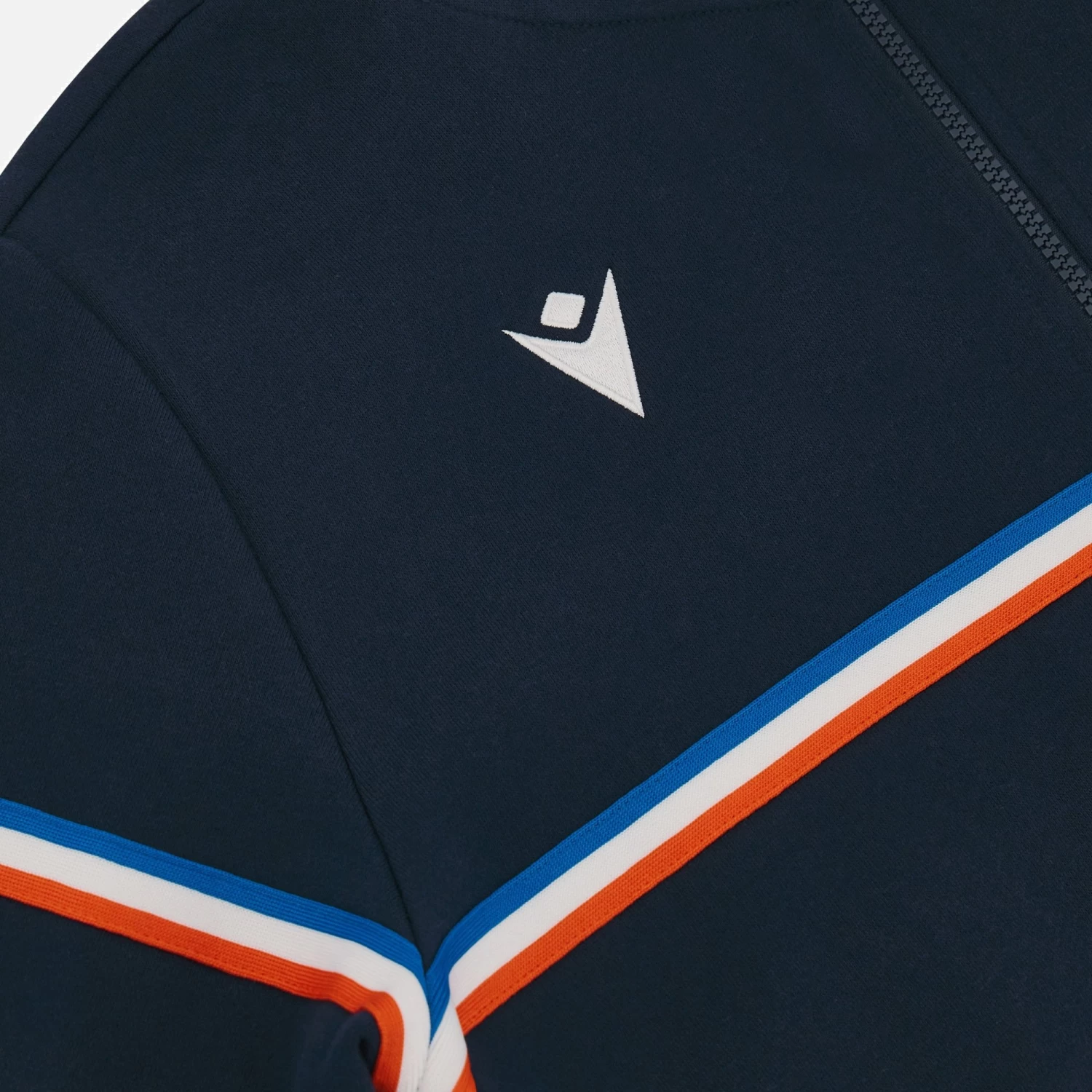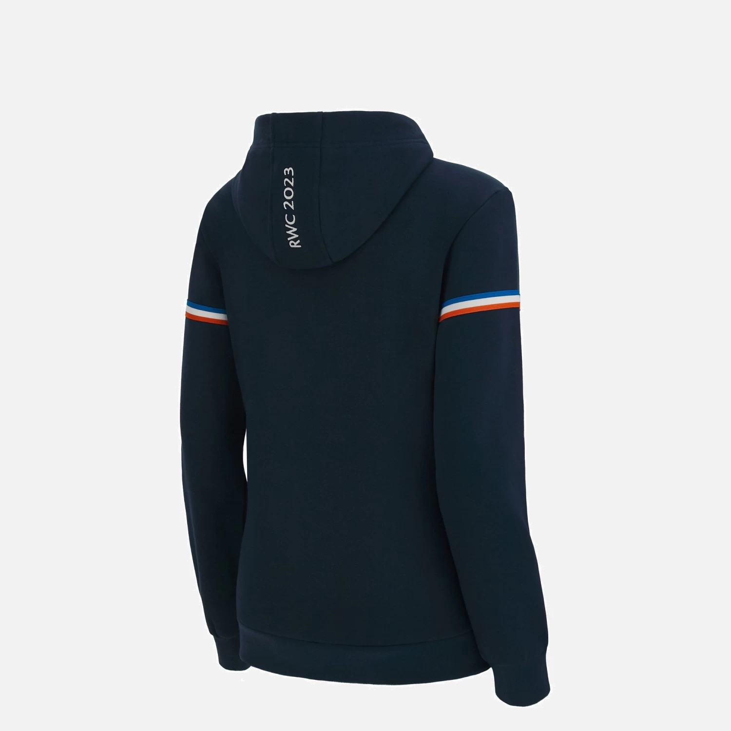 Ready to conquer the field, with style. Wear the Rugby World Cup France 2023 junior full zip cotton hooded sweatshirt. The event logo is embroidered on the left side, the Macron logo is embroidered on the right side.