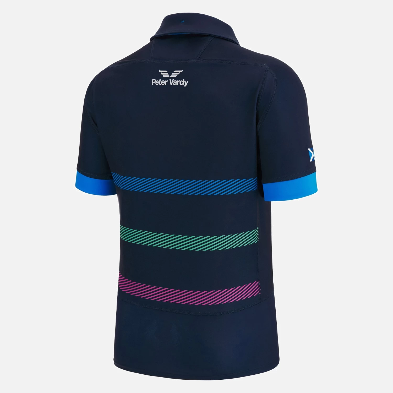 The Official Scotland Home 7s Replica Jersey. Navy shirt with blue, purple and green hoops, blue collars and cuffs and the Scottish Rugby Crest embroidered over the heart. This shirt is standard fit, with short sleeves and produced using polyester making it perfect for cheering on the squad from the stands.