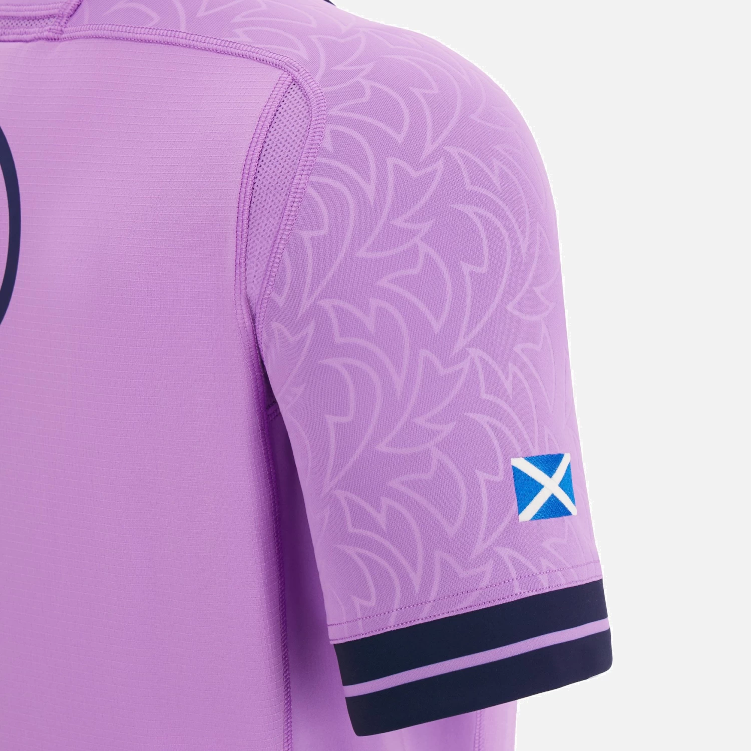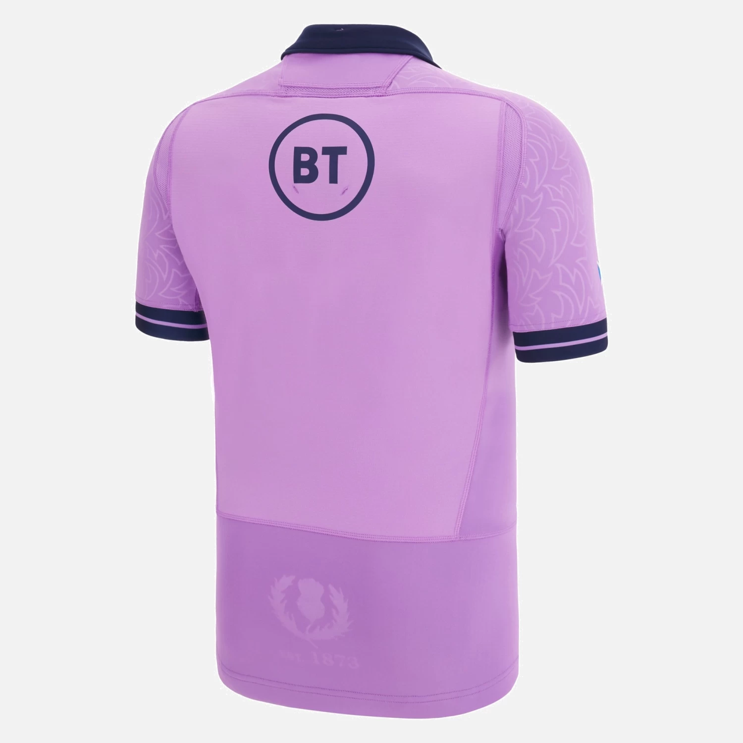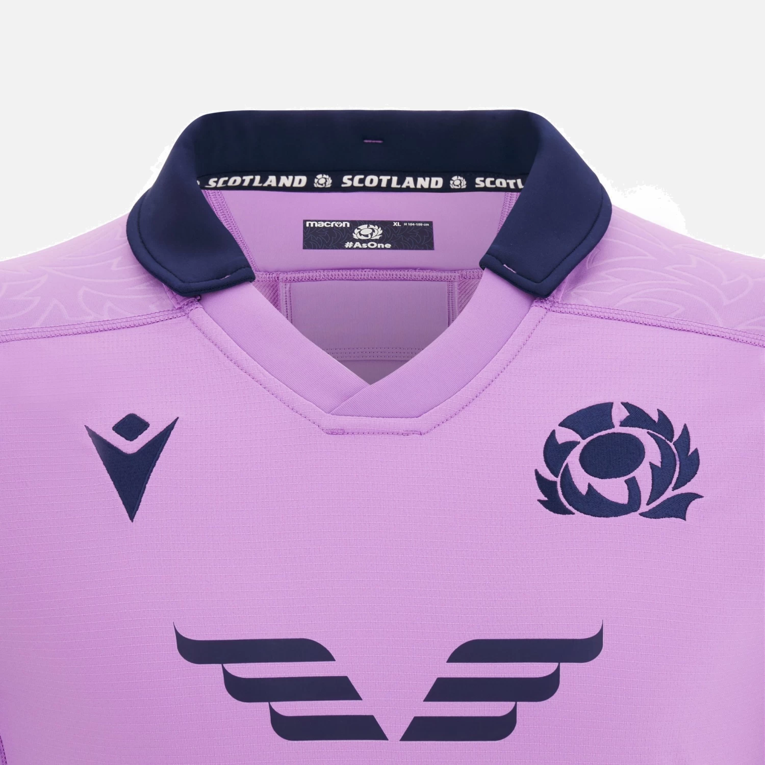 The Official Scottish Rugby Away Match Jersey for the 2022/23 season. Purple shirt with navy details on the collar and cuffs, outlines of thistle leaves embossed over the shoulders and the Scottish Rugby Crest embroidered over the heart. This slim fit jersey is constructed from Macron’s latest technical fabric making it lightweight yet extremely durable with badges embroidered across the chest, The reinforced stitching and GPS pouch make it perfect for either the pitch or the stands. PLEASE NOTE THIS GARMENT IS DESIGNED TO BE SKIN TIGHT – FOR A LOOSER FIT PLEASE SIZE UP.