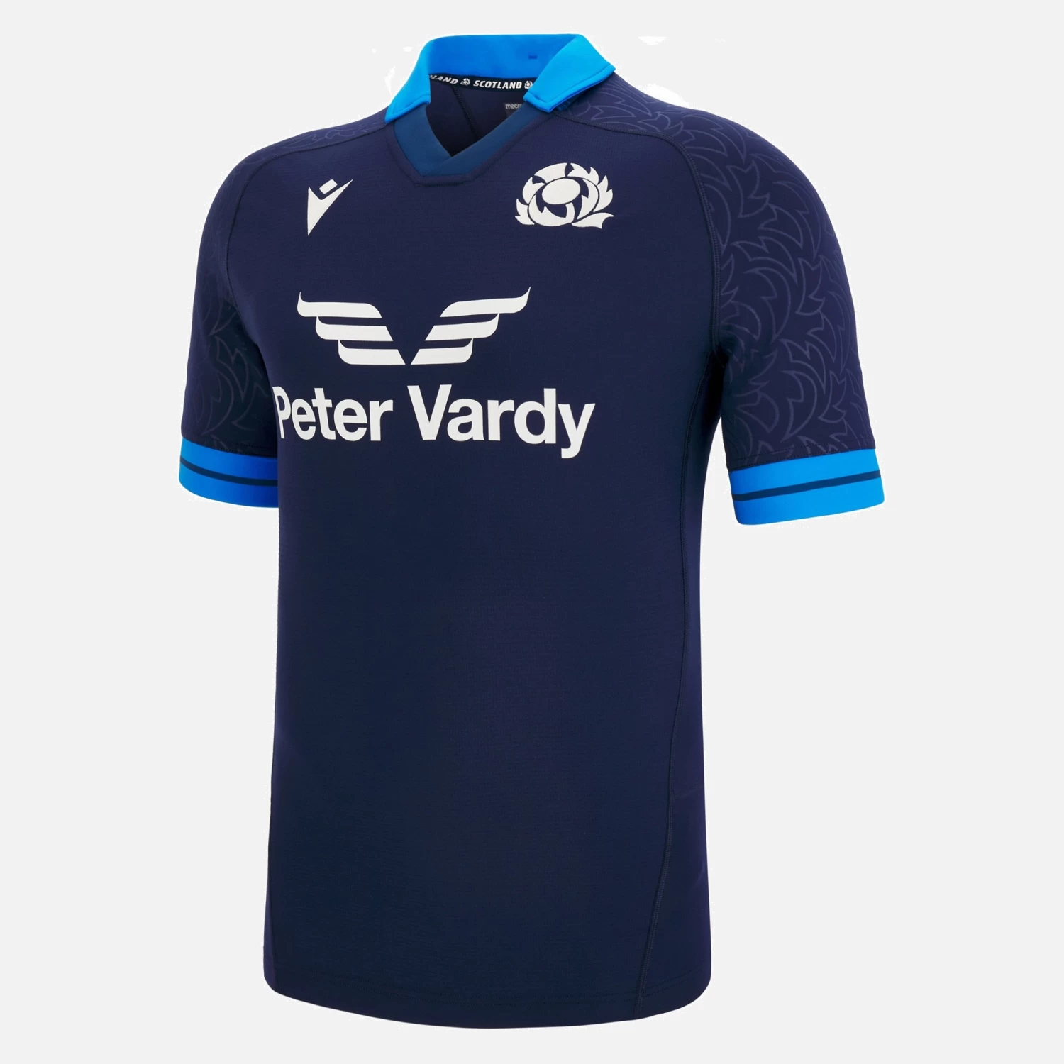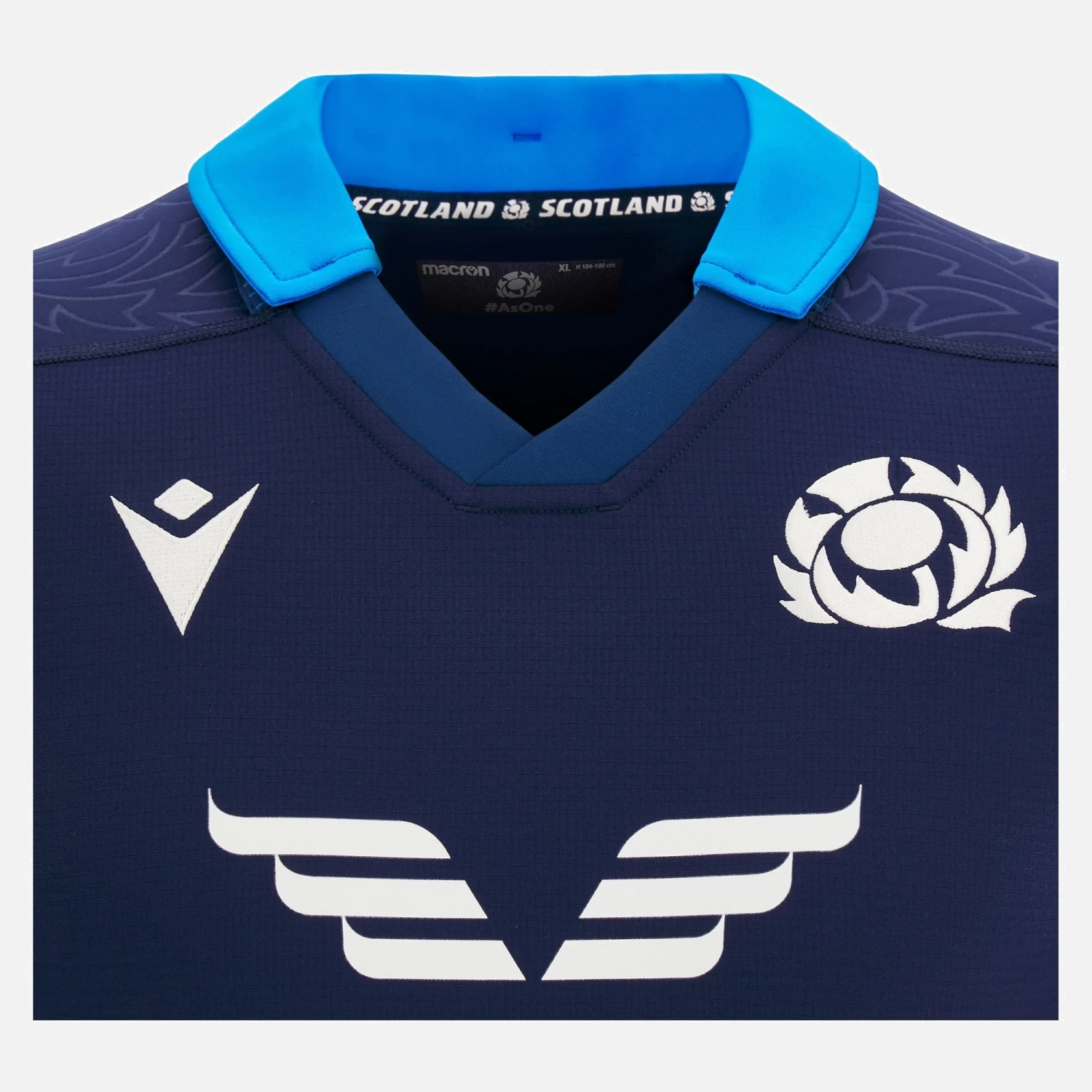 The Official Scottish Rugby Home Match Jersey for the 2022/23 season. Navy shirt with royal blue details on the collar and cuffs, outlines of thistle leaves embossed over the shoulders and the Scottish Rugby Crest embroidered over the heart. This slim fit jersey is constructed from Macron’s latest technical fabric making it lightweight yet extremely durable with badges embroidered across the chest, The reinforced stitching and GPS pouch make it perfect for either the pitch or the stands. PLEASE NOTE THIS GARMENT IS DESIGNED TO BE SKIN TIGHT – FOR A LOOSER FIT PLEASE SIZE UP.