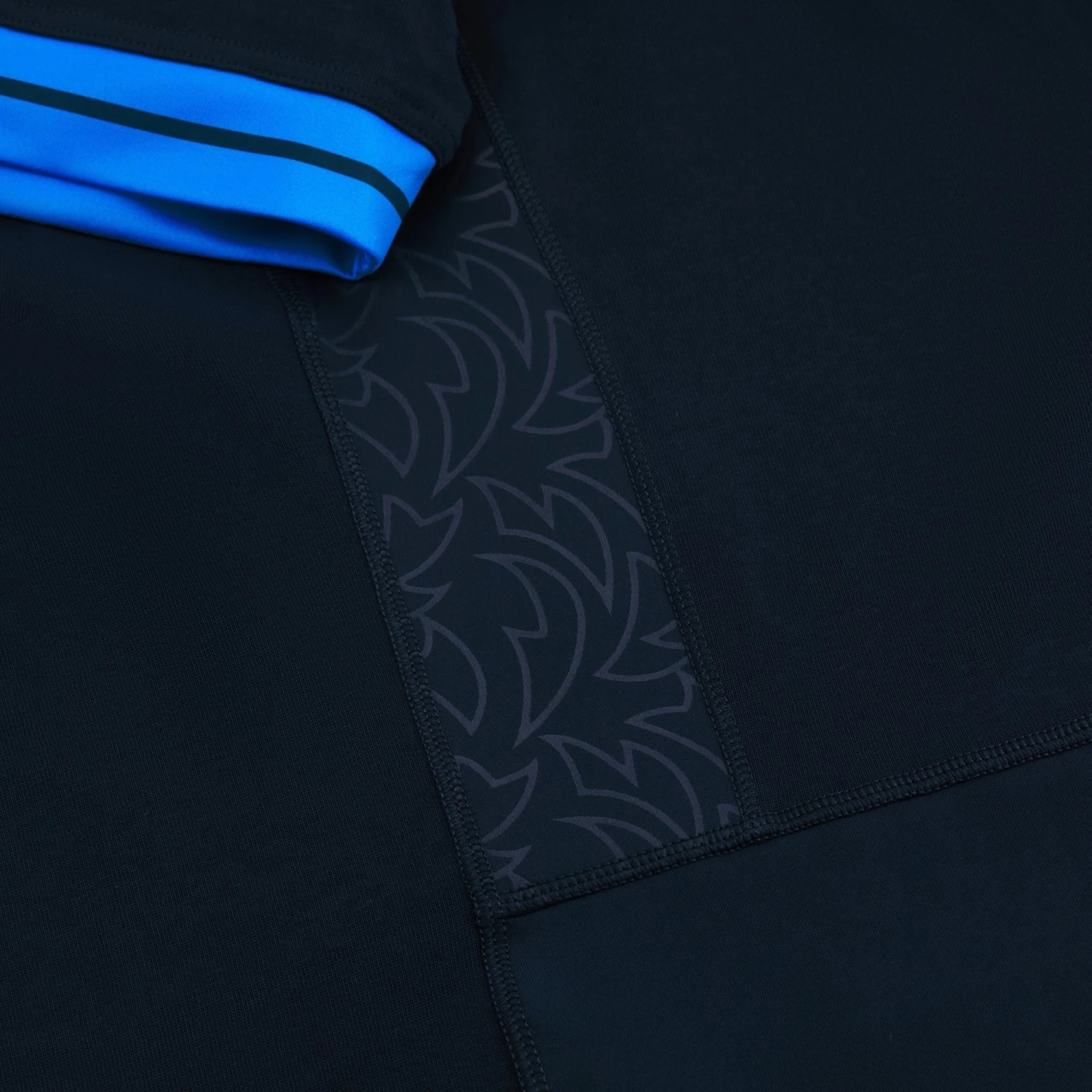 The Official Scottish Rugby Home Cotton Jersey for the 2022/23 season. Navy shirt with royal blue details on the collar and cuffs, outlines of thistle leaves embossed on the flanks and the Scottish Rugby Crest embroidered over the heart. This traditional style poly cotton jersey is loose fit with short sleeves for those that love the classic rugby shirt style.