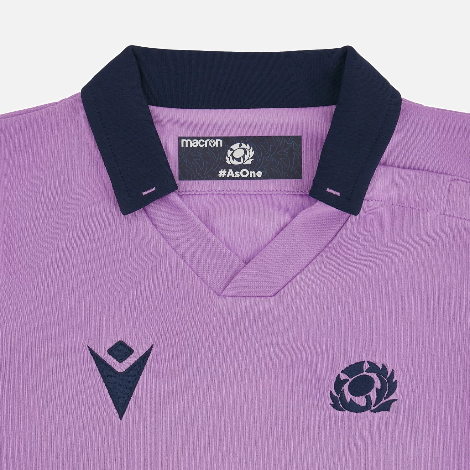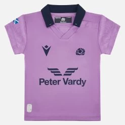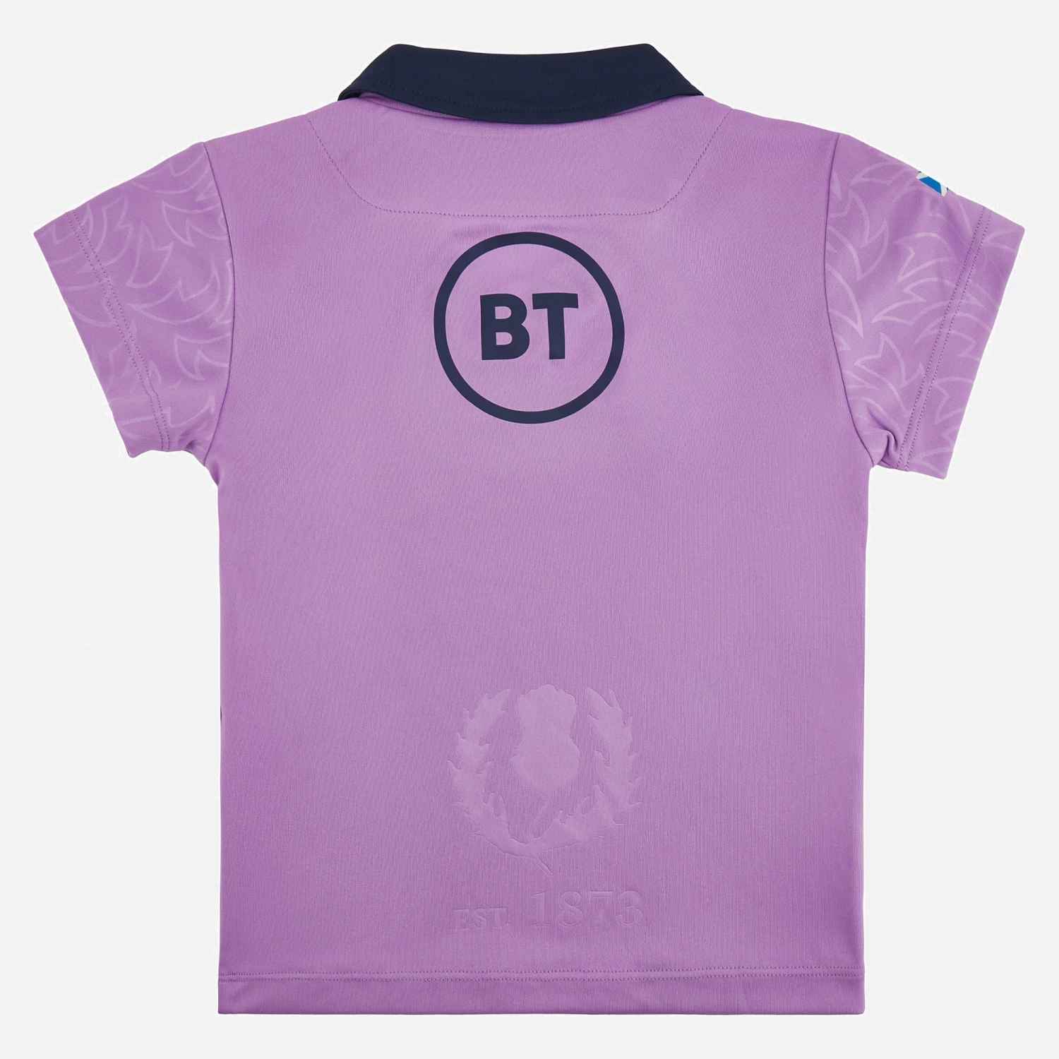 The Official Scottish Rugby Away Replica Jersey for the 2022/23 season. Purple shirt with navy details on the collar and cuffs, outlines of thistle leaves embossed over the shoulders and the Scottish Rugby Crest embroidered over the heart. This shirt is standard fit, with short sleeves and produced using polyester making it perfect for cheering on the squad from the stands.