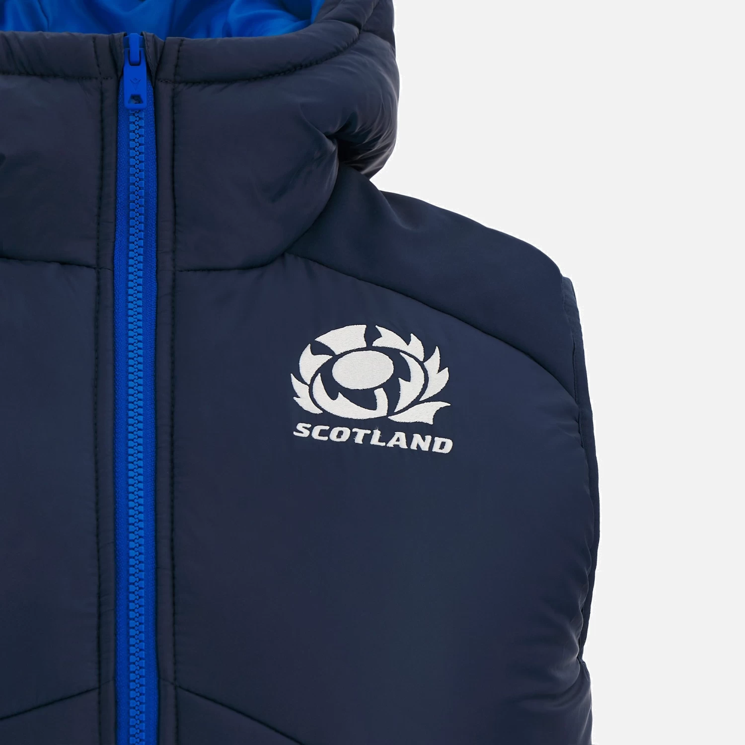 Navy padded gilet with blue zips and embroidered Scotland crest.