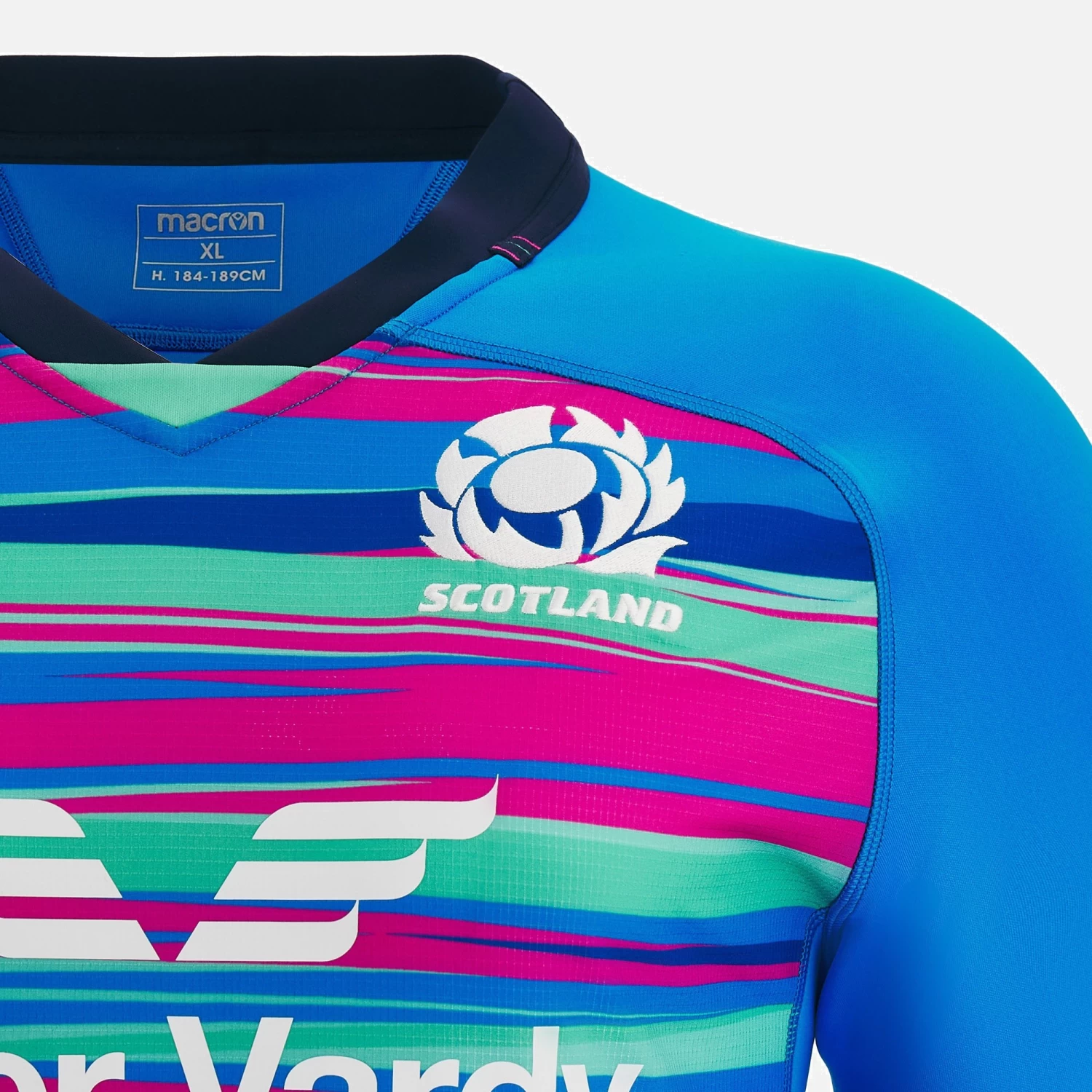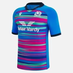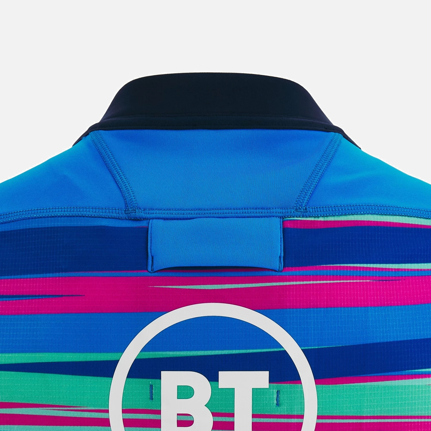 Royal blue slim fit training shirt with ‘painted’ multicoloured stripes over the body, navy cuffs and collar and embroidered Scotland crest.