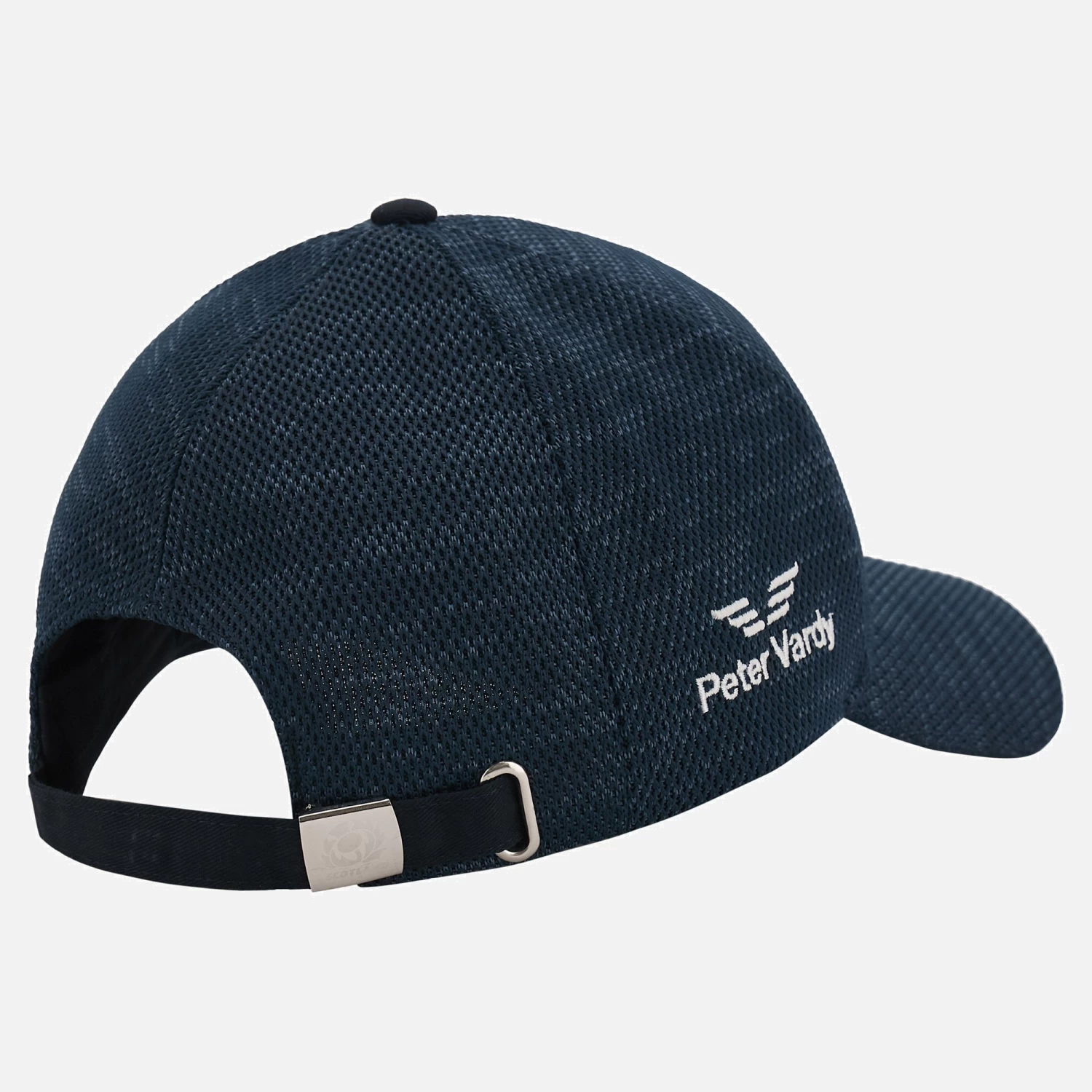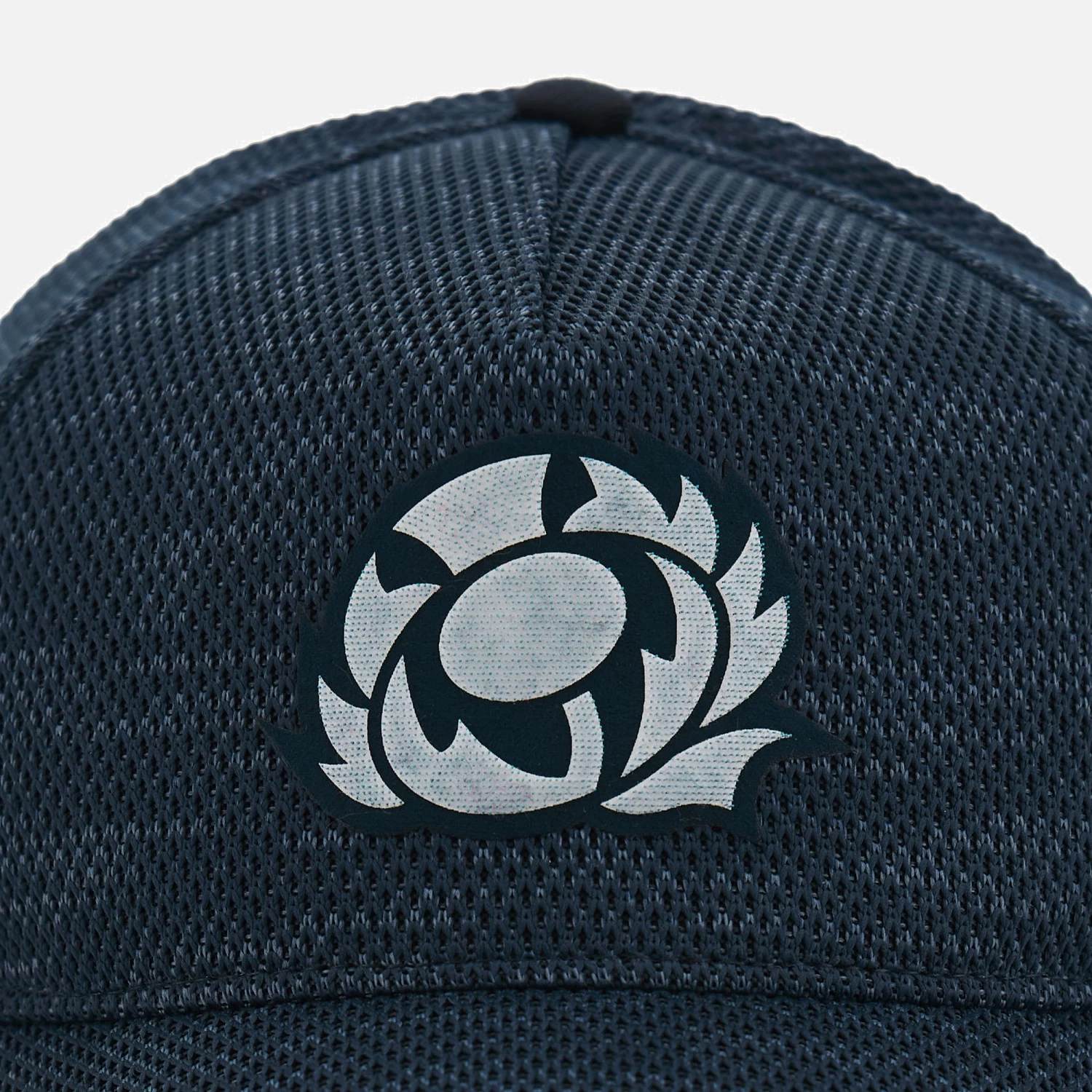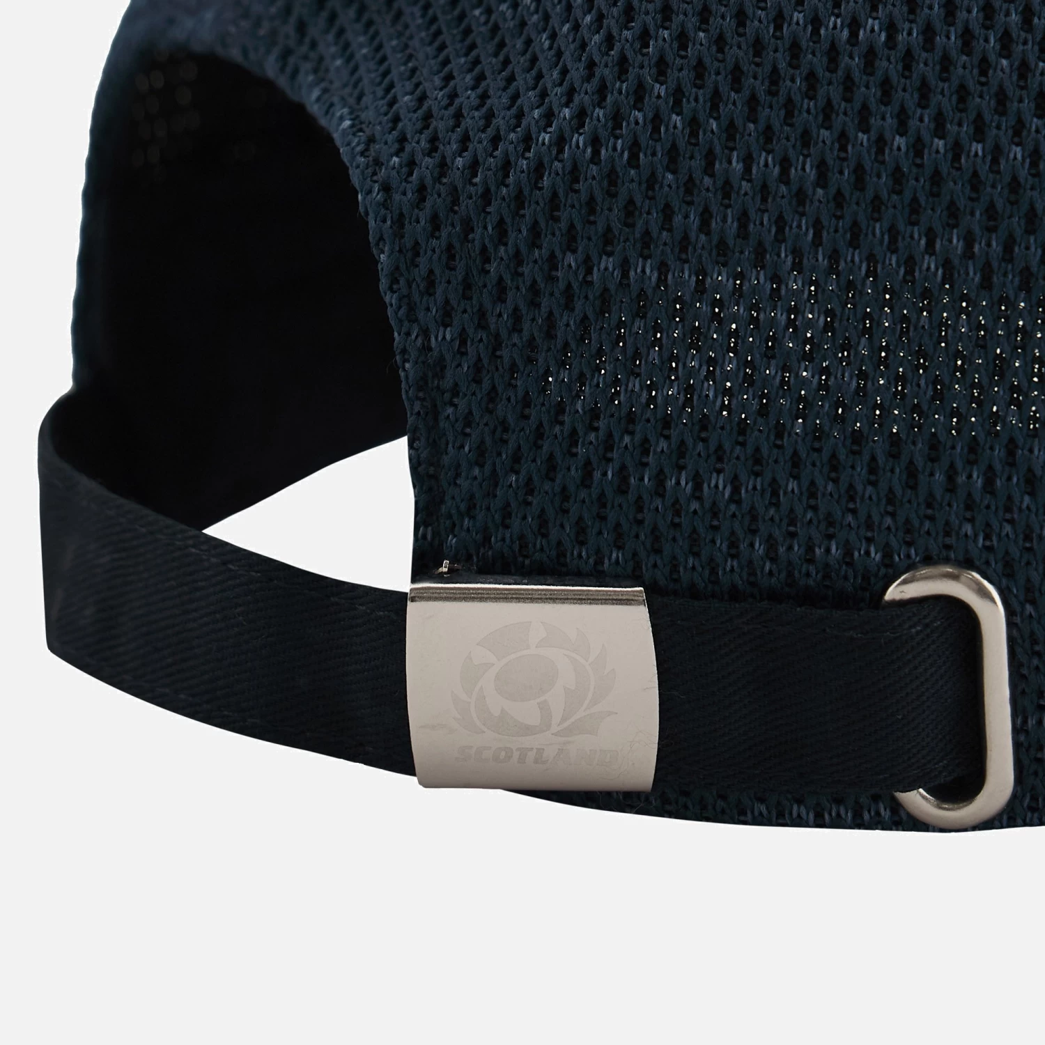 Navy marl baseball cap with ‘toothbrush’ effect transfer Scotland crest and adjustable metal fastener.