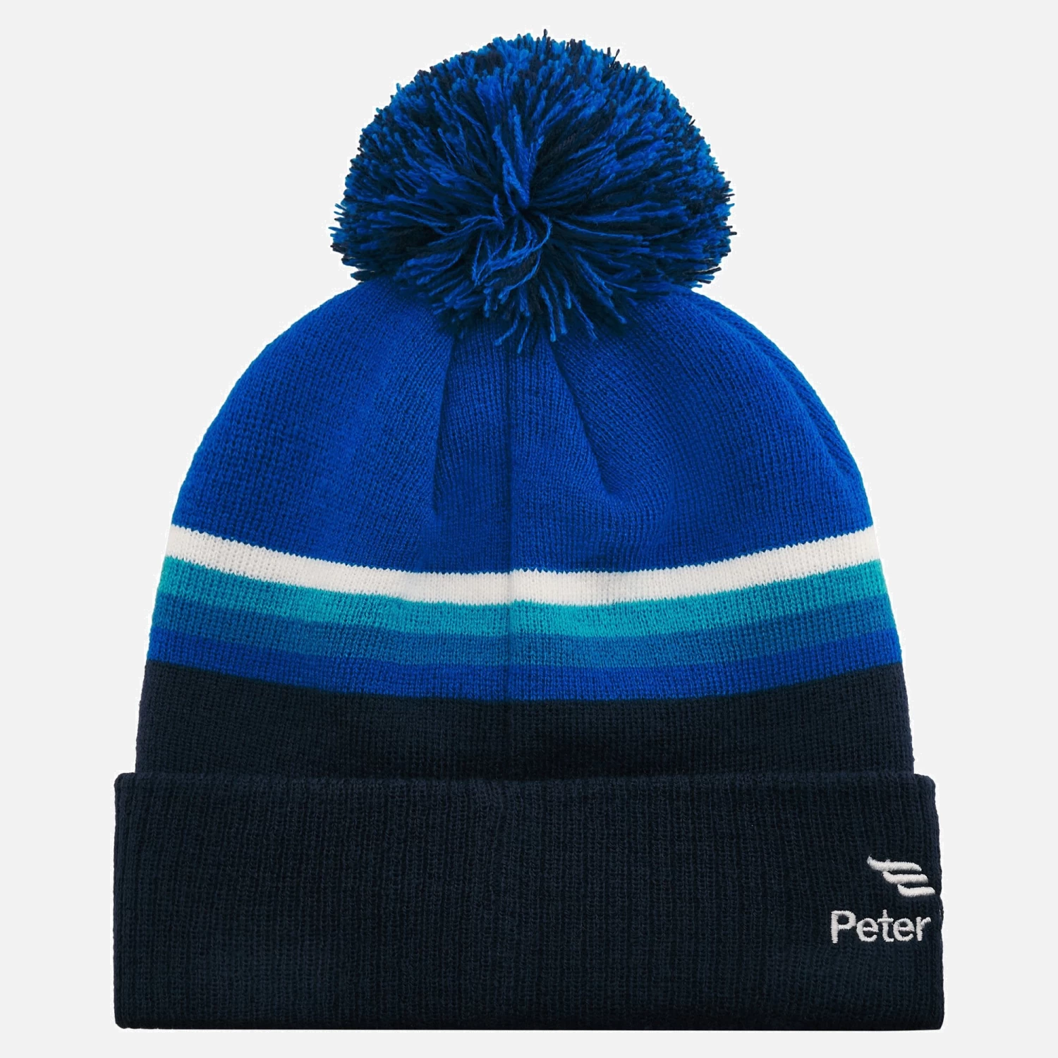 Navy and royal blue pom pom beanie with blue ‘ fade’ design and 3D embroidered Scotland crest.
