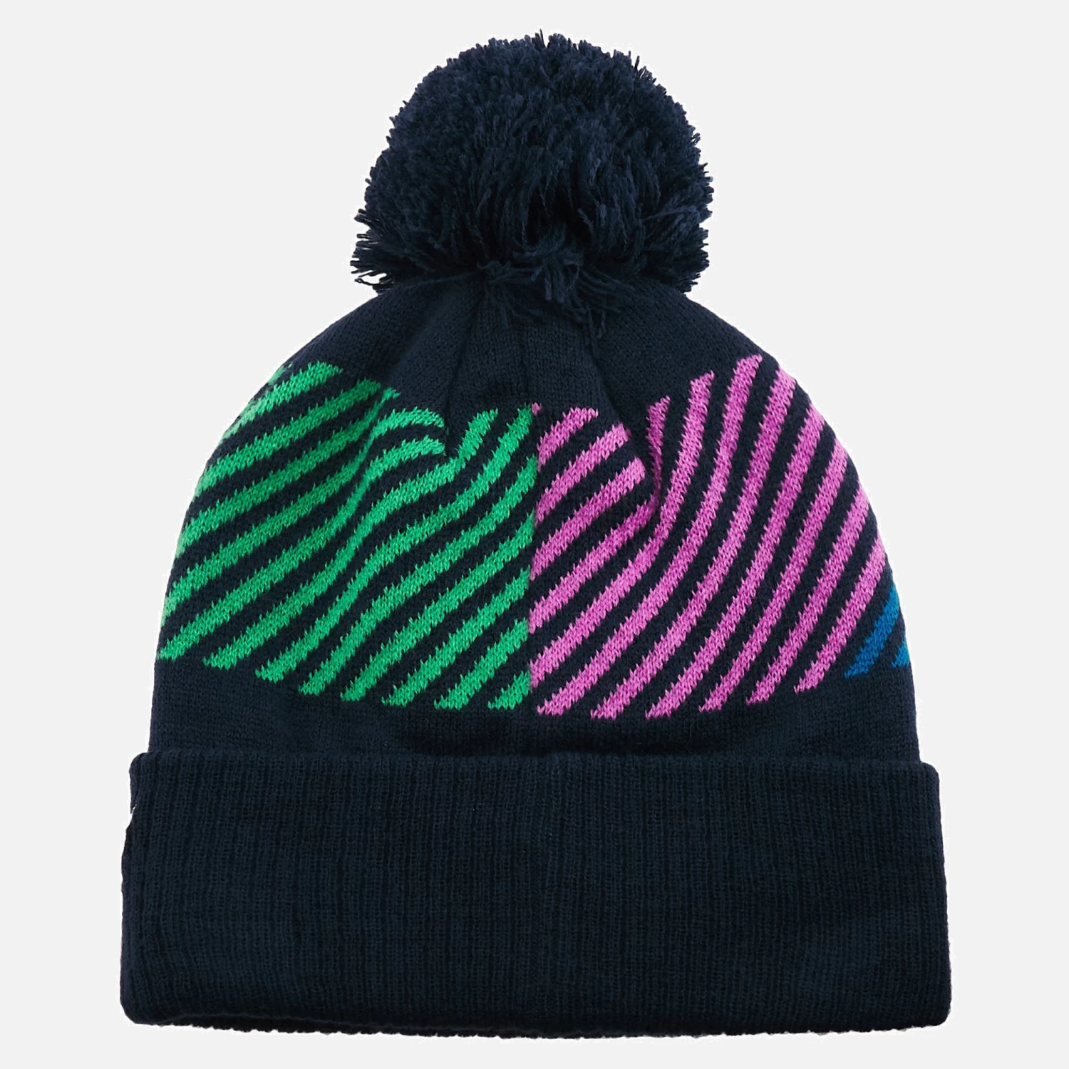Navy pom pom beanie with purple, blue and green striped design and 3D embroidered Scotland crest.