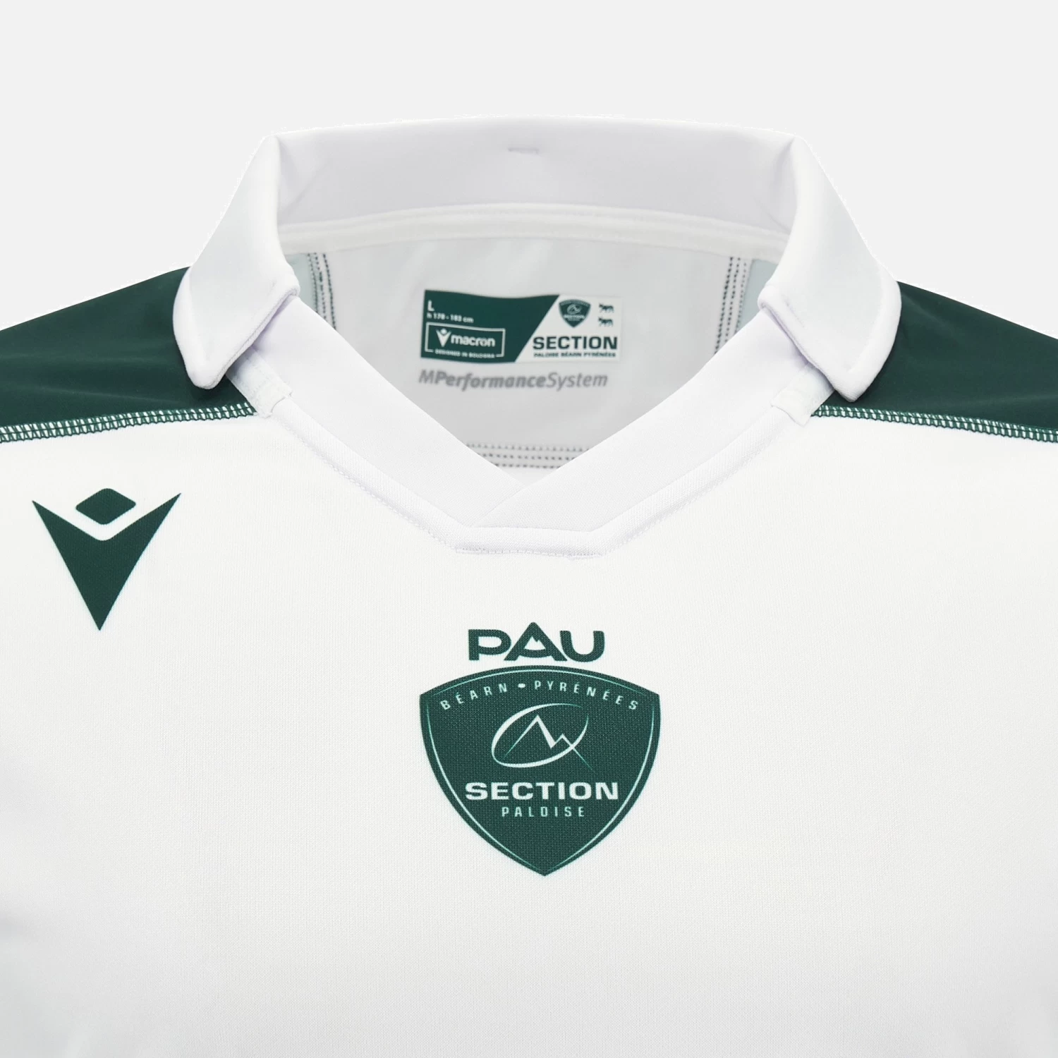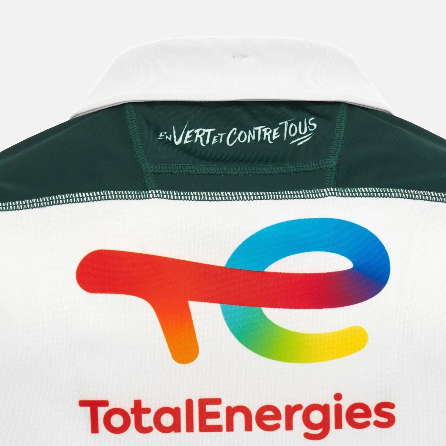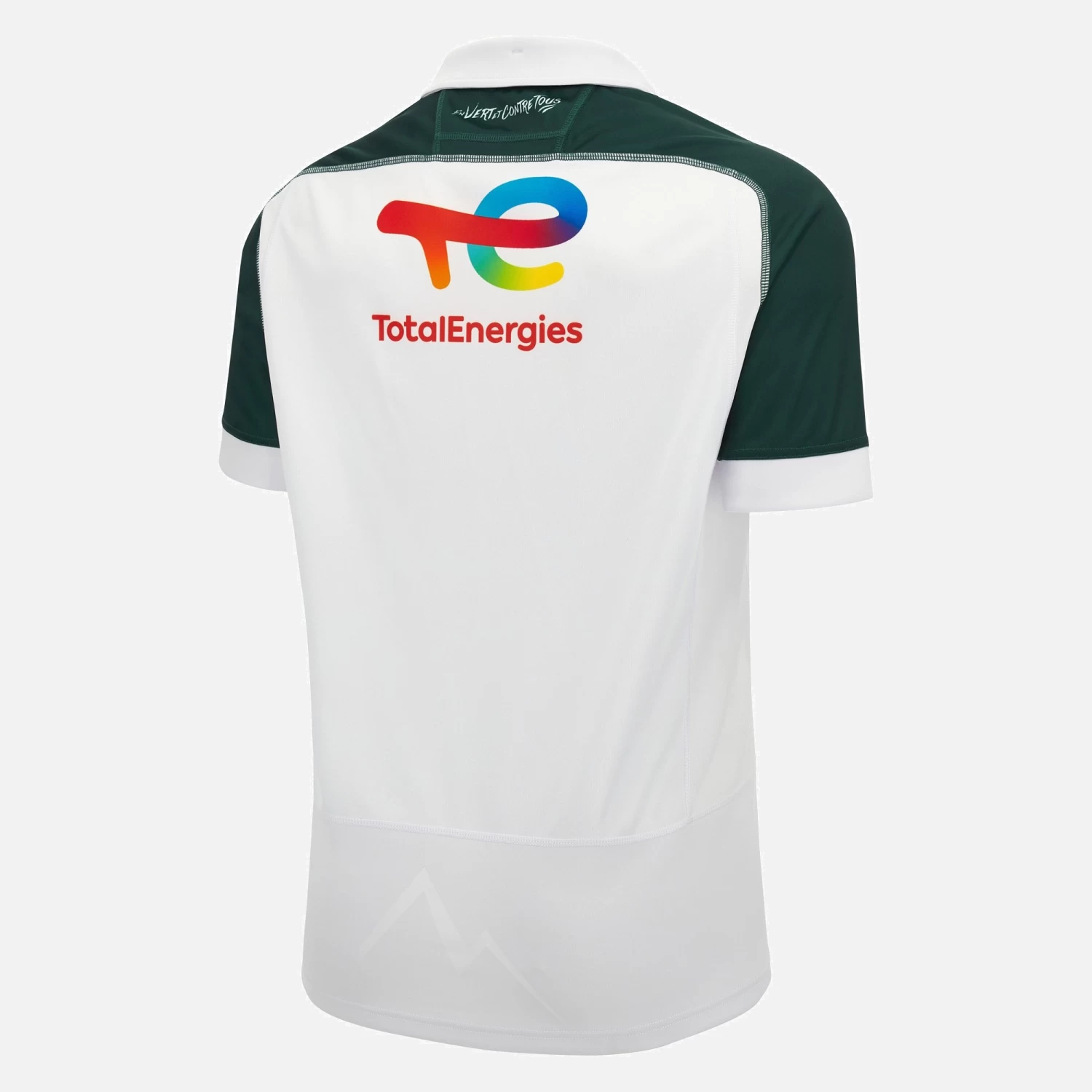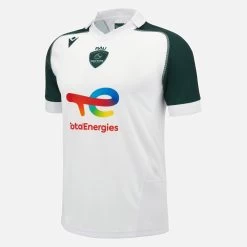 The club colours prevail in the Section Paloise away shirt for the 2023/24 season. The garment is white all over on both front and back, with only the sleeve cuffs and polo shirt colour in shades of green. It features embossed graphics and the club badge on the centre of the chest. Simple and traditional, the jersey is further embellished with the wording ‘EN VERT ET CONTRE TOUS’ below the back of the collar.