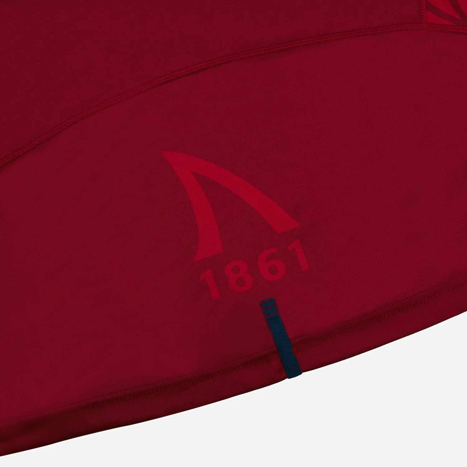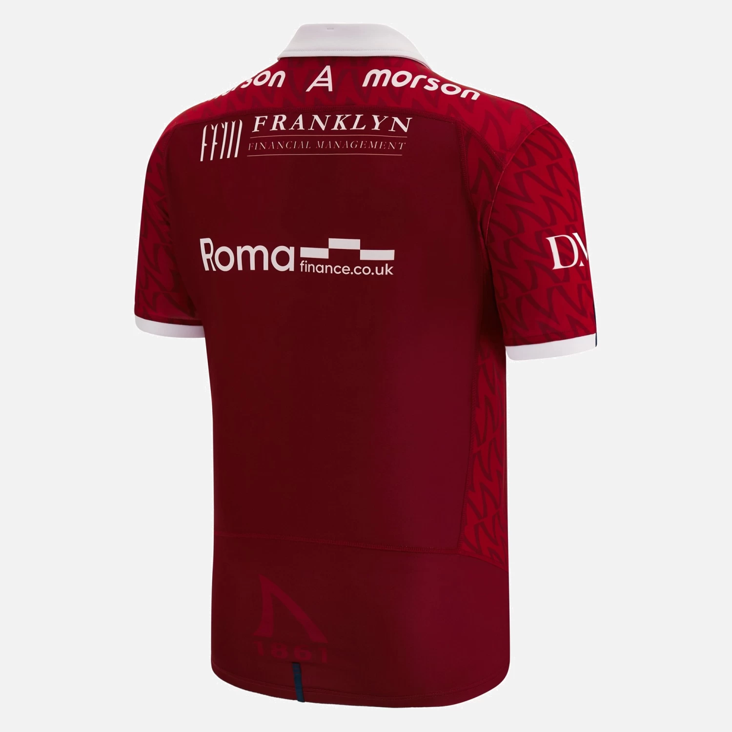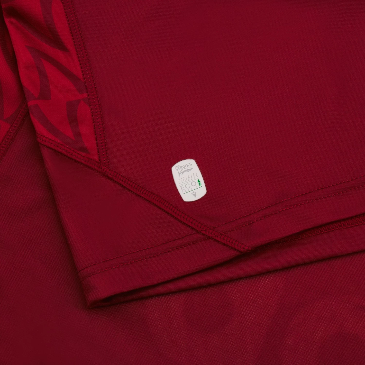 The Official Sale Sharks Away Replica Jersey for the 2022/23 season. Dark red shirt with white collar and cuffs, tone on tone ‘fin’ pattern embossed over the shoulders and white club badge over the heart. This shirt is standard fit, with short sleeves and produced using polyester making it perfect for cheering on the squad from the stands.