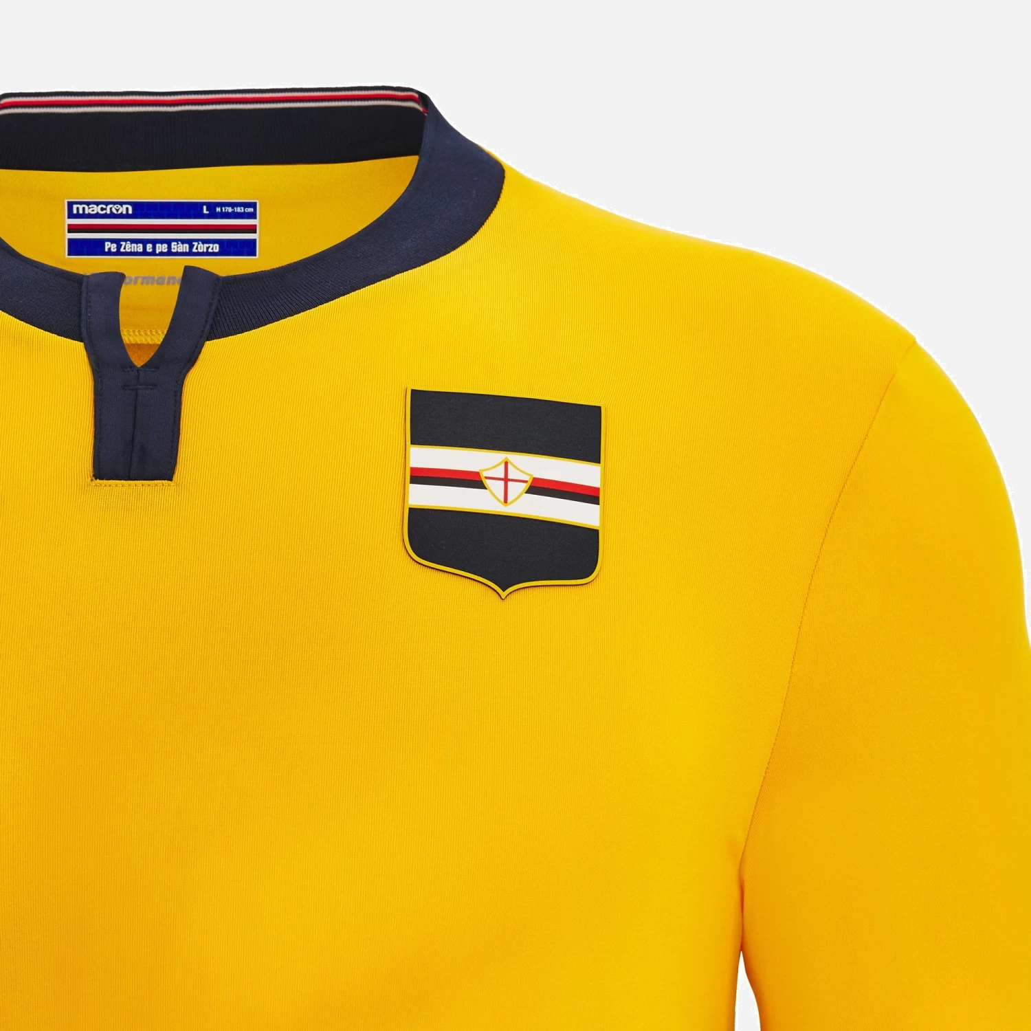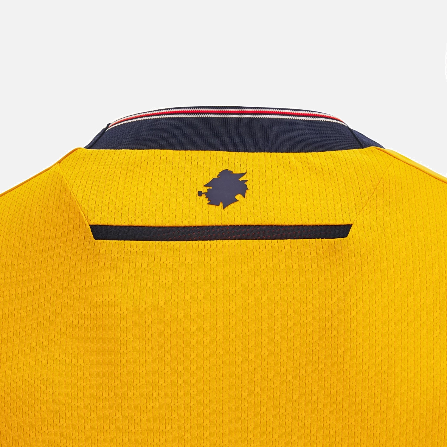 The UC Sampdoria third match jersey for 2022/23 comes in an amber colour with a classic panel insert featuring the blucerchiata band revisited in black, red and white. The centre of the band features an HD badge of the St. George’s cross. The back of the collar displays a tone-on-tone extra-thick print that reads Genova 12 Agosto 1946, the year the club was founded. The inside back collar, meanwhile, includes the blucerchiata band and the Genoese dialect phrase Pe Zena e pe Sàn Zòrzo.