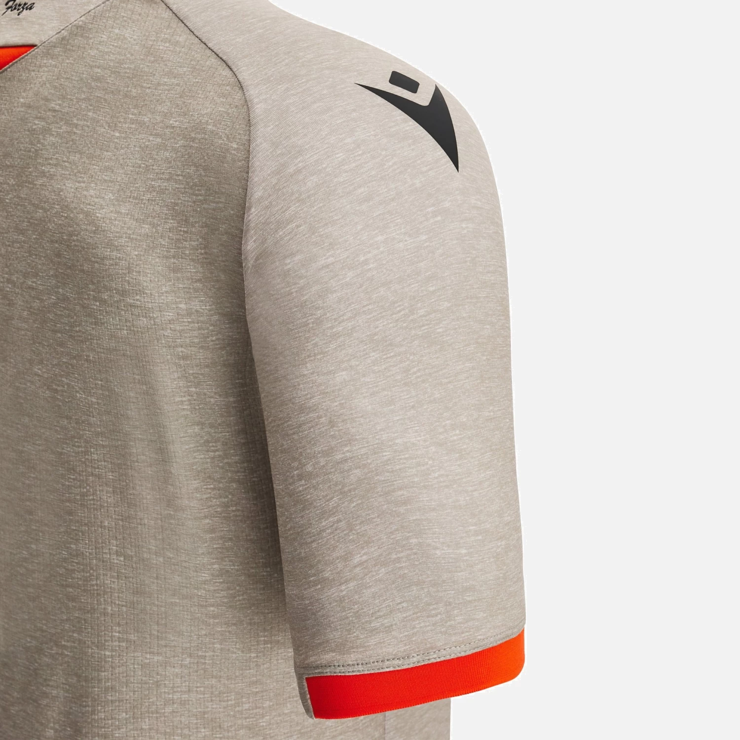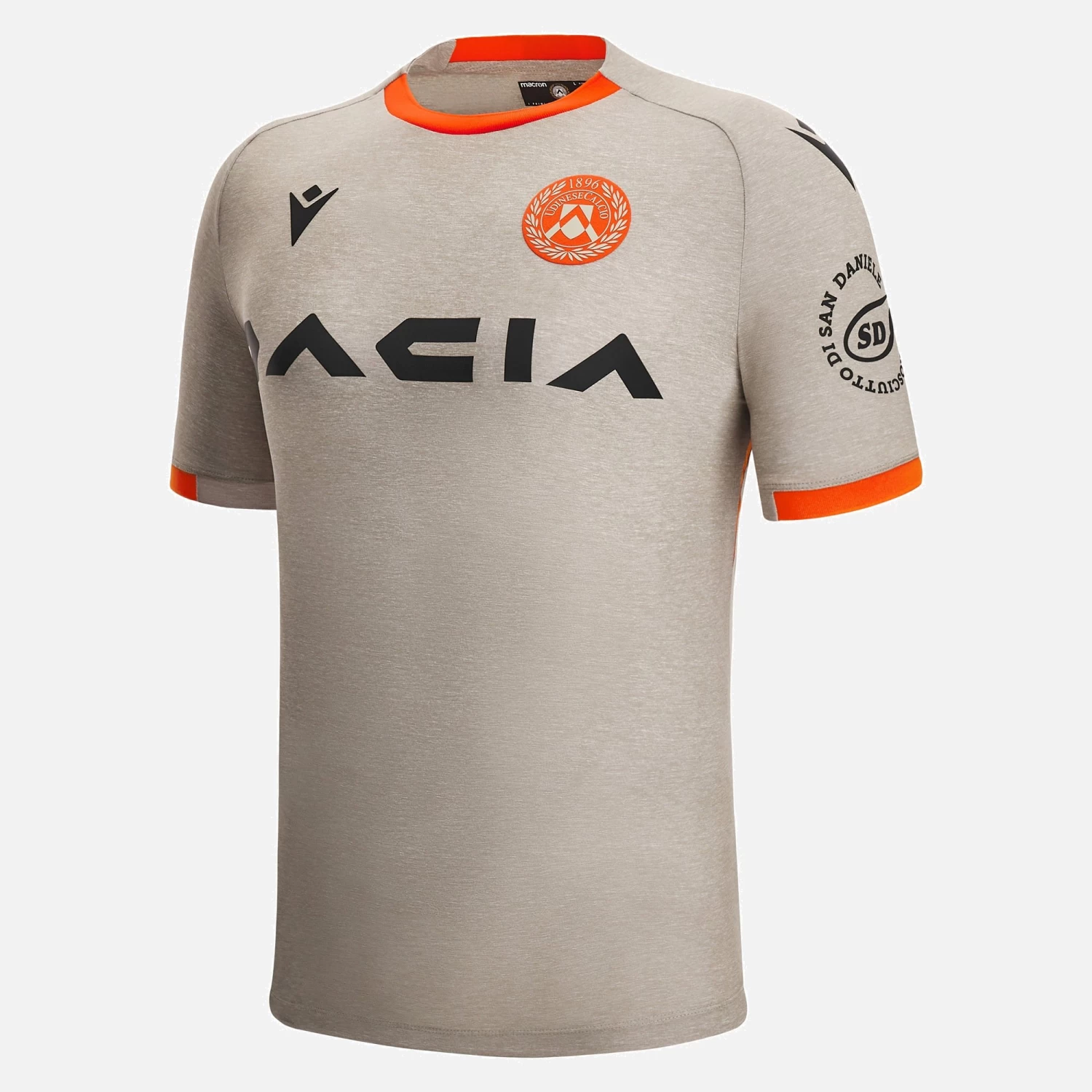 The Udinese Calcio 2022/23 third match shirt features a beige melange effect pattern complemented by orange detailing. The all-over melange effect appears on both the front and back. The motto of the Friuli-based club, LA PASSIONE È LA NOSTRA FORZA, is embroidered on the back of the collar.
