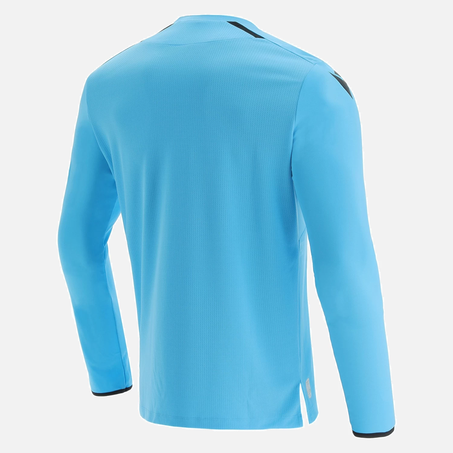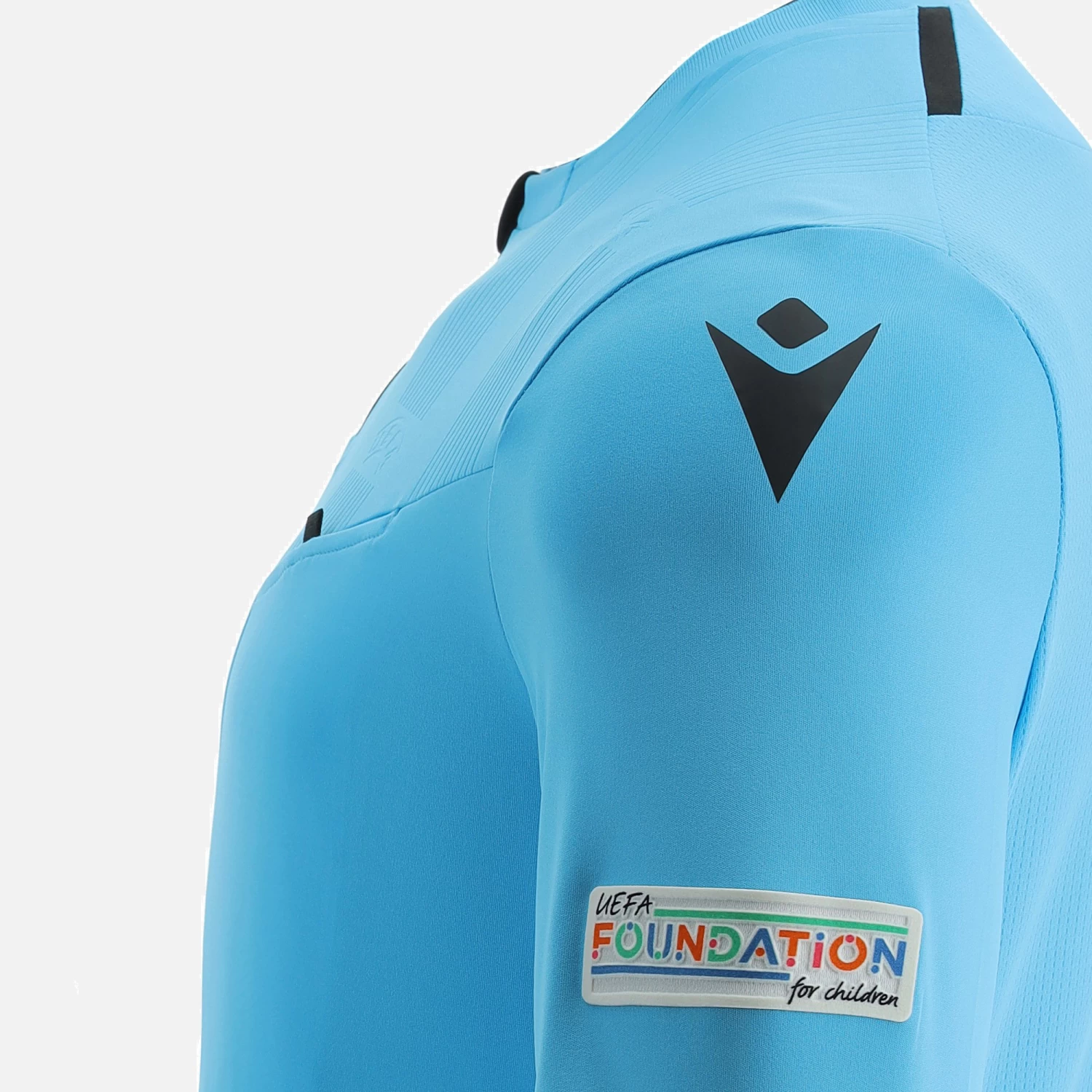 The new referee long-sleeved shirt produced by Macron for UEFA comes in neon blue for a striking design. Featuring an embossed pinstripe design, the shirt is embellished with 2 large front pockets with velcro closure and the wording ‘Uefa Foundation’ on the left arm.
